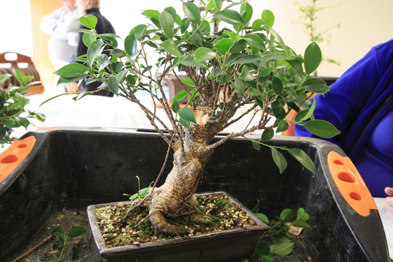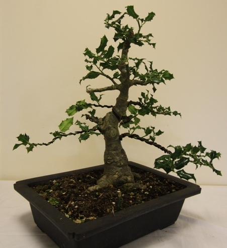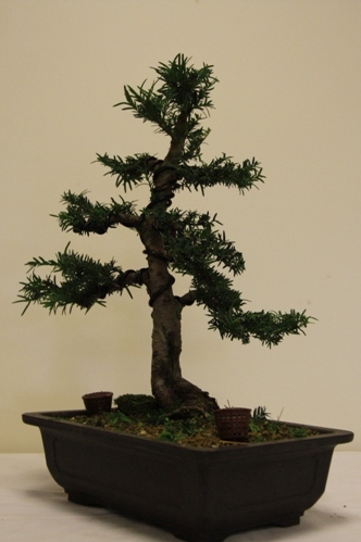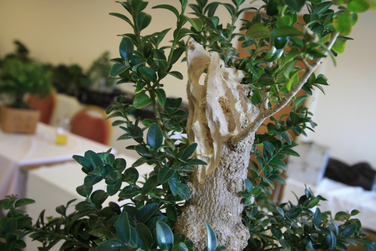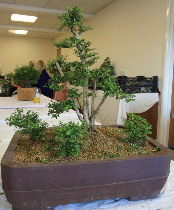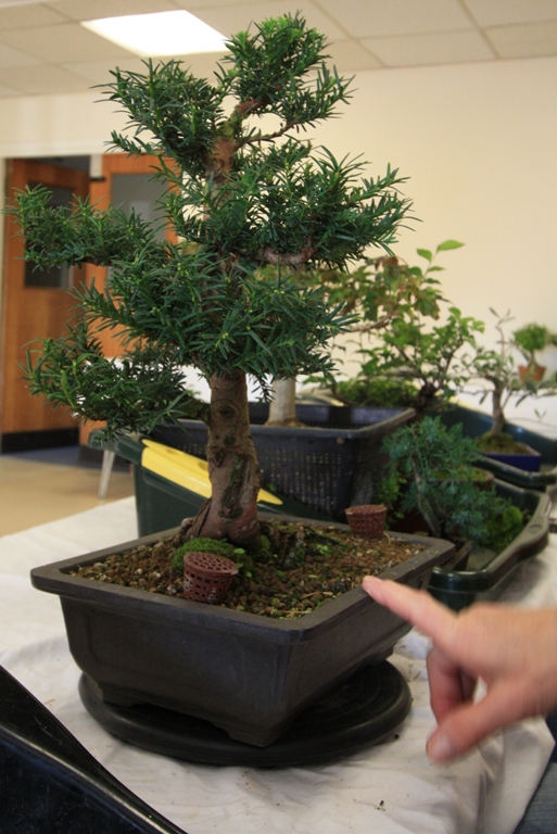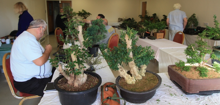 A range of tree species were worked upon by Club Members including an Olive, Chinese Elms, Junipers, Spruce, English Yew, Trident Maple, Bougainvillea, Chinese Privet, Quince, Pistachio, Holly, Lonicera, and Box. Lee did some carving on a group of three Box which had great trunks and will over time become a great group bonsai and then worked with Paul H to prune the crowns. Paul B wired his Holly and got some ideas for his Juniper. David discussed the next steps for his Elm which has a great trunk and fabulous bark. Sally worked on her English Yew and repositioned the branches using wire and the lowest branch was removed to aid with the overall design.