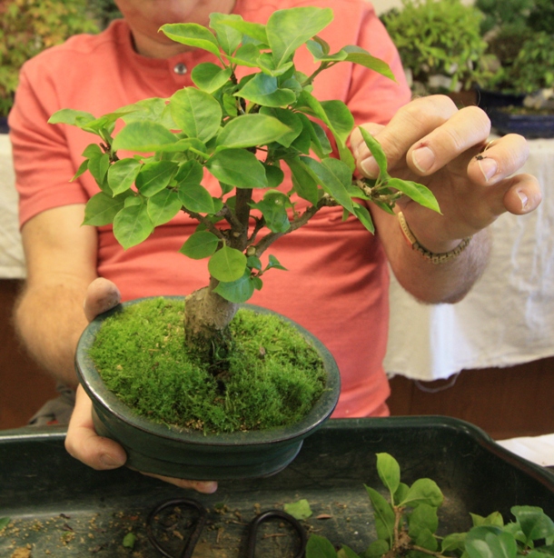 I found the workshop extremely useful as I had bought along some of my Taiwan Figs to work on. I have tended on these two trees to only prune the new growth at this stage to reduce the leaf size which has been good. It has also helped to produce a more compact crown, as well as maintain a high level of vigour in the trees. However, I had not addressed the overall styling and structure of these Fig trees and one of them had two main leaders which conflicted with one another. Lee advised that in order to develop this tree, that one of the leaders should be removed, and to retain the leader with the most taper. Furthermore, that I should then wire down some of the side branches to form a better overall branch line and crown shape, as Figs naturally tend to have a very upright branching habit. The end result was very pleasing and I hope that it will now back bud and grow on to fill in the space created as the wiring has allowed for more light to the branches.