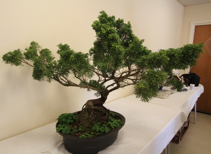 We also asked Lee for his views on one of the Club trees which Paul kindly brought along, the Juniper and we discussed what were the next steps now that the tree was in better health. Many suggestions were run through but the consensus was to reduce the overall size of the Juniper down to a more compact form by raising up using clamps and wire the branch with the most natural taper and shape to it as well as creating a cascade with another lower branch. We also discussed re-potting and re-positioning of the tree within the pot to provide a better overall design to the trunk lines. At this stage no work was carried out on the tree, and the final design will be decided once all the Club members have had the opportunity to provide their ideas.