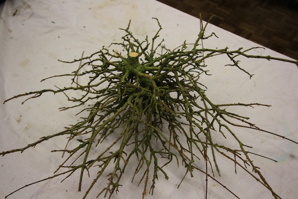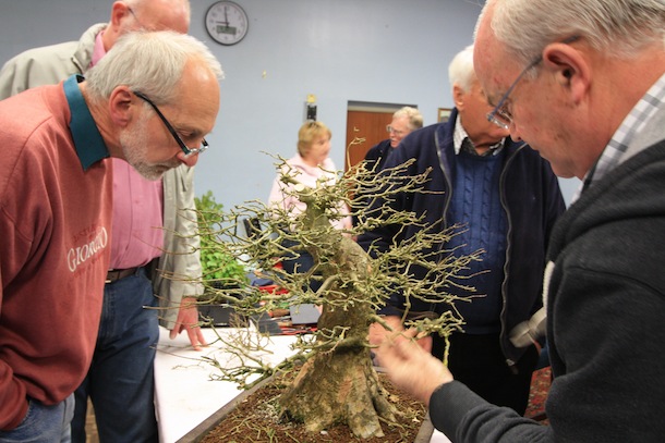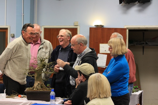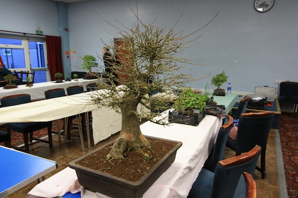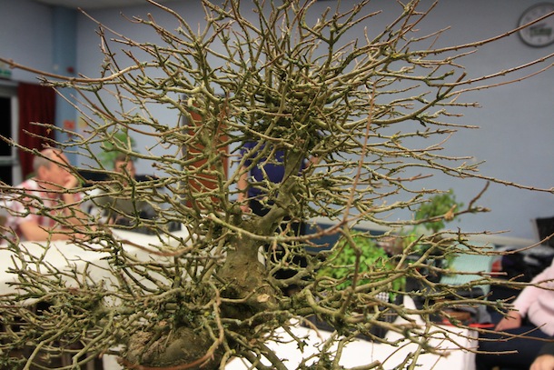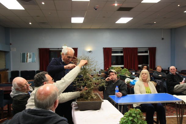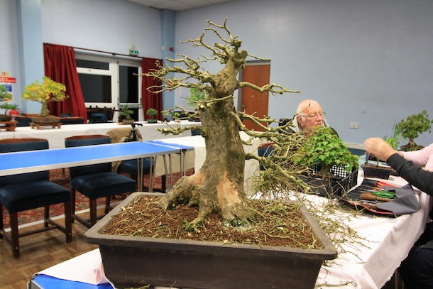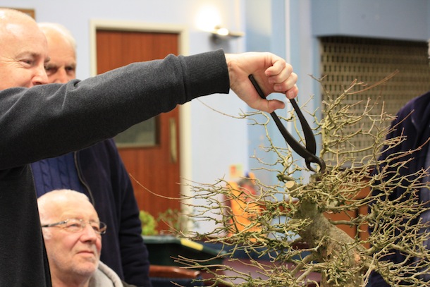 Here is a brief update on the progress of one of the three club trees that were purchased back in April 2011. The Trident Maple has just been repotted successfully but it is currently still struggling with its health and has limited signs of bud swelling although buds are present. The reason for this however was ascertained during the recent club night when Reg brought the tree in for some initial pruning though. During the removal of the dense top of the tree, on closer examination of the cut top, within the branch unions, cavities and cracks, hundreds of red spider mite were visible. They are not easy to see with the naked eye and they were on the underside of the branch unions and not obvious on an initial inspection of the tree. The remainder of the tree was pruned and here is are a series of images charting the progress of the evening. The tree is also now due to be treated for Red Spider Mite which should then allow it to fully flush with leaves and function more normally this year from now on.