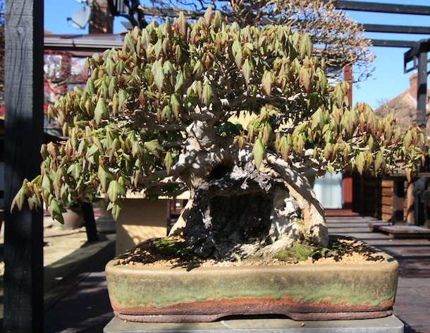 Here is a brief photographic history of a Trident maple over rock (Acer buergarianum). It was originally bought as a training piece in 1996 from Ken Leaver of Windybank Bonsai and it is a combination of 5 trees fused together over the rock. The leaves as they flush in spring all flush at different times which originally caused some concern when the owner first bought the tree. The rock forms a cave also which creates an attractive scene and the tree comes into its element in autumn with the different trees displays variations in autumn colour and the timing of the colour as the back section that leafs up first also goes into autumn colour first. The pot was damaged that it was originally in which was made by the owner and now the tree is in a Walsall Studio Ceramics pot commissioned through Dave Jones.