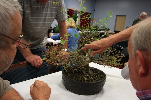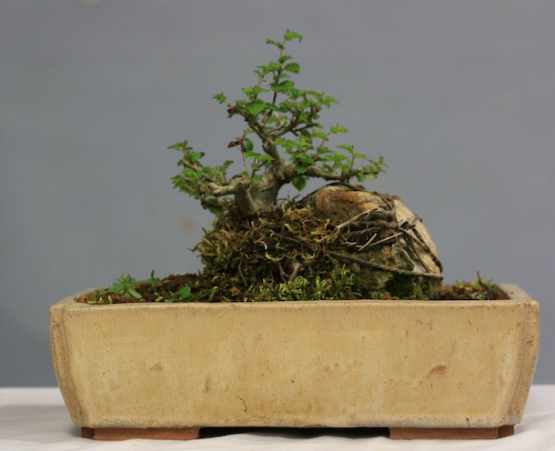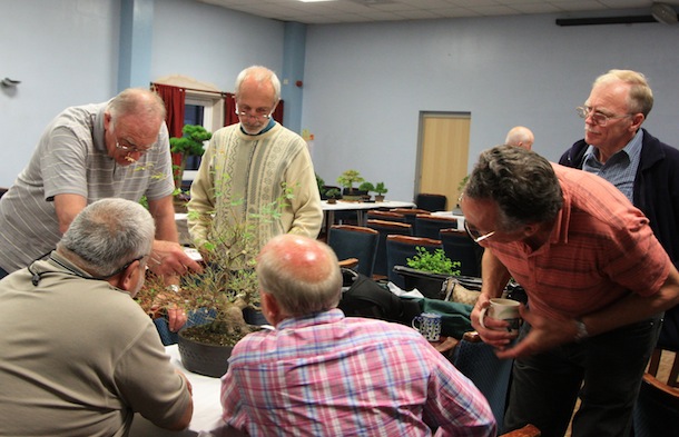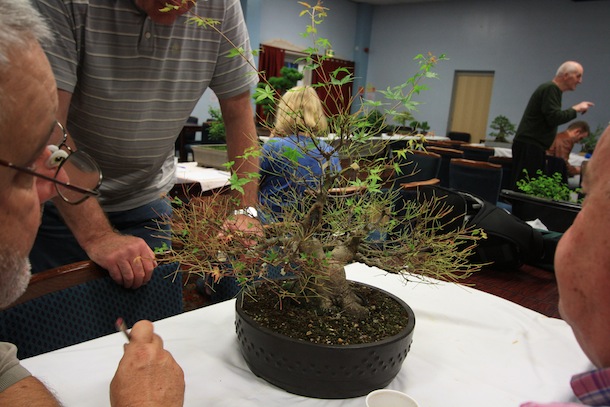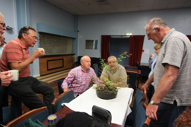 This month we had an evening looking back at the Siberian Elms that various club members had been growing over rocks for the past few years since being given them as cuttings. It was also an opportunity to test out your drawing skills and try to come up with styles and future designs for the Siberian Elms and other trees that Terry had brought in to discuss. The Siberian Elms are very fast growing and tend to put on the best growth when grown in air pots (aquatic pond pots) to stop the roots from girdling. They are quick to develop trunk thickness and some of the examples are less than 5 years old and already are showing good root development over the rocks. The evening focused around Elms predominately, as well as reviewing the newly de-leafed Maple that Paul brought in following defoliation after the saturday workshop with John Pitt. It was a good evening with lots of discussion and some good ideas for future development of the root over rock Siberian Elms.