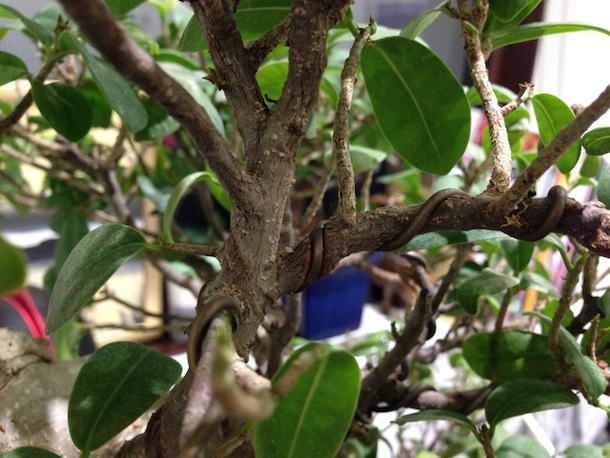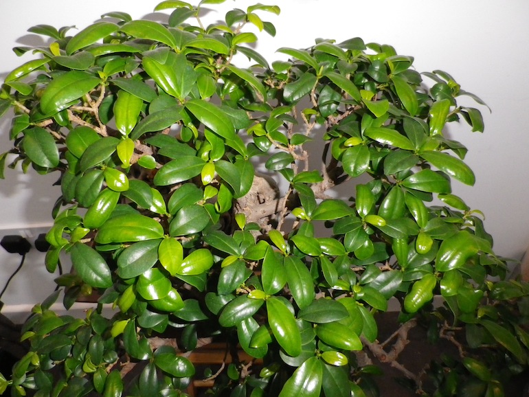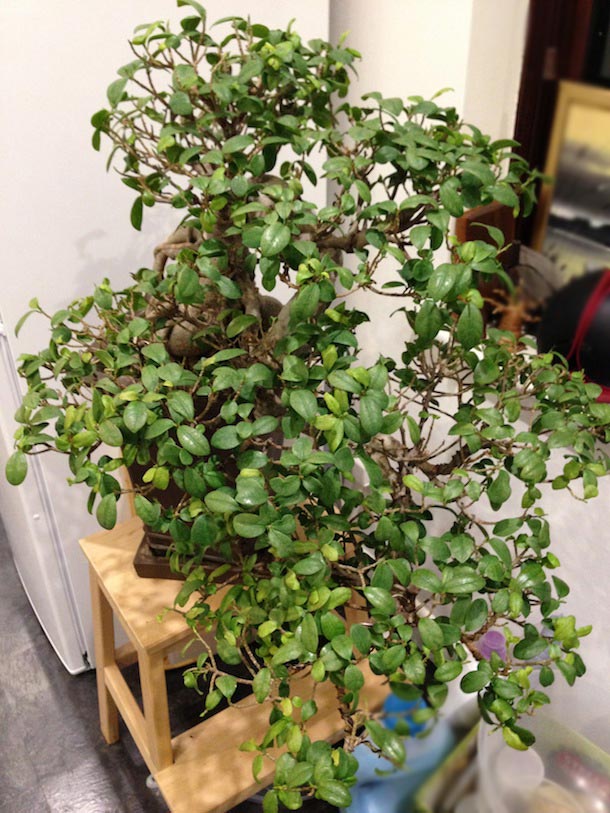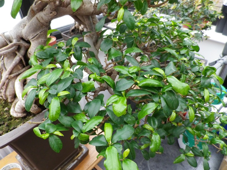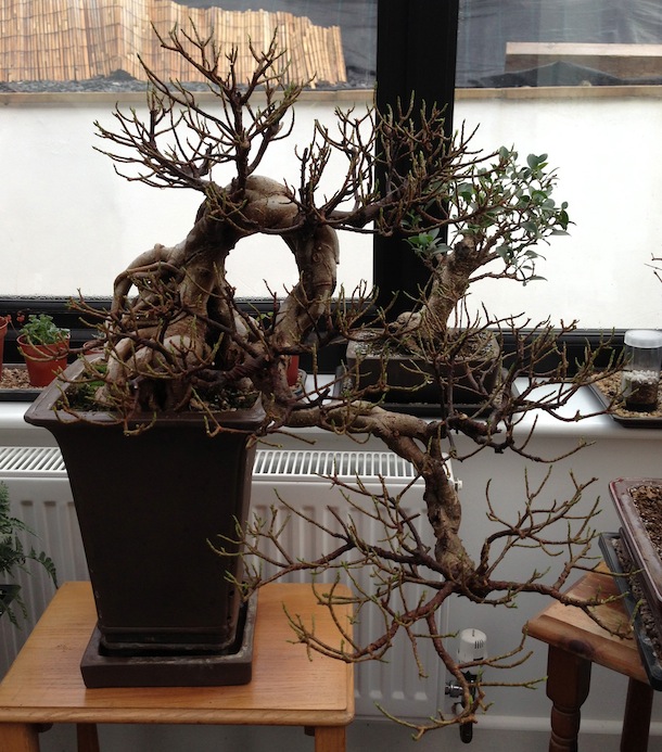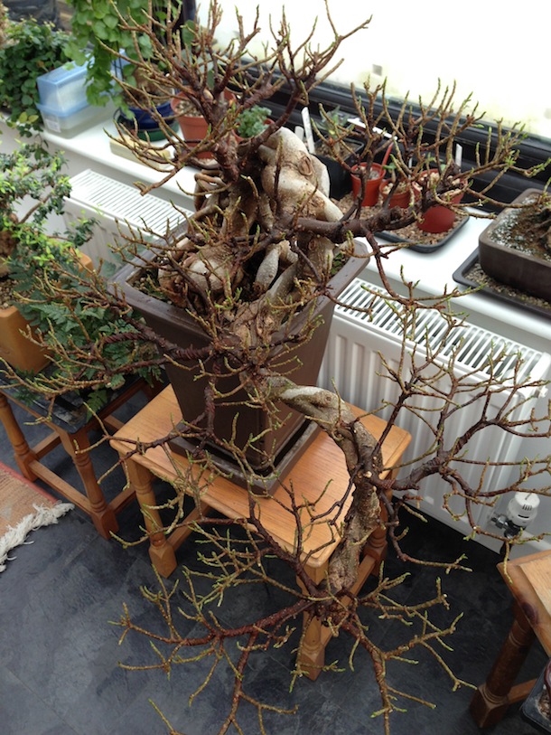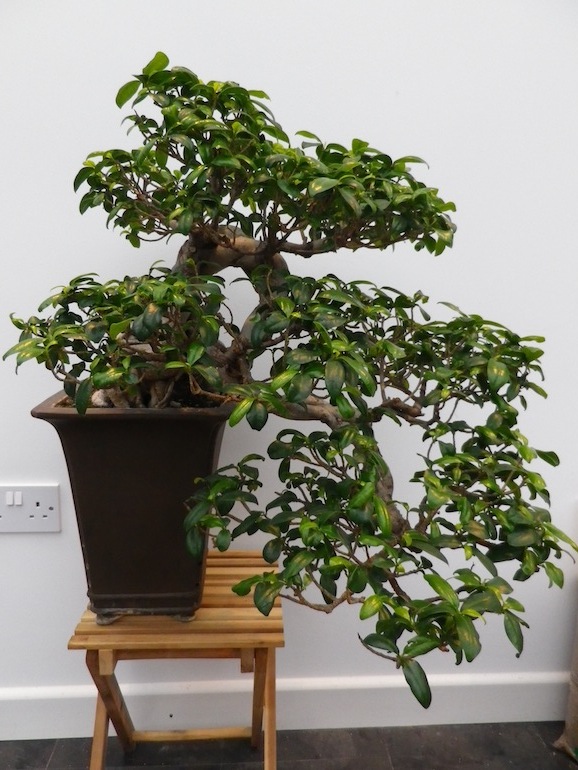 The Ginseng Fig tree was a well developed and established bonsai tree in the cascade style and I have not yet re-potted it but that is phase two following the initial work. It has a fascinating root system, which interlocks and forms a really interesting trunk formation. The leaves should be a vivid green and are oval shaped but had started to go dull and yellow in places as well starting to wilt and curl at the edges more than normal.