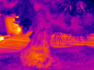 This is a Cork Bark Chinese Elm and conversely to the Fig and Pines above, the trunk remains cool as this is shaded by the canopy and protected by a thick corky bark, while the canopy is warm as the leaves are not adapted to reduce water loss and also contain more water anyway as they are broad leaved and in full leaf currently plus the foliage is very dense. The camera is calibrated to show hot or cold in the first image, so the blue and green denote cooler surface temperatures while the reds, yellows and oranges are warmer surface temperatures. The thermal behaviour is potentially caused by different tissue metabolism and therefore works well on living trees. Interesting to also note that the thermal imaging camera picks up the two nodules on the cork barks trunk and they show up a lighter blue in the first image and light pink in the second image.