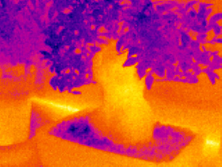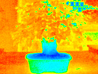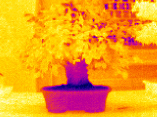 The above image is of a Taiwan Fig, the trunk is emitting a higher surface temperature / heat energy than that of the leaves and soil which is moist (thus cooler) whilst the pot (made of clay) retains a good level of heat. This is what you would expect as the leaves are glossy and thus adapted to reduce the potential for moisture loss which in turn would be related to heat loss. The canopy remains cooler than the trunk that is exposed and in direct sunlight on the window ledge.