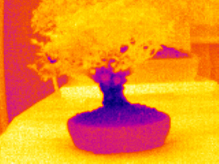 Thermography is a well know tool used widely for technical investigations of buildings, for archaeology, biology and arboriculture to name a few examples, and I was inquisitive to see how bonsai trees show up under a thermal image camera having used thermal imaging on trees before to assess health and to look for dysfunctional areas on trunks and along branches etc. The scale on bonsai is smaller than that of trees in their natural environments, but it is easier to image more of a bonsai at once. You don’t need to climb it to examine branches in more detail.