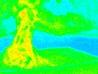 Another view of the same Cork Bark Black Pine but in a different colour setting and again dark blue to purple shows less warm areas than the red to orange and the needles show up a cooler than the lower trunk and they are specially adapted to prevent moisture loss and have a small surface area being long and narrow.