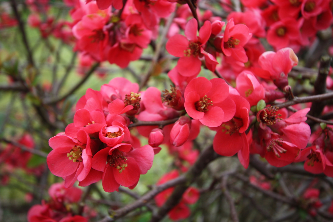 Chaenomeles are deciduous and part of the Rosaceae family and are easy to cultivate and highly regarded for their beautiful flowers in early Spring. The flowers are saucer shaped and come in a range of shades of red, orange and white and the flowers are followed by large yellow fruits or quinces.