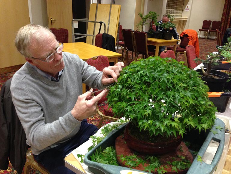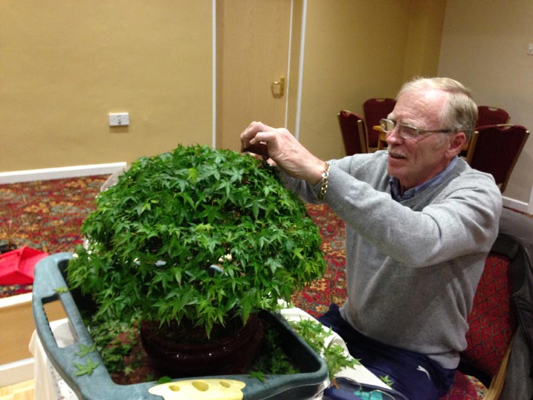 It was won by one of our own Swindon Bonsai Club Members and he has been working hard to improve the crown shape and development through guying down the branches and through regular pruning has improved the crown development significantly already within the past 12 months. Here are a few images of the tree whilst it was being pruned at the April workshop evening.