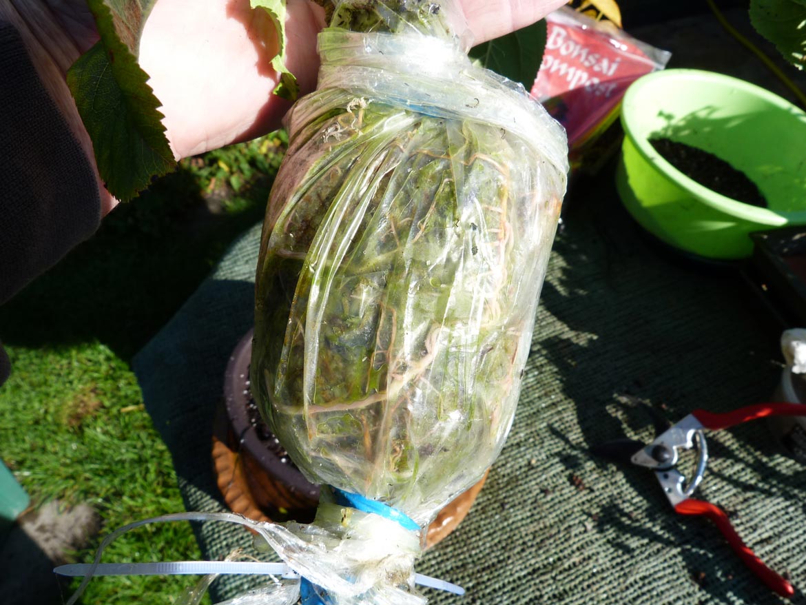 A good hand full of wet sphagnum moss was then applied to the ring-barked cut, then covered with plastic and cling film, using cable ties both ends to secure it all to the tree.