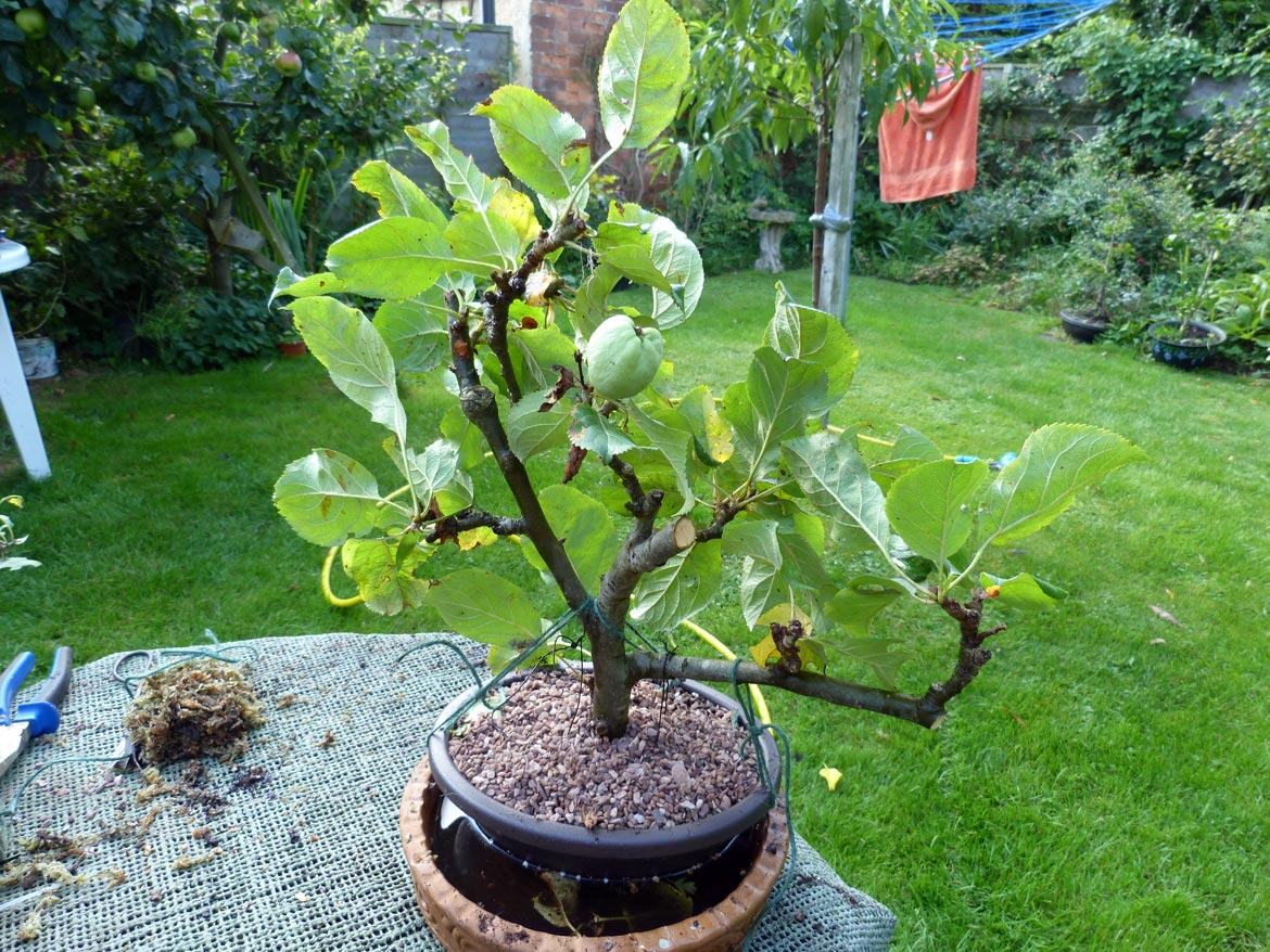 - the tree in a pot tied down to stop damage to roots with wind moving the tree