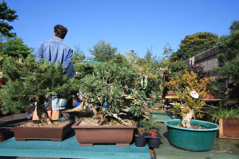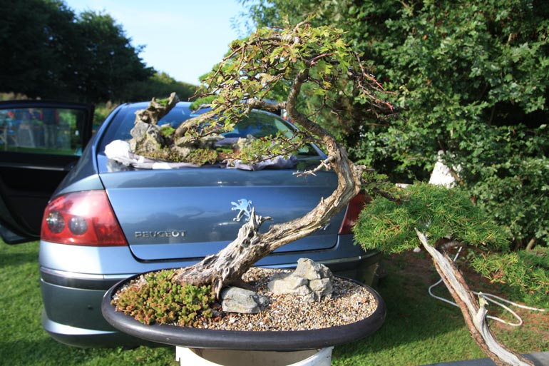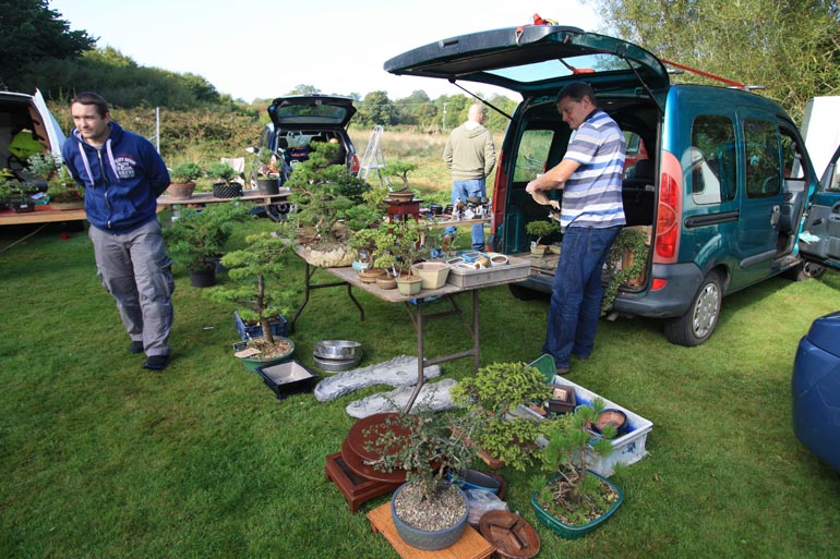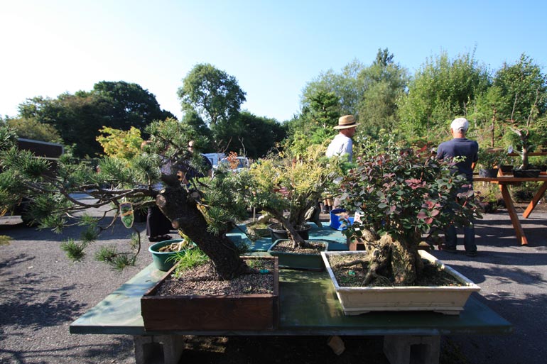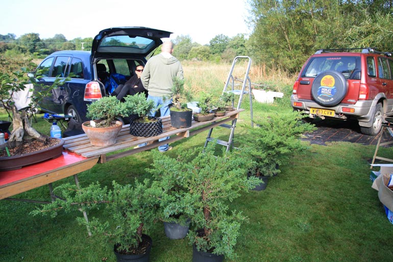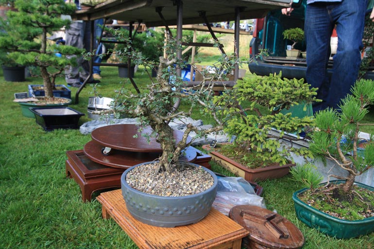 The auction is really hotting up here at Dragon Bonsai in Wales. A great chance to pick up all sorts of stuff. There is quite a buzz in the air as some great trees have come up for sale and mini bidding wars have commenced – but in an amicable way and ably handled by Chris Thomas, an auctioneer extraordinaire. There is over two hundred and fifty lots to go through and despite the blazing sunshine in the afternoon the bidding will probably continue into the late hours of the day. Even John Pitt is here getting stuck in. It was a car boot first thing and then the auction with some of Simon Temblett’s early bonsai creations up for grabs and some people are really getting bargains here. Thanks to Chris and the gang for making us feel welcome.