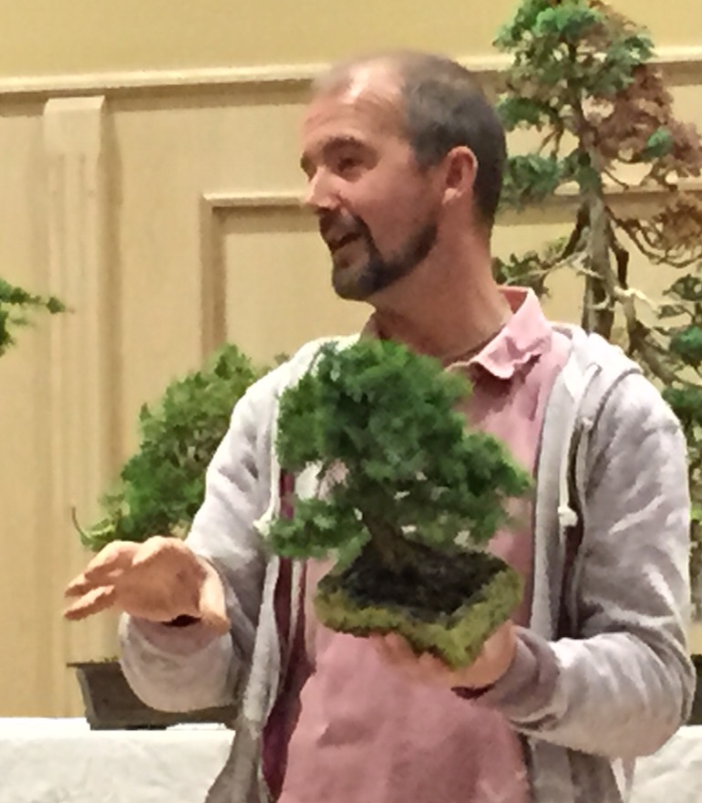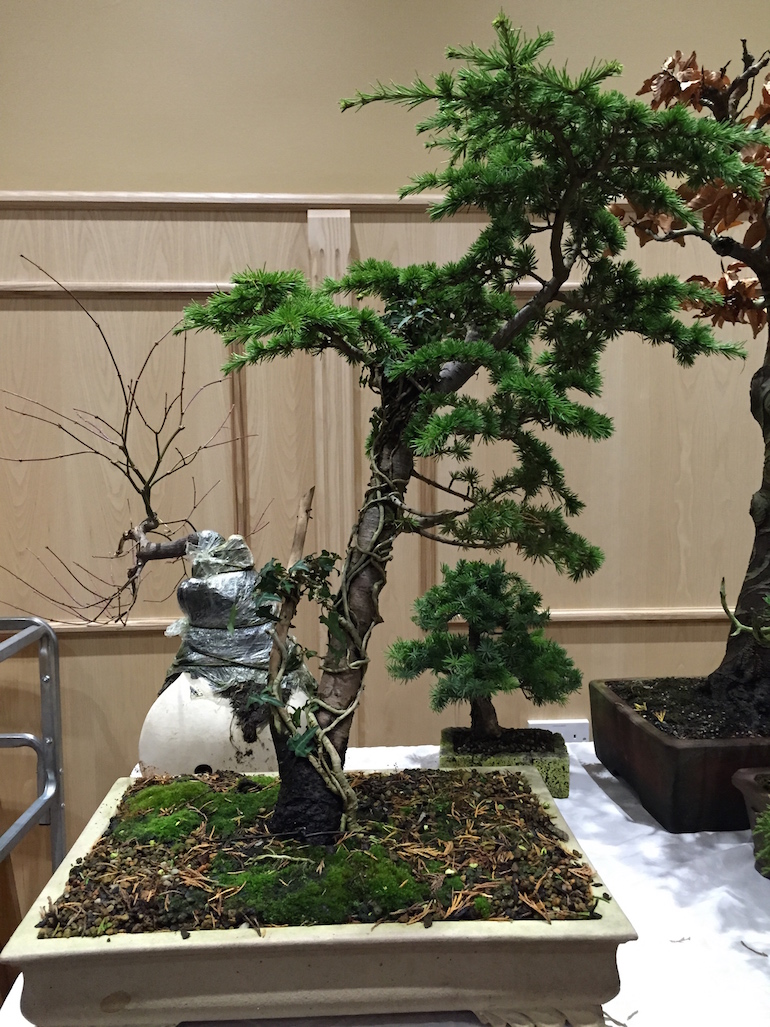 The second tree he discussed was a Cedar (Cedrus) that he has developed from an air layer taken after growing some cedars from seed after finding a cone with germinating seeds in it. He field grew the seeds until they developed into around 8ft high trees and then air layered one of them. He feels it was not great starter material and this is the only one he kept, but the tree does have a few striking features. At some point an Ivy naturally started to grow in the pot with the Cedar and he has now incorporated this into his design for the tree and has been encouraging the Ivy to grow up the trunk of the Cedar.