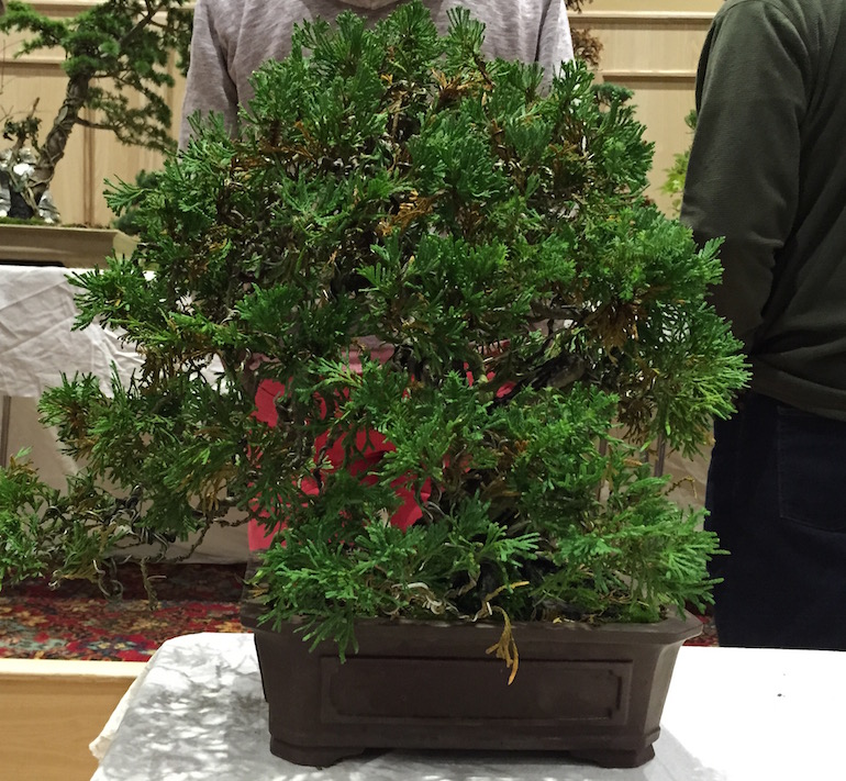 He started the evening off talking about his Western Red Cedar (Thuja plicata) exact cultivar unknown. He commented that on an annual basis this tree tends to suffer from shedding and a large amount of die back so something to watch out for as it tends to only then fill out slowly. He has been working on this tree for around thirty years and it is styled on an image he has of old Cypress trees. It produces a prolific amount of flowers each year.