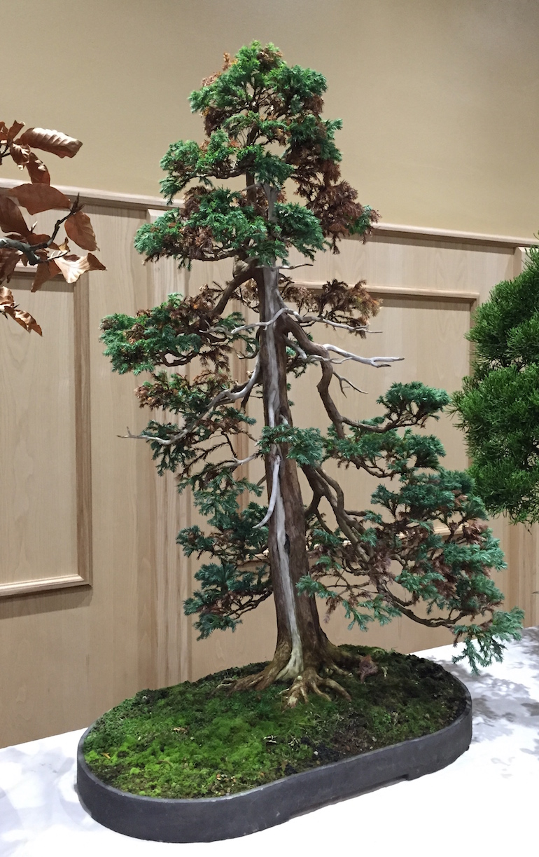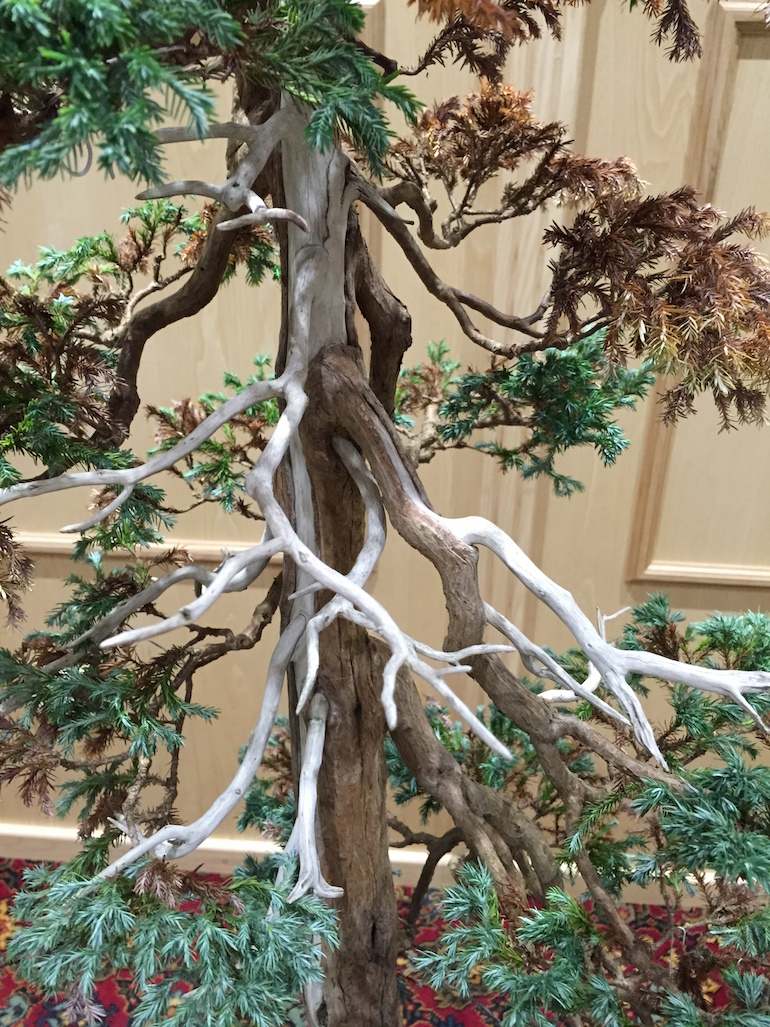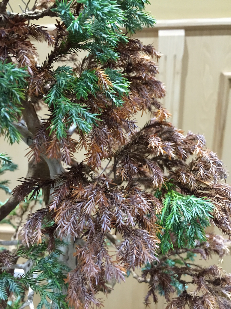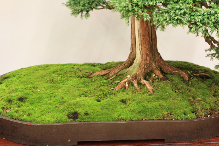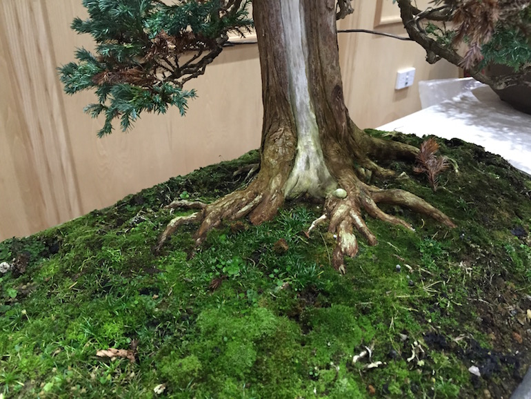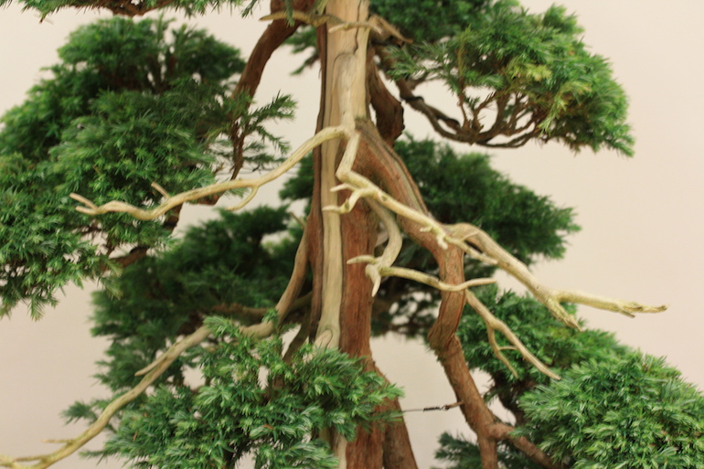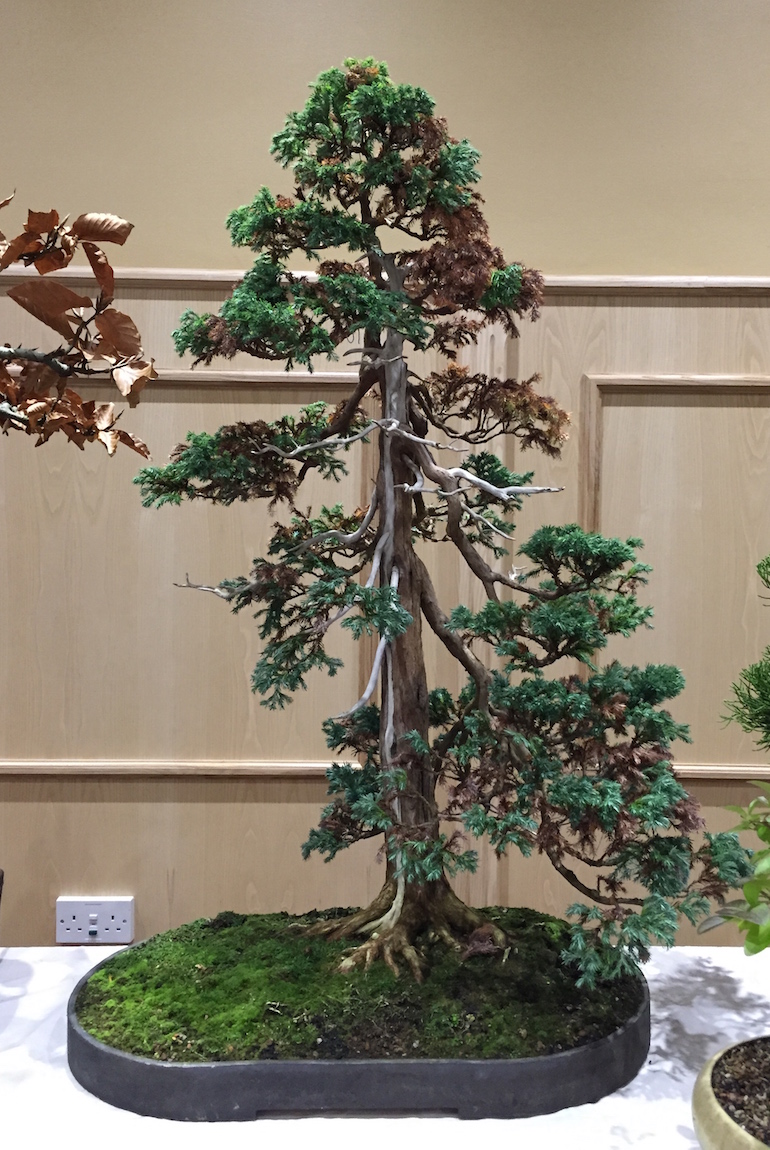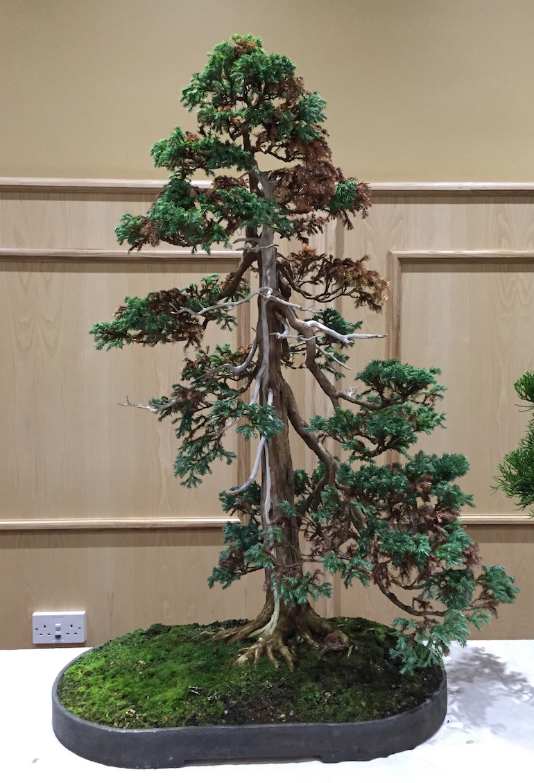 One of Simon Tembletts more well known creations is his Boulevard Juniper (Chamaecyparis pisifera ‘boulevard’) but sadly of late this tree has been suffering from what Simon believes is natural dieback as opposed to a pest or disease problem. He puts the dieback down to mild moisture stress due to continued growth restricted to a shallow pot with unstable pot temperatures affecting the roots. That root dysfunction thus explains the canopy / foliage die back and even though this is very natural in a tree in the wild it is a significant issue on a bonsai tree.