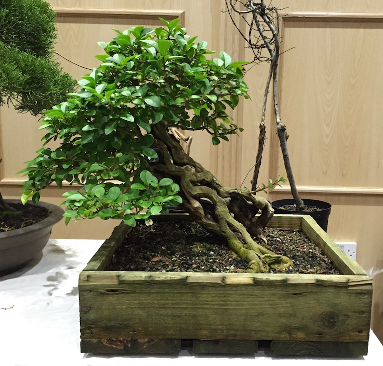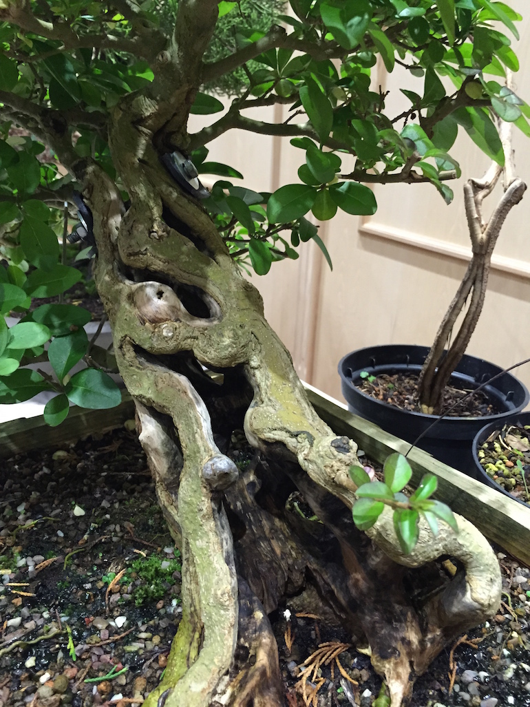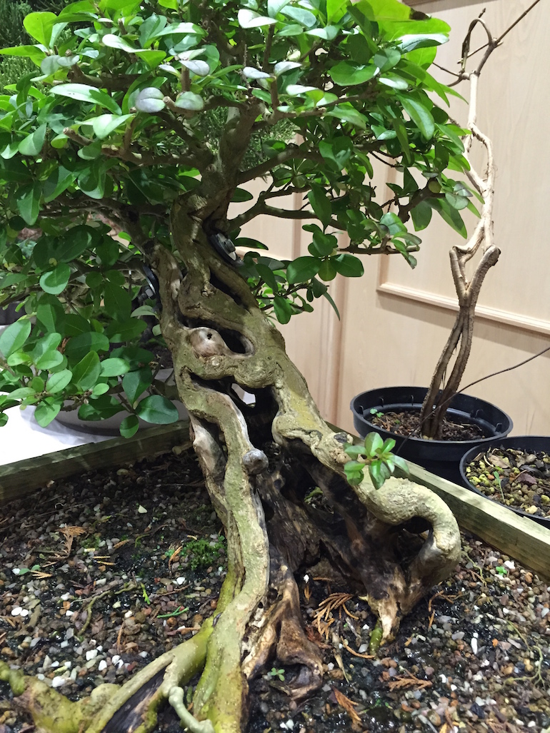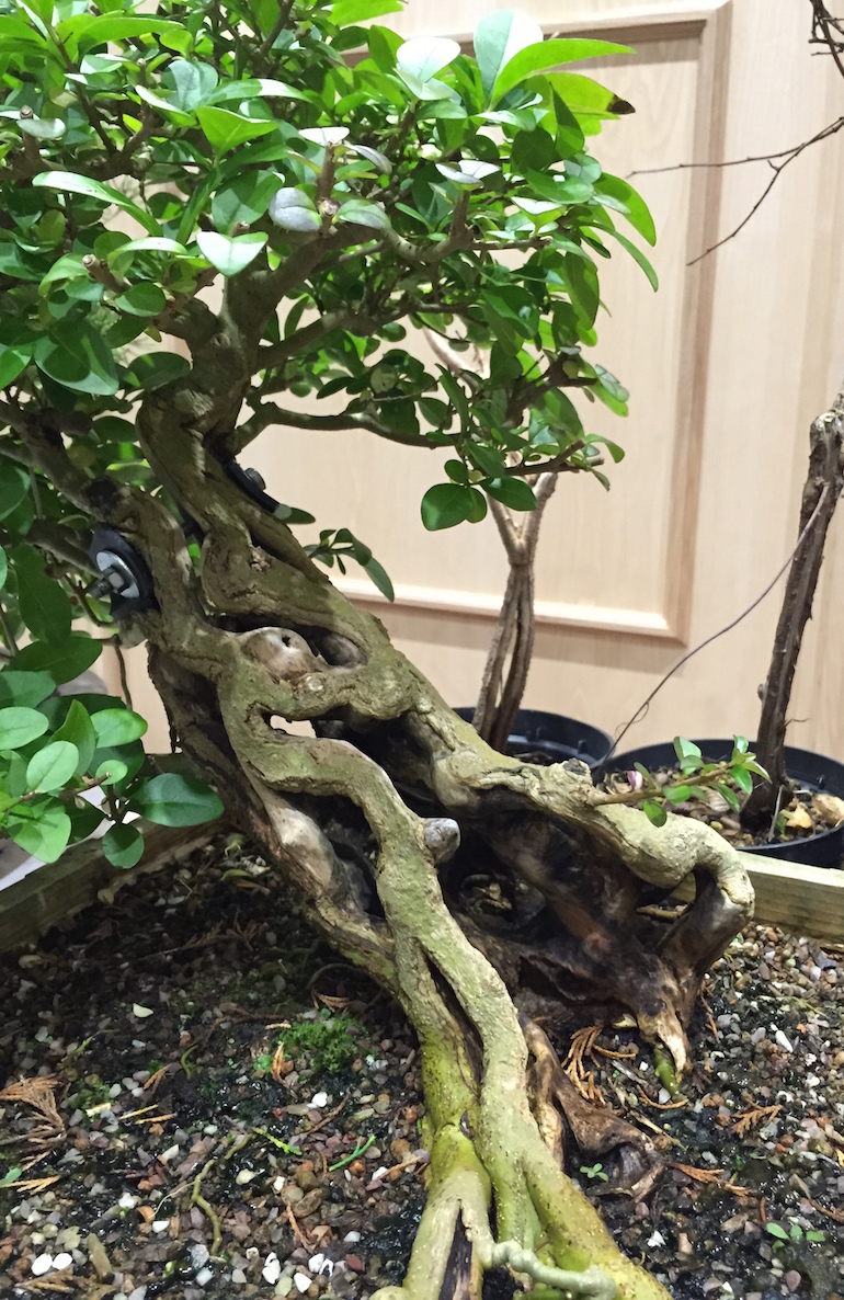 Simon again left the wounds to seal and compartmentalise but Privet is very slow to do this and then he used a toilet seat bolt to pull trunk together as it needed to be closer for the image to work and also the 1st year after carving it grew well but some bark areas died back as they dried out and cracked. It is still work in progress and Simon has yet to decide on a pot that will be suitable but the image currently is very aesthetically pleasing already and it reminds me of a shaped tree image which was created by Axel Erlandson.
