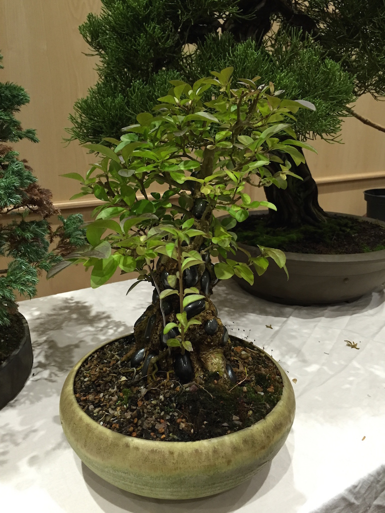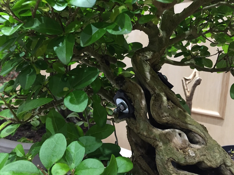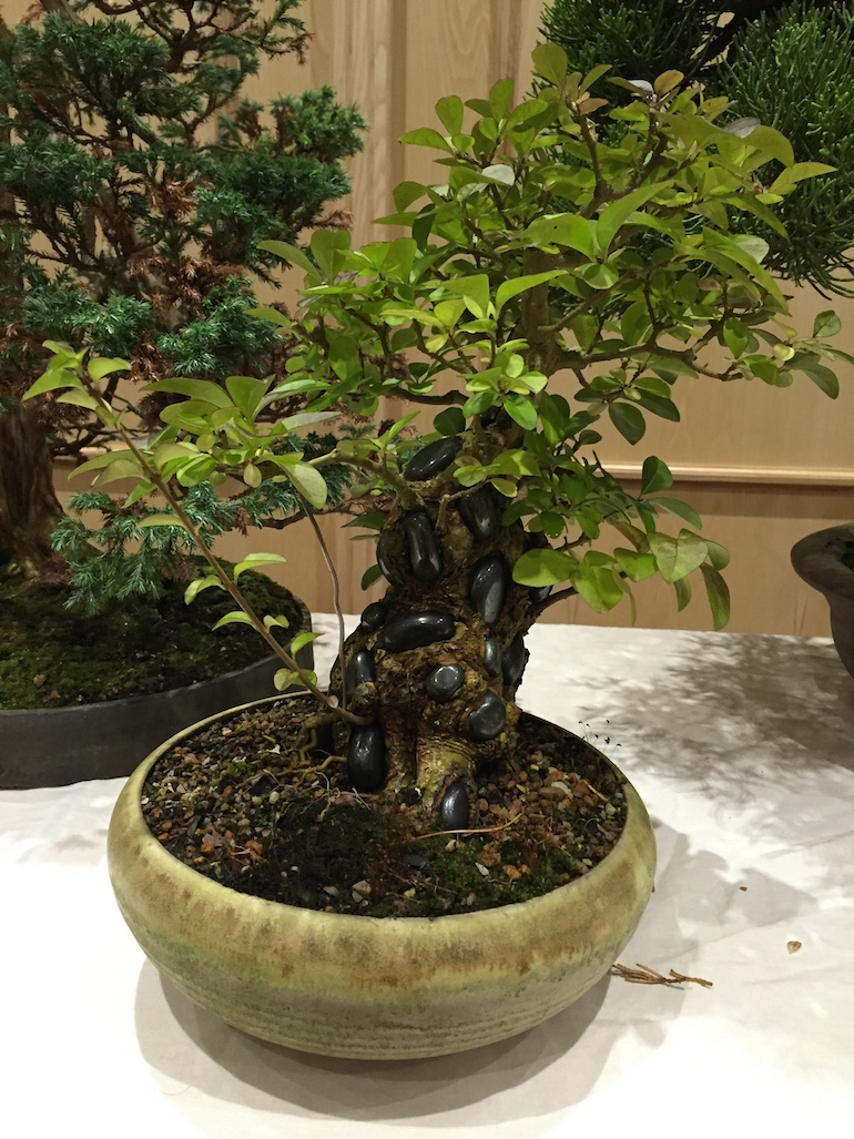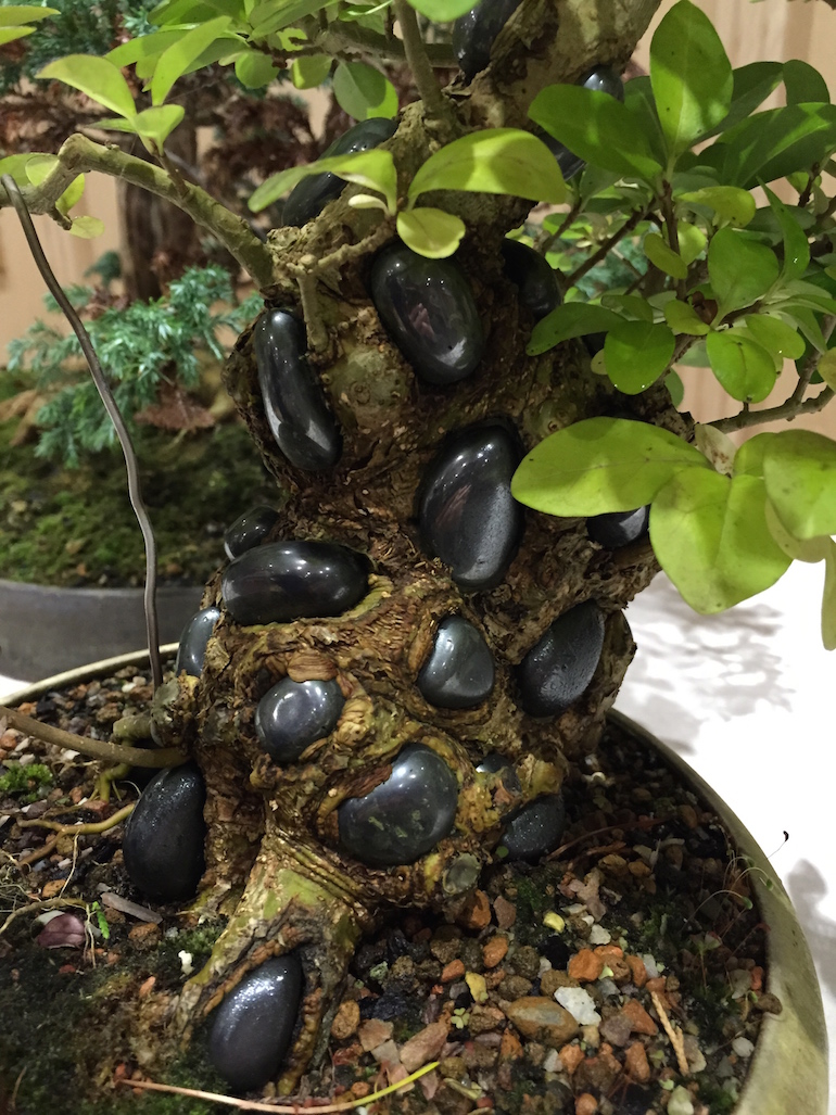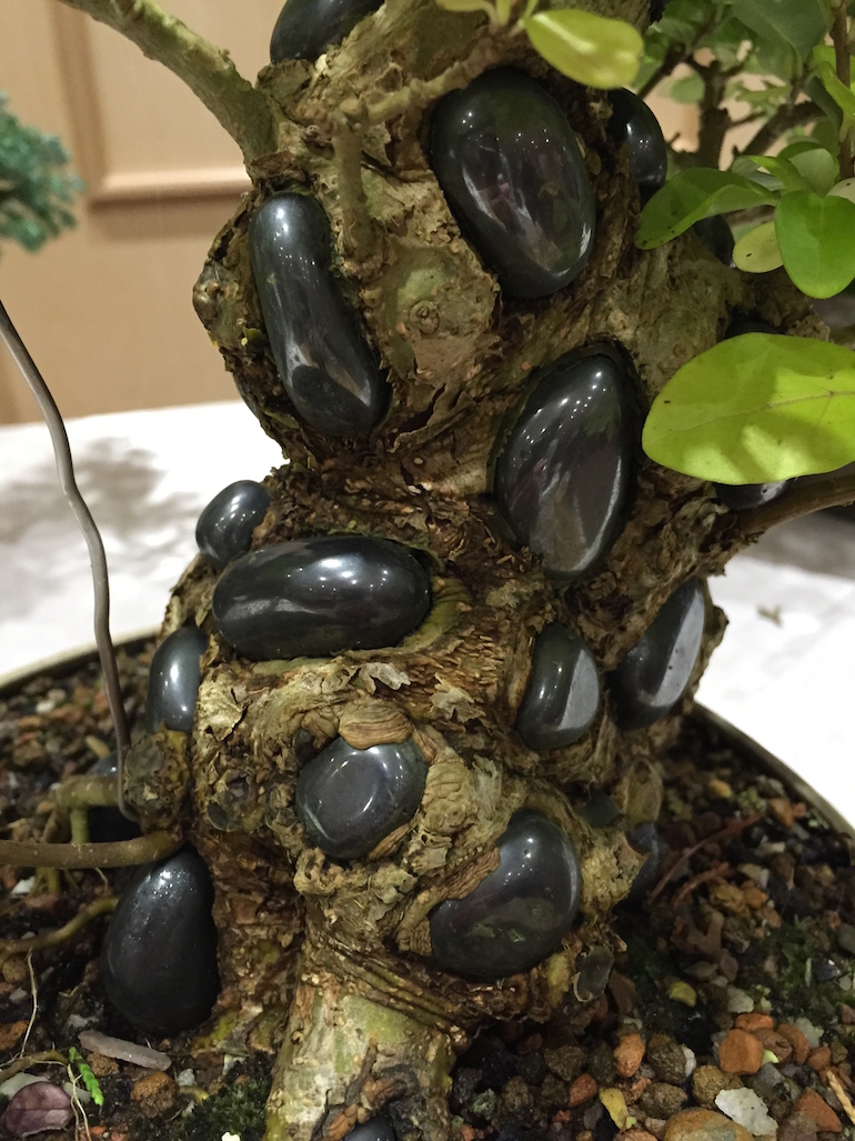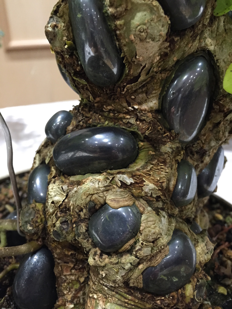 The second time he set them by carving them in and creating holes that the stones fitted perfectly into and in 2 years grown the bark has calloused around them well. He is looking to continue to develop this tree and is still deciding on a pot to suit!
