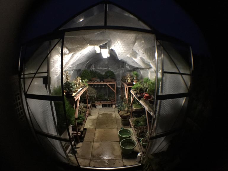 Another popular technique involves storing bonsai underneath the shelves one might use to keep the trees on during the growing season. A piece of tarpaulin for example can then be draped over the top of the shelves and around the sides overnight and in particularly cold spells helping prevent frost damage and control water levels. It is important to open the tarpaulin when possible to allow air to circulate inside and around the trees during the day (trees need to breath too).