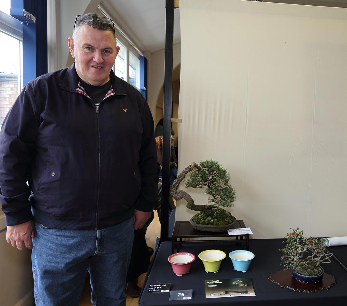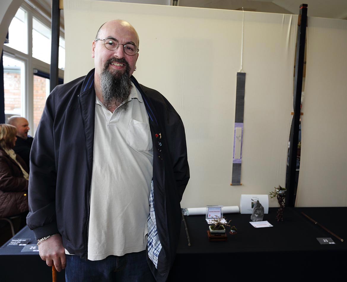 Traders showed a good variety of products with Stone Monkey bringing many new and colourful pots particularly suited for this smaller corner of trees, including pots that were recently displayed at this year’s Gafu-ten bonsai show in Japan. Ian Baillie also provided many options for the undecided with a selection of his own pots and some he had brought back from a recent trip to Japan. Esoteric Pots, Walsall Studio and John Pitt also added variety to the mix. Many beautiful suiseki, tables and pots where brought along by David Sampson. Those wanting to add to their tree collections where well supplied by Bonsai@16 and Windybank Bonsai. Ritta Cooper also had accents, Japanese pots and kusamono available including a very good rose that was snapped up early. Bespoke Bonsai Stands brought along well sculpted and constructed stands, jiita and ne-taku displays.