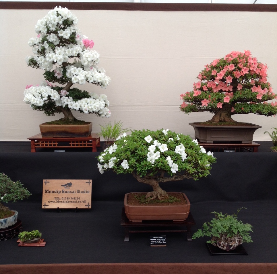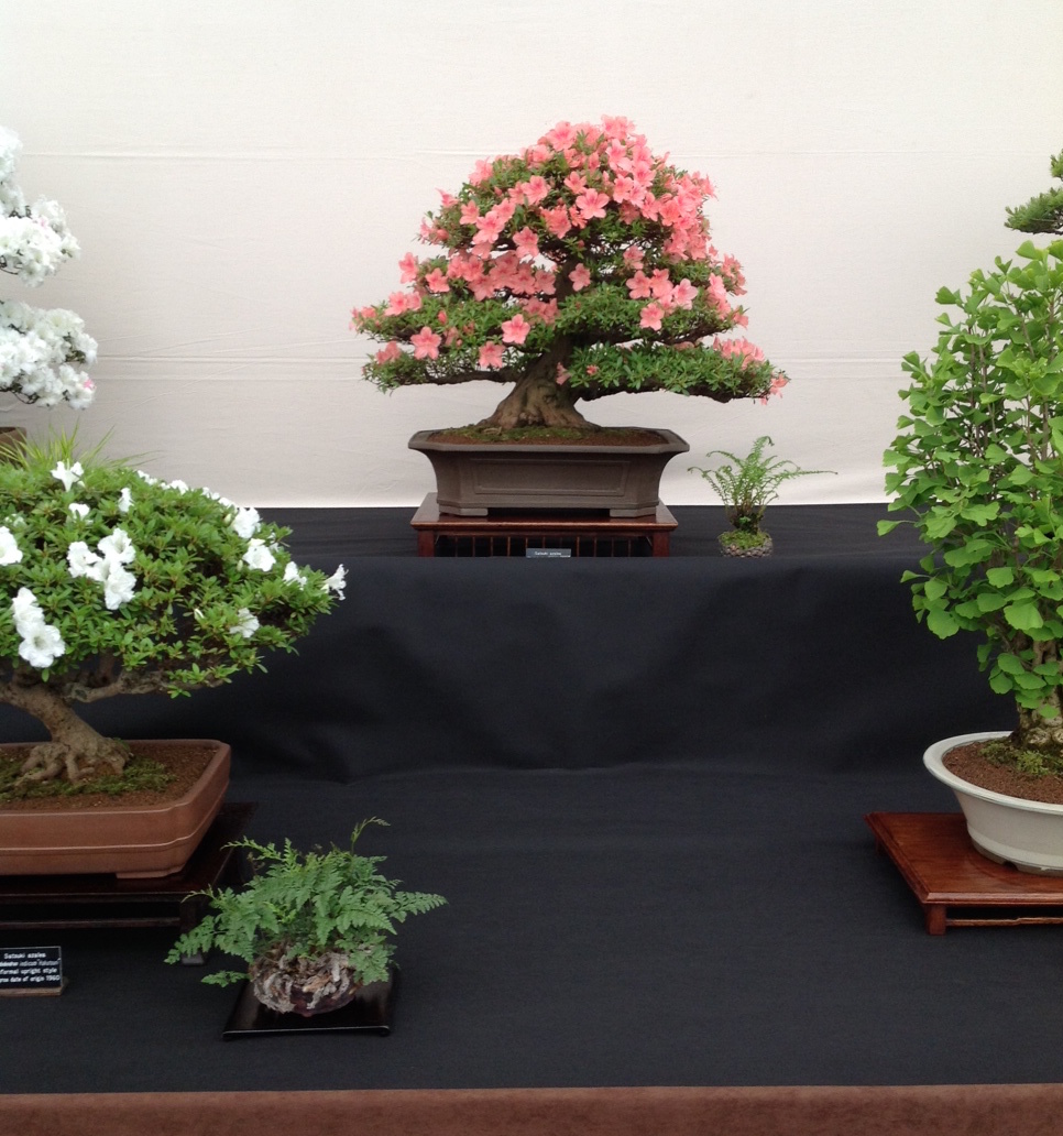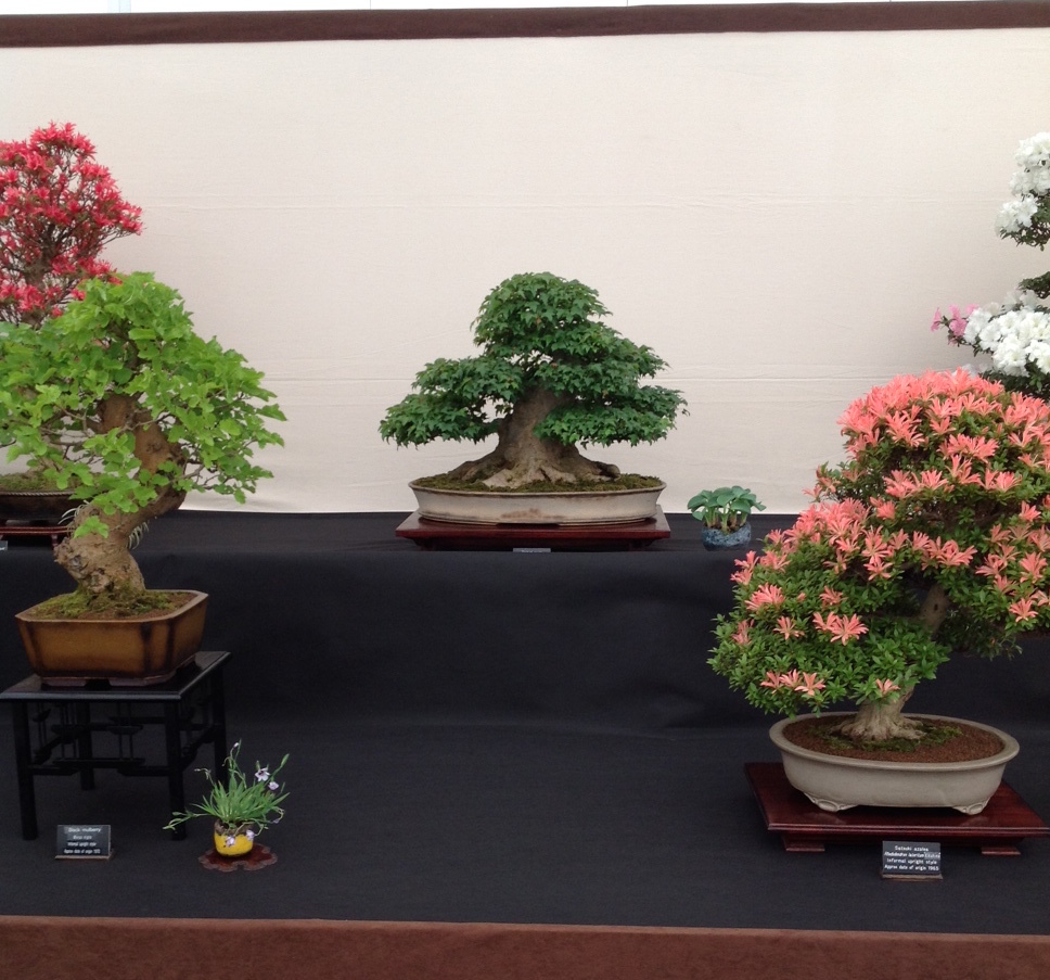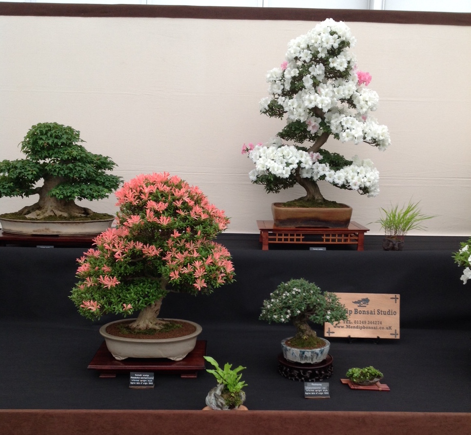 So my ambition was to aim for a predominately flowering and fruiting display. This year I was lucky with my Satsuki Azalea’s being late flowering due to the late frosts, etc. I was able to display 5 Satsuki’s, a cotoneaster and a Mulberry. Together with a Trident Maple, Japanese White Pine, Siberian Elm, ginkgo and a Chinese Juniper (Itiogawa) to complete the display.