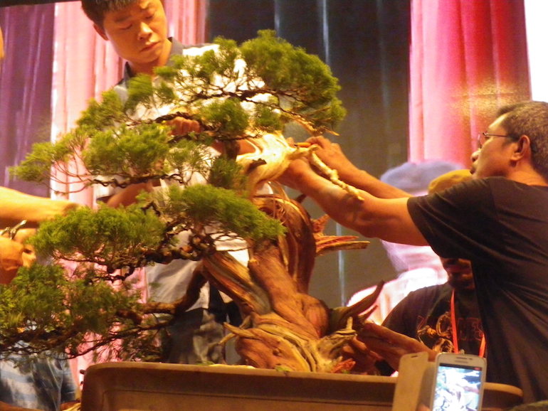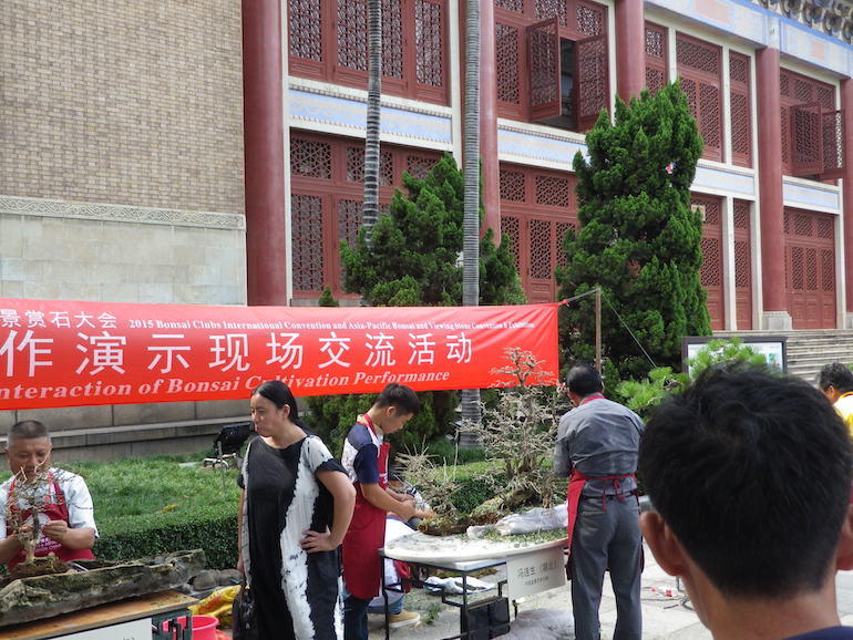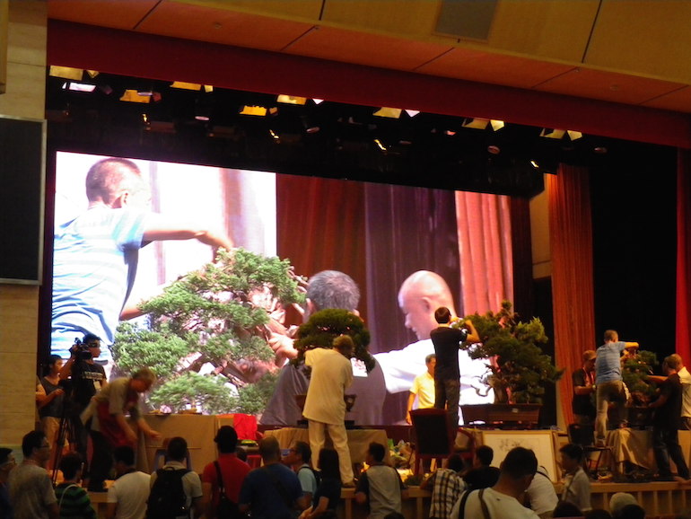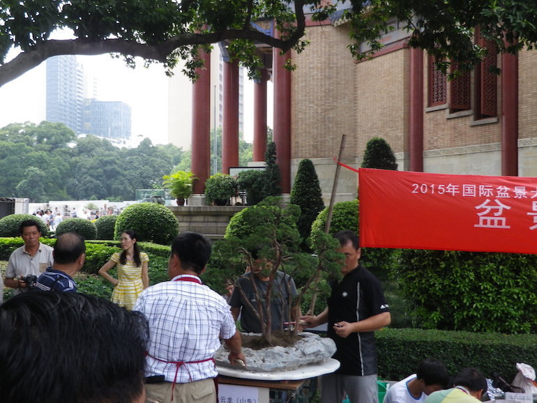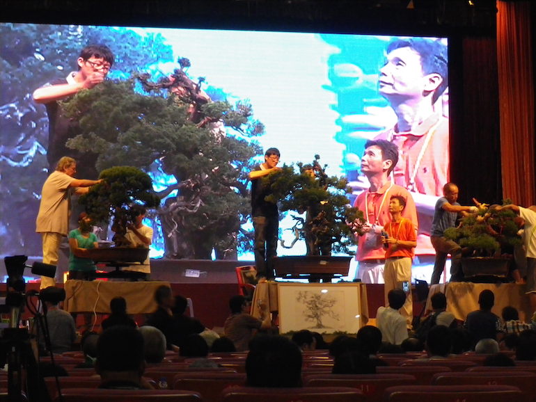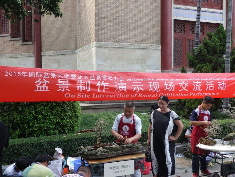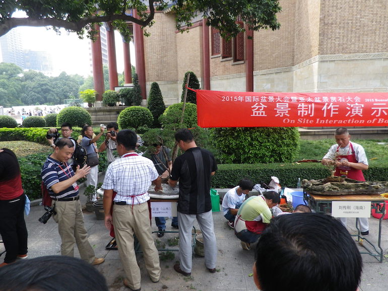 At this years Bonsai Clubs International Convention (BCI) in Guangzhou in China there were a good range of demonstrators and speakers from around the world. They were demonstrating styling, bending branches, wiring, jin and shari creation and pot making.