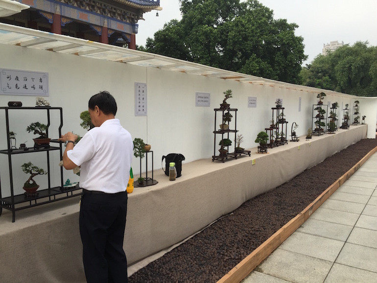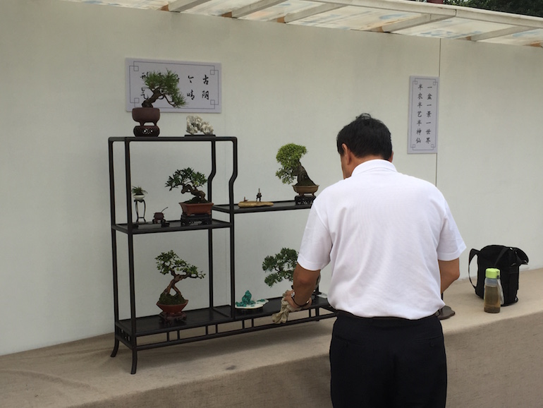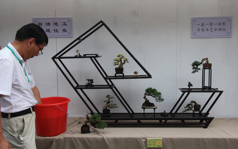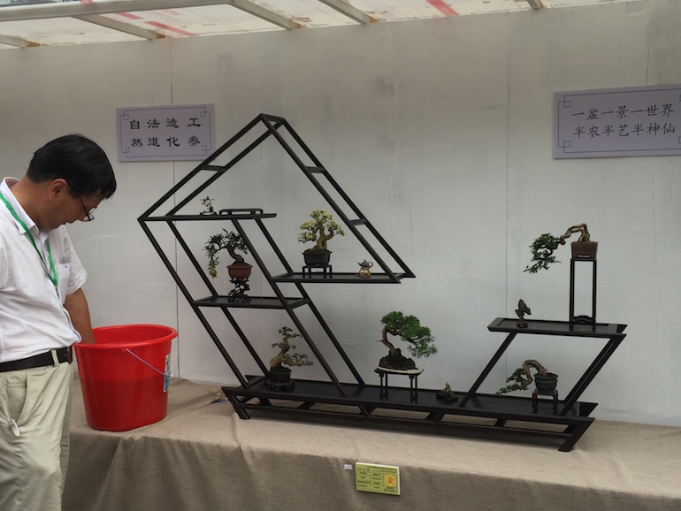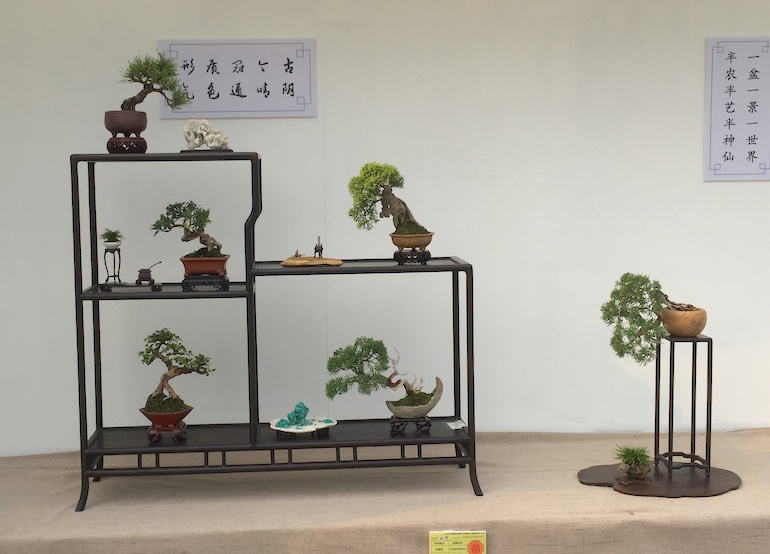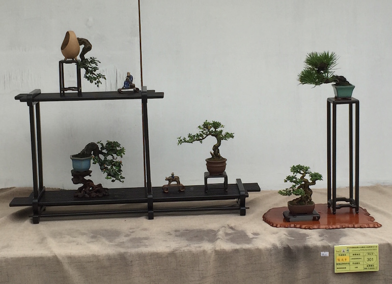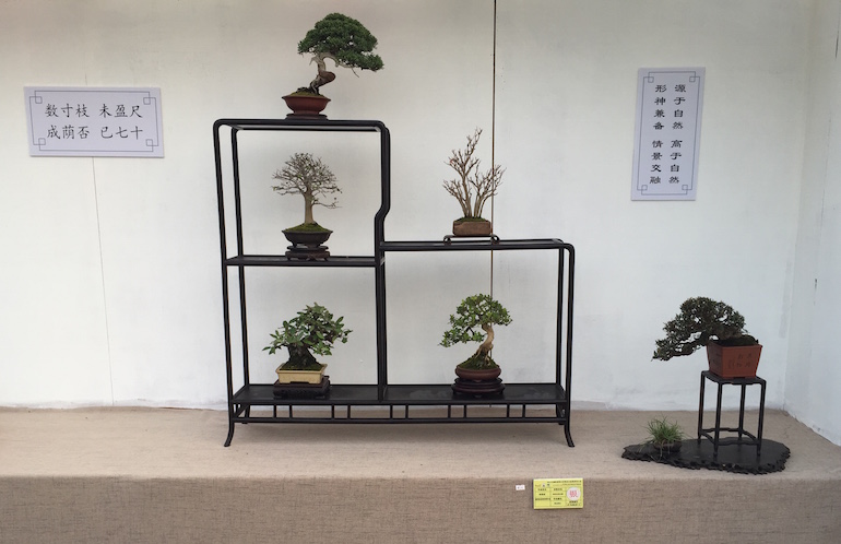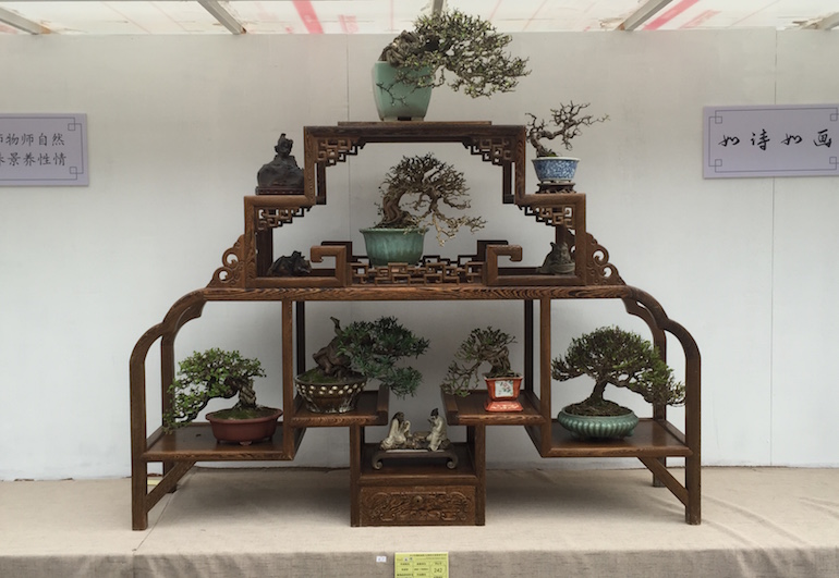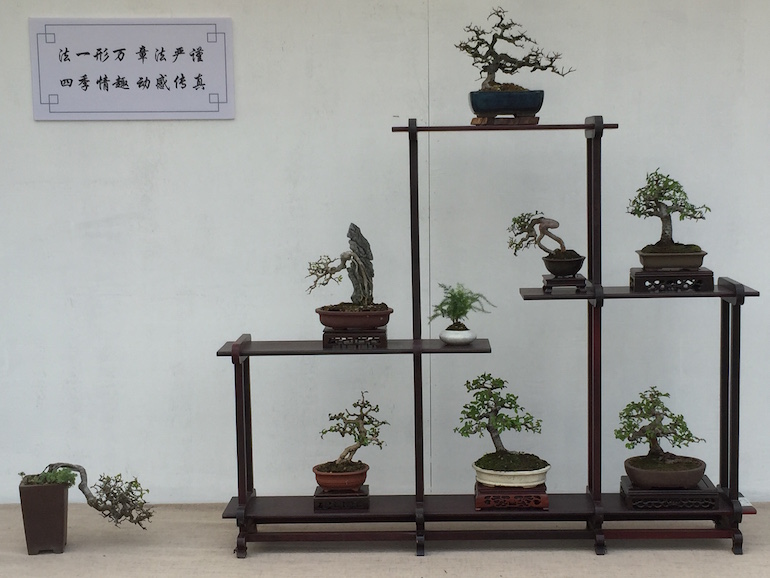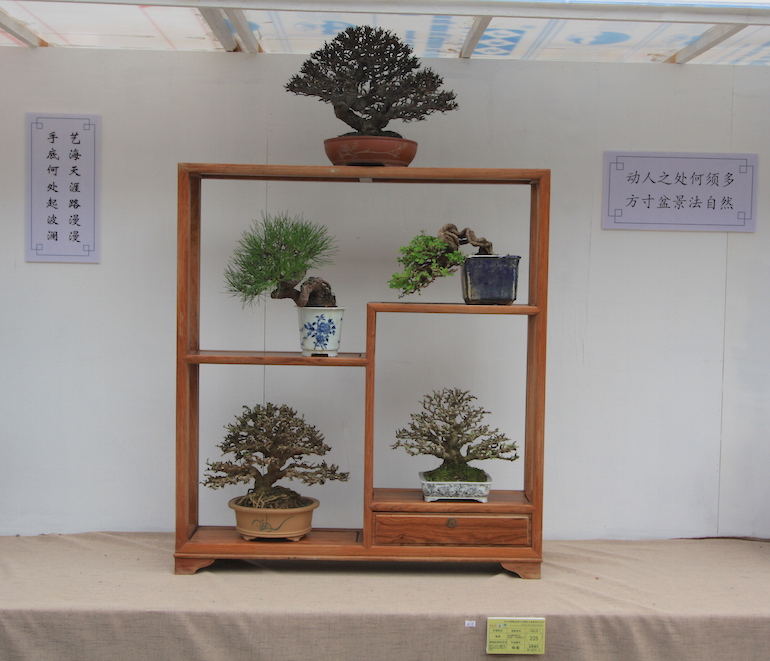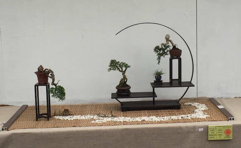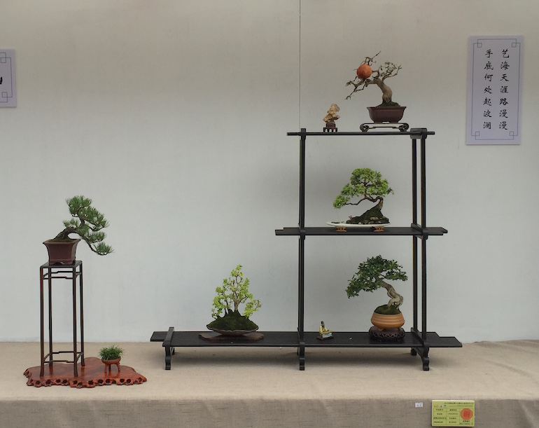 Wow, what an amazing collection of Shohin and Mame trees on display at the recent open air Bonsai Clubs International Convention in Guangzhou, China. This was a stunning outdoor series of displays set off with a good backdrop and a very visually clean image being presented. It was great to see so many styles of bonsai stand & display and some really stood out from the rest.