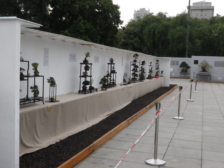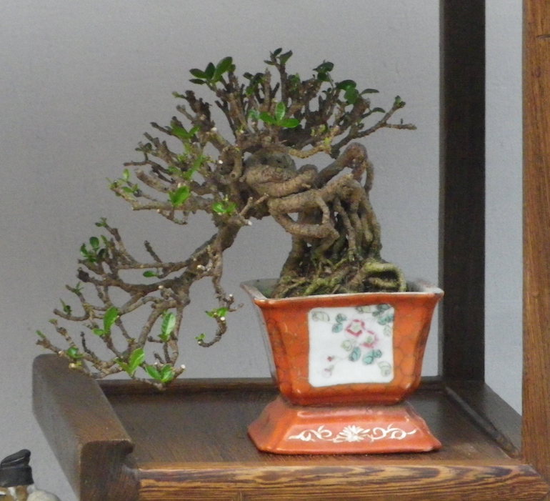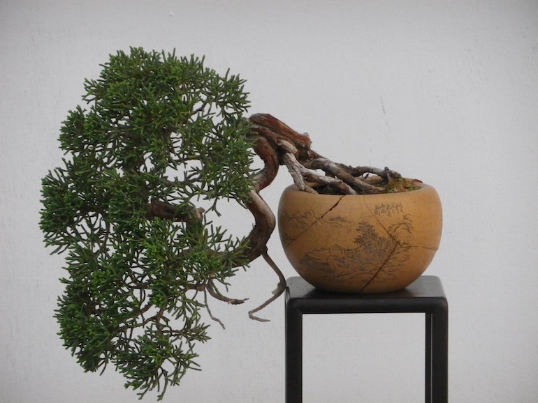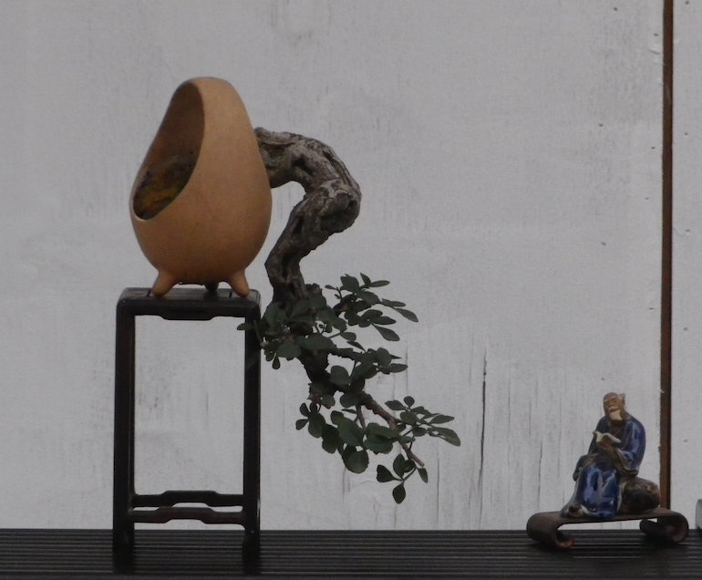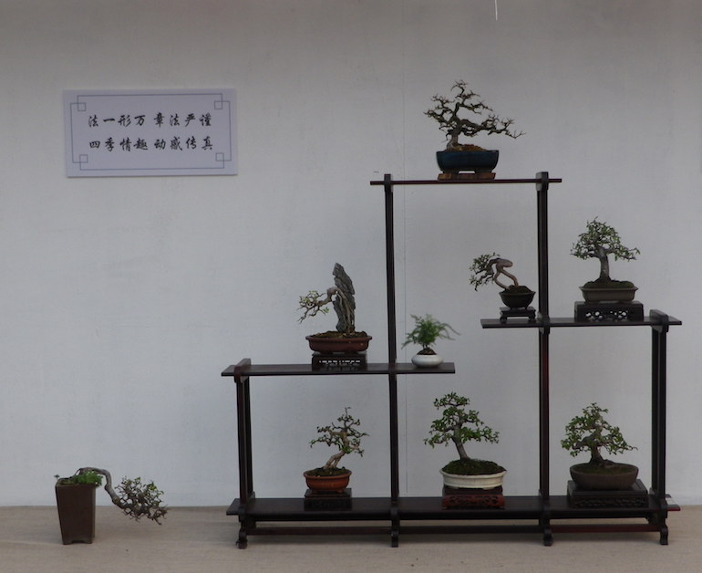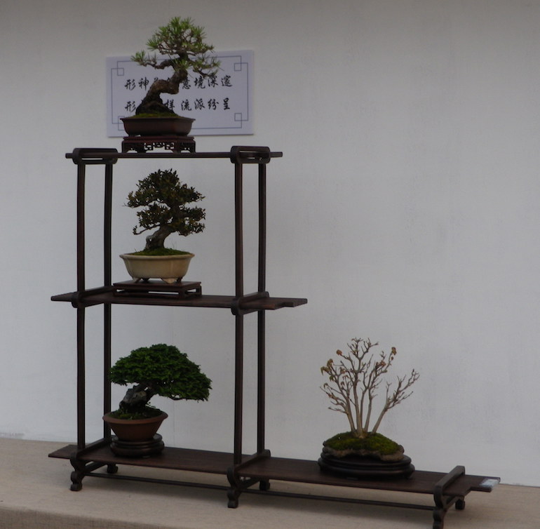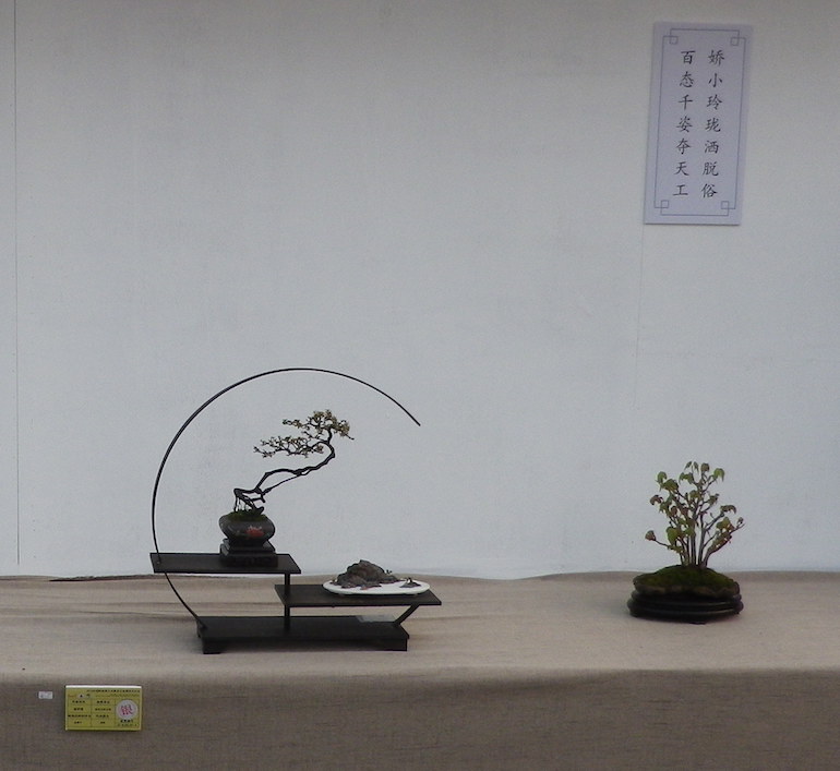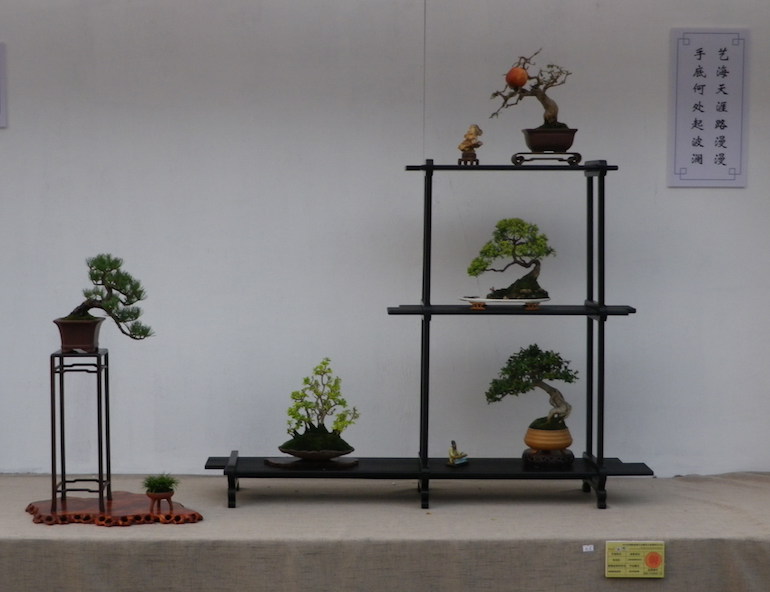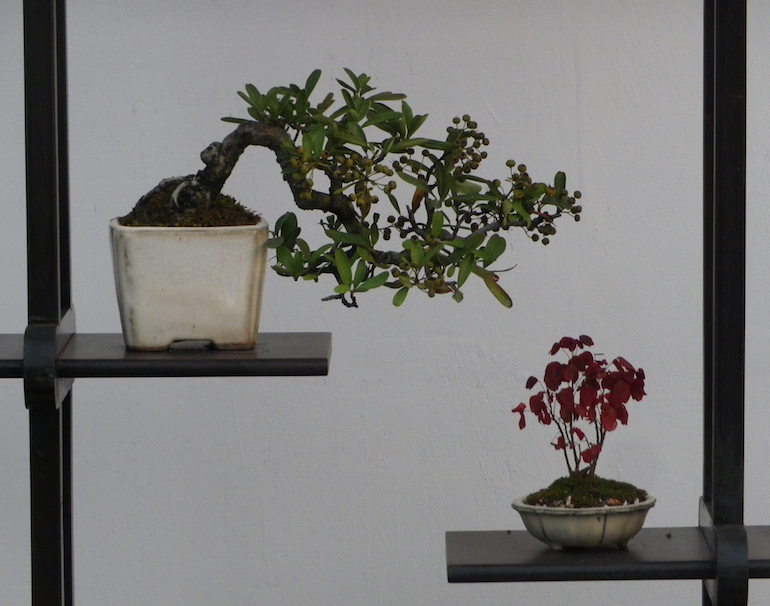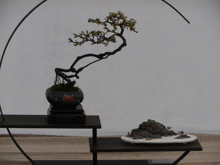 Another element of the shohin trees is often they are shown in brightly coloured or designed pots, so take a closer look as some of the pots as some are exquisite but apologies for some of the images, as it was early morning and you were not able to get too close and I had no zoom lens with me, just a wide angle. Plus some great wooden stands for each of the trees from round root carvings to tall elegant cascade stands.