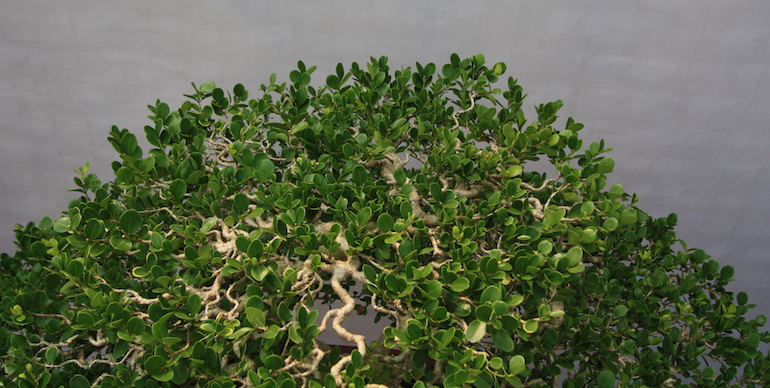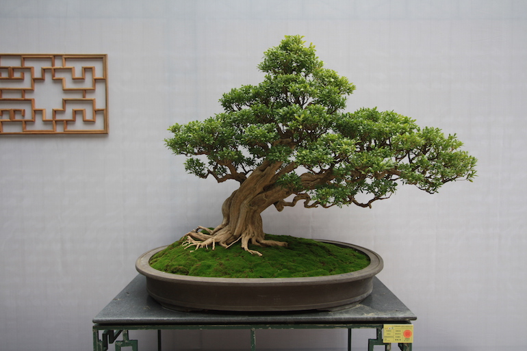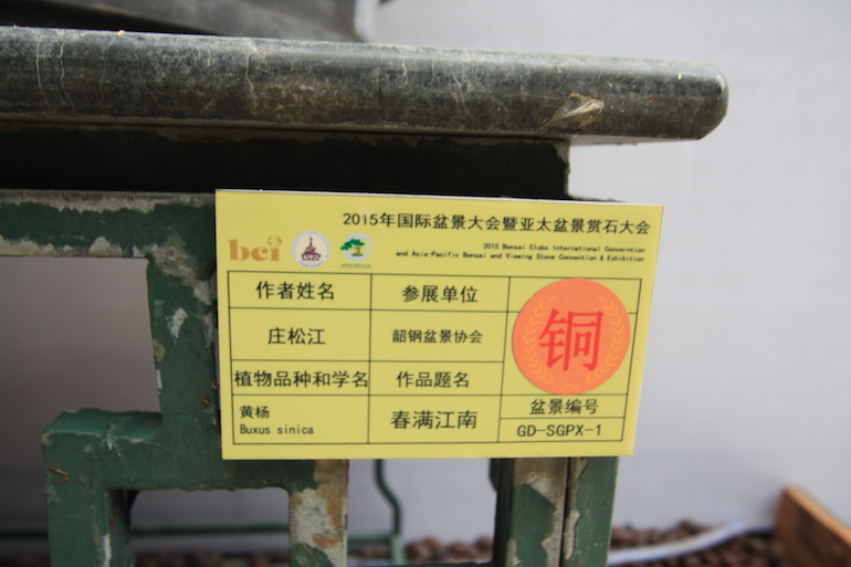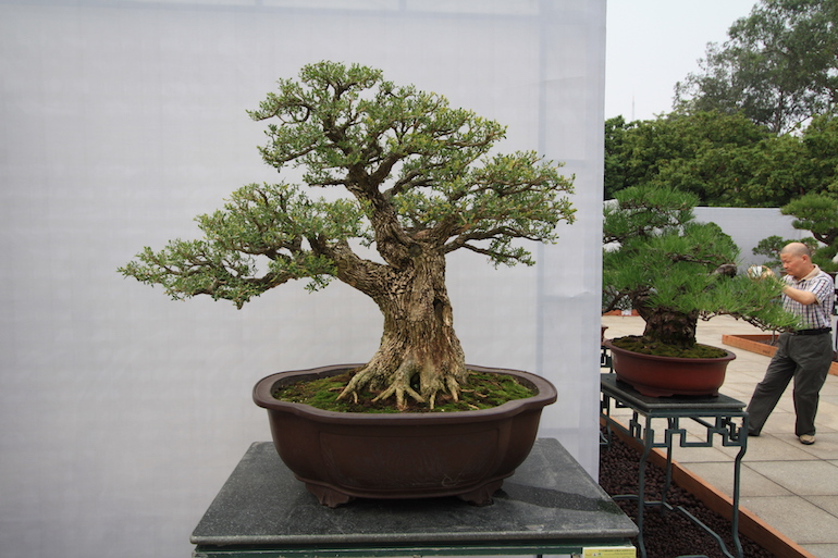 Buxus sinica (Chinese Box) makes an impressive bonsai especially on the size and scale of the examples on display at the recent Bonsai Clubs International (BCI) Convention in Guangzhou, China. There were some stunning mature exhibits of the Chinese box and the trunk fluting and ridges presented a very dominant trunk image as well as the dense evergreen canopy.