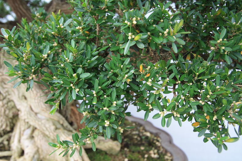 The Buxus sinica bonsai on display where in a range of styles, many with a windswept element and some more sparse in the canopy than others. It was possible to see the small yellow-green flowers on some of the exhibits.