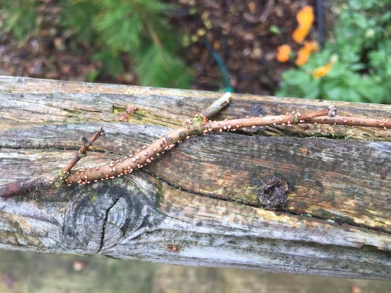 Coral spot (Nectria cinnabarina) is a fungus with a coral pink pinhead pustules or very small browish red pin heads. It bursts through the bark on dead and dying stems or twigs. It enters the wood through old pruning wounds and can be transferred from pruning tools. It causes the death of individual branches and is mainly a saprophytic fungus but could be linked to the spread of dead tissue and cause of dieback and bark death. It is commonly found on Maples, Beech, Lime, Apple, Horse Chestnut, Walnut, Elms and some Conifers.