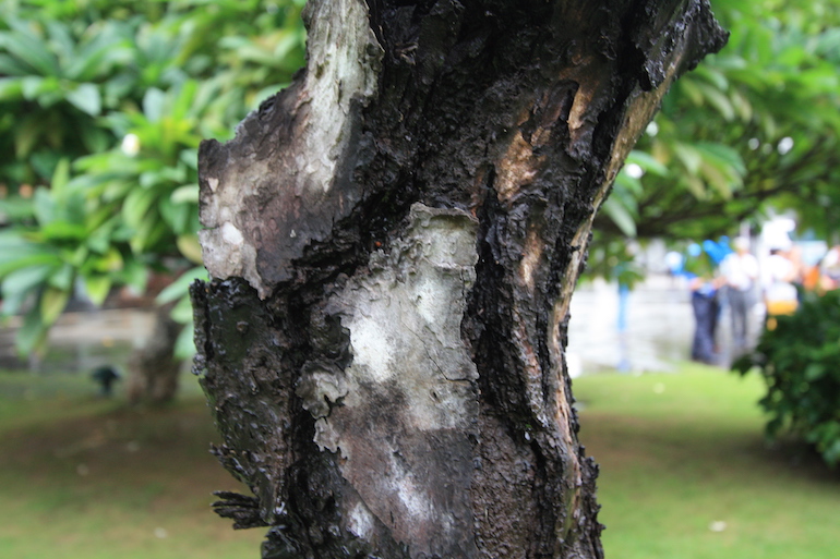 - The bark is thick and greyish brown in colour and scaly plated at the base of the trunk whilst flaking higher with an orange-red thin bark plate