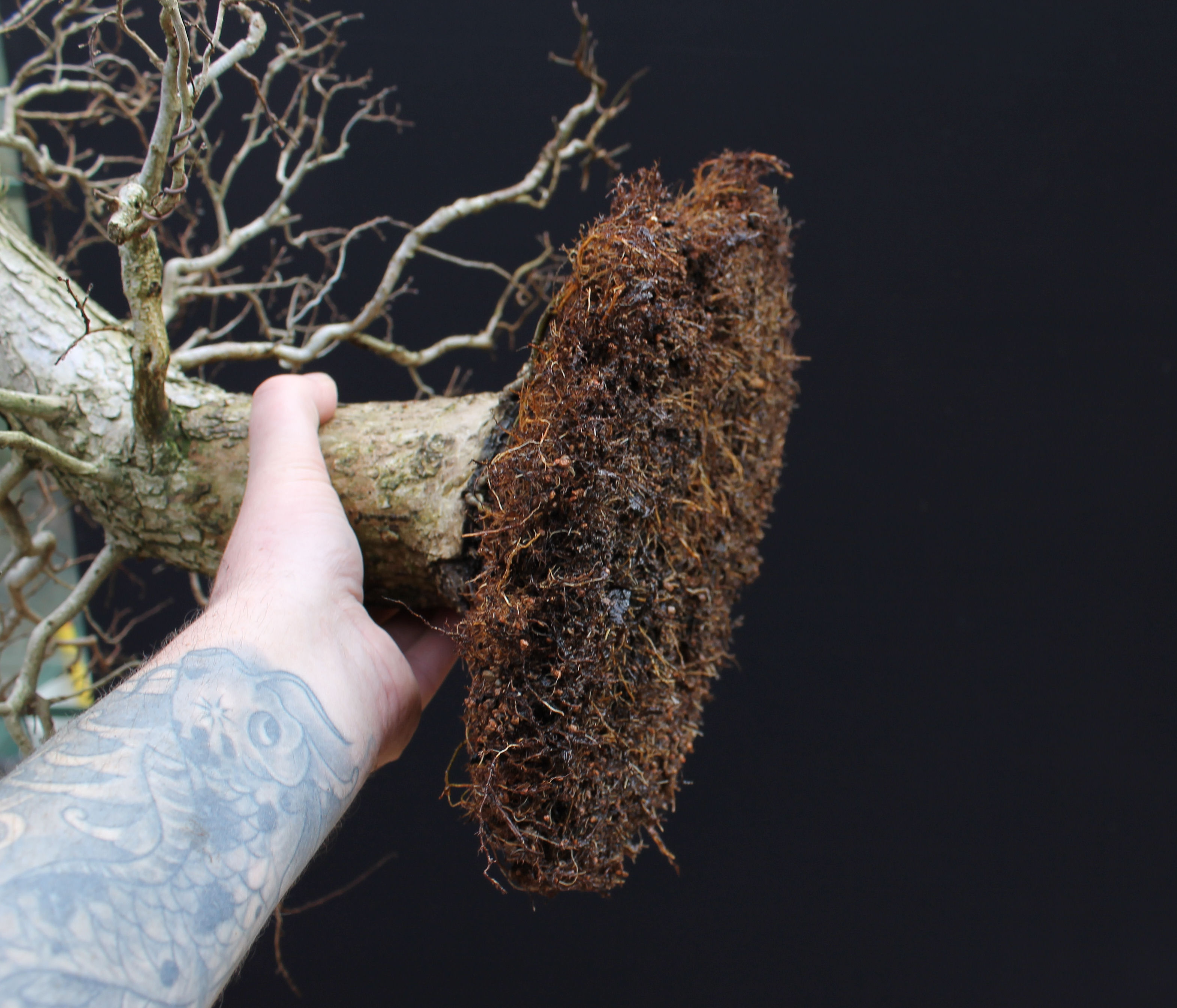 This tree features on the front cover and inside of his book “Bonsai Inspirations 1“. This tree and a number of other stumps came from a hedge on the England/Wales border (in Shropshire) that had to be grubbed-up to make way for building work in August 2004. The tree had been part of a hedge running alongside an old school in Shrewsbury for decades and survived demolition of the school to make way for a new housing estate in the 1970’s.