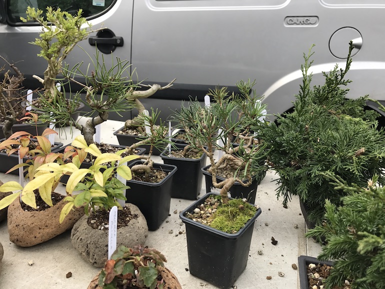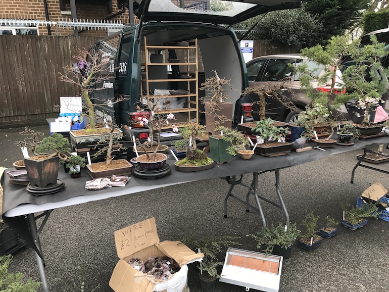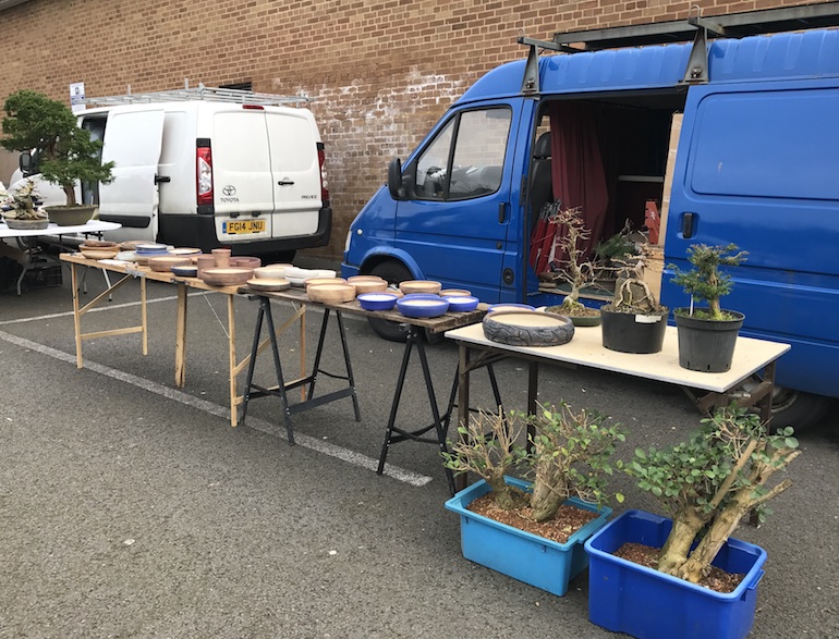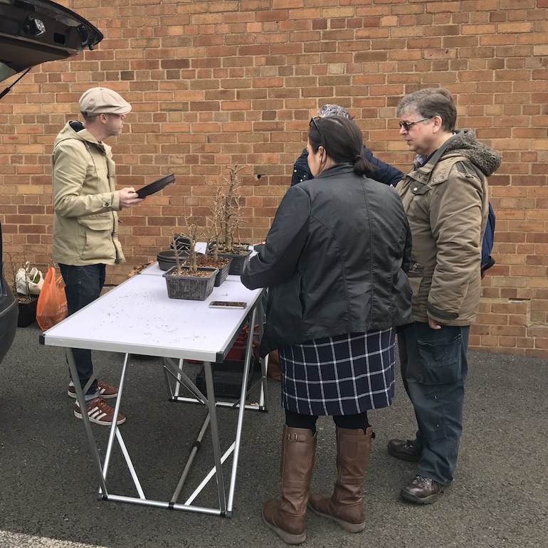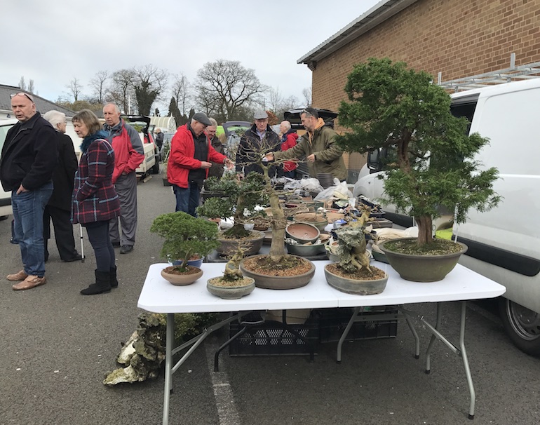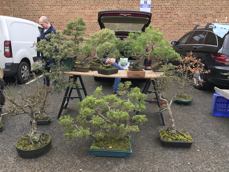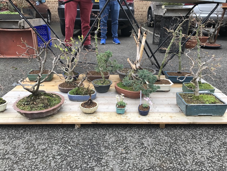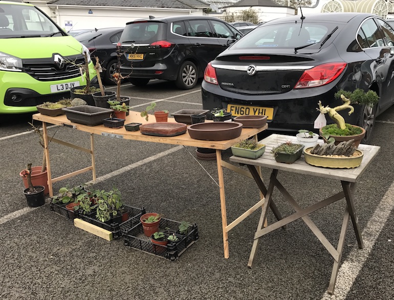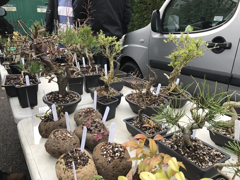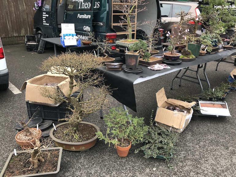 The Bonsai Boot Sale at Birmingham Botanical Gardens was a well attended event today coniciding with the Federation of British Bonsai Societies (FoBBS) Annual General Meeting (AGM). There was a good selection of bonsai on sale of all price ranges and some bargains to be had. There were trees of all sizes from established bonsai to collected material and some funky mame twisted Larch which had to be bought to add to the ever growing collection. Here are some images of the event to show you the selection of trees and other bonsai items on sale. It was good to see so many bonsai friends and have an opportunity to shop for bonsai in a great setting at the botanical gardens.