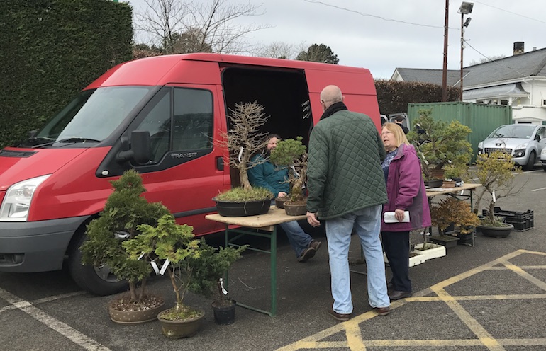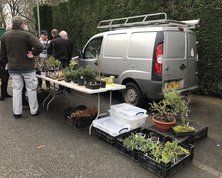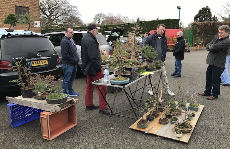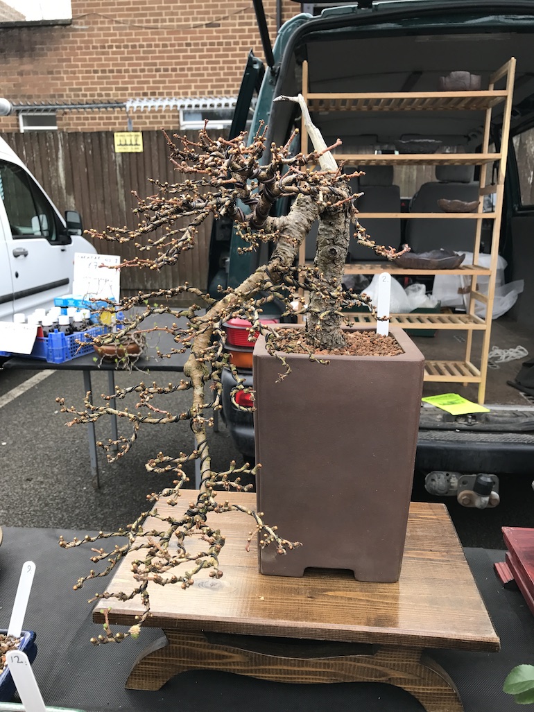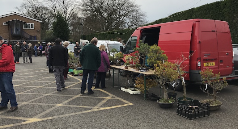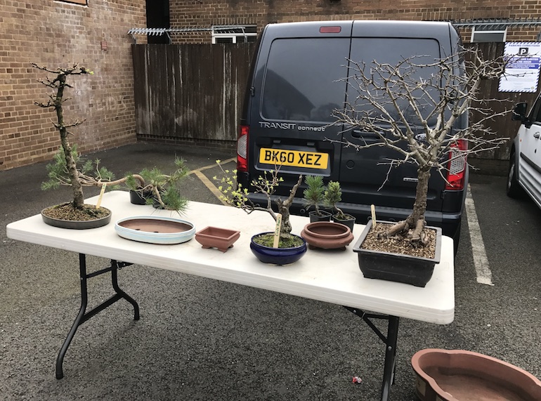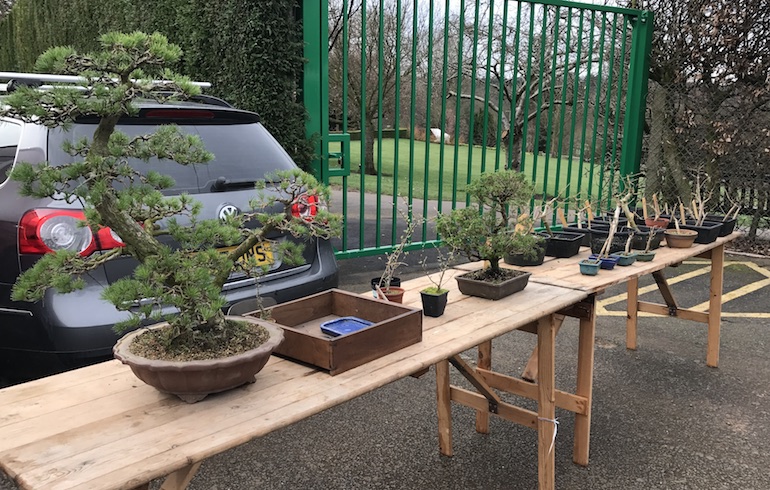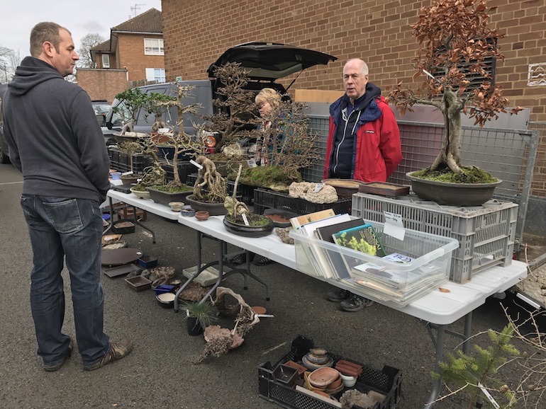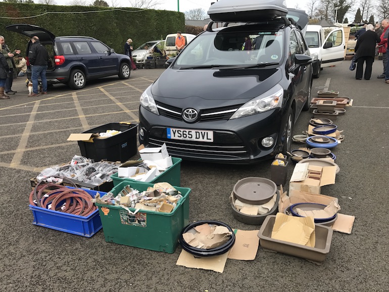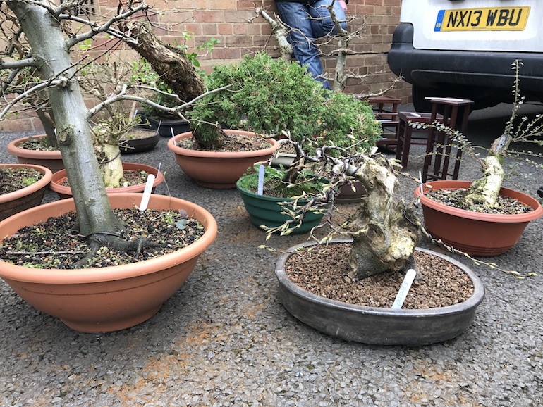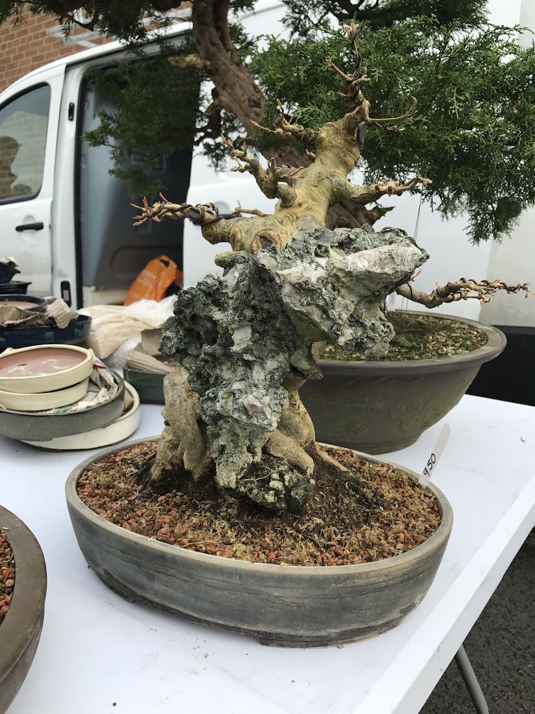 The Bonsai Boot Sale at Birmingham Botanical Gardens was a well attended event today coniciding with the Federation of British Bonsai Societies (FoBBS) Annual General Meeting (AGM). There was a good selection of bonsai on sale of all price ranges and some bargains to be had. There were trees of all sizes from established bonsai to collected material and some funky mame twisted Larch which had to be bought to add to the ever growing collection. Here are some images of the event to show you the selection of trees and other bonsai items on sale. It was good to see so many bonsai friends and have an opportunity to shop for bonsai in a great setting at the botanical gardens.