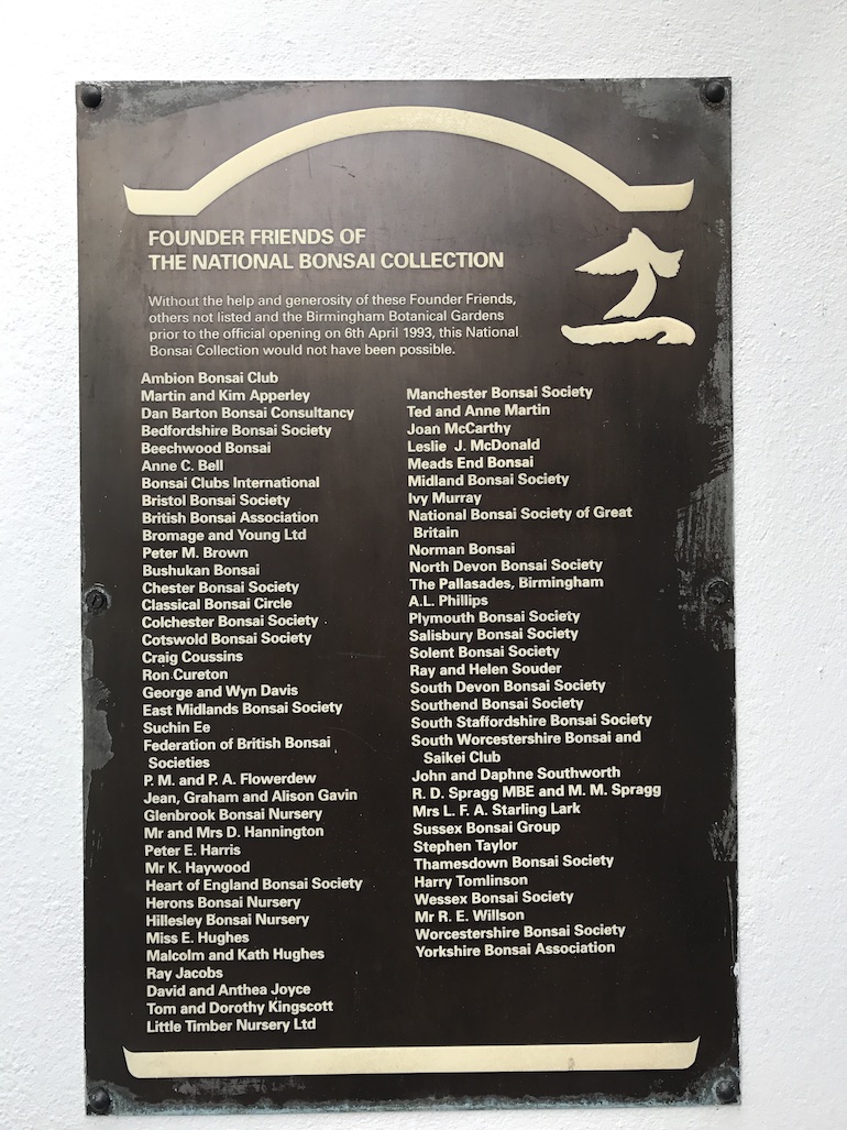 Following on from the Bonsai Boot Sale and FoBBS AGM it was a good opportunity to visit the National Bonsai Collection here at the Birmingham Botanical Gardens. It was originally opened in 1993 by Minister Ryuichiro Yamazaki Japanese Consul-General on behalf of the Friends of the National Bonsai Collection and the Birmingham Botanical and Horticultural Society. It is set within a glorious Japanese Garden and well worth a visit.