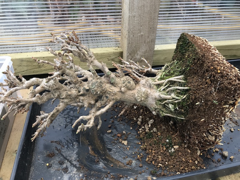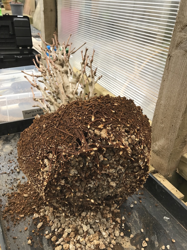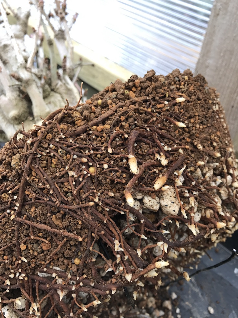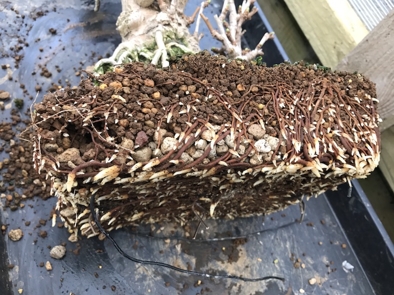 This second example with another Ginkgo, the root size changes were incredible. Such large roots within the pumice layer because of the larger air spaces. Again, good healthy roots in colour, size and density. With no dead roots within the pot or soil. The trees grow rate was very good last year and the root development has been very positive; whilst still retaining a good fibrous root pad above the larger roots within the pumice layer.