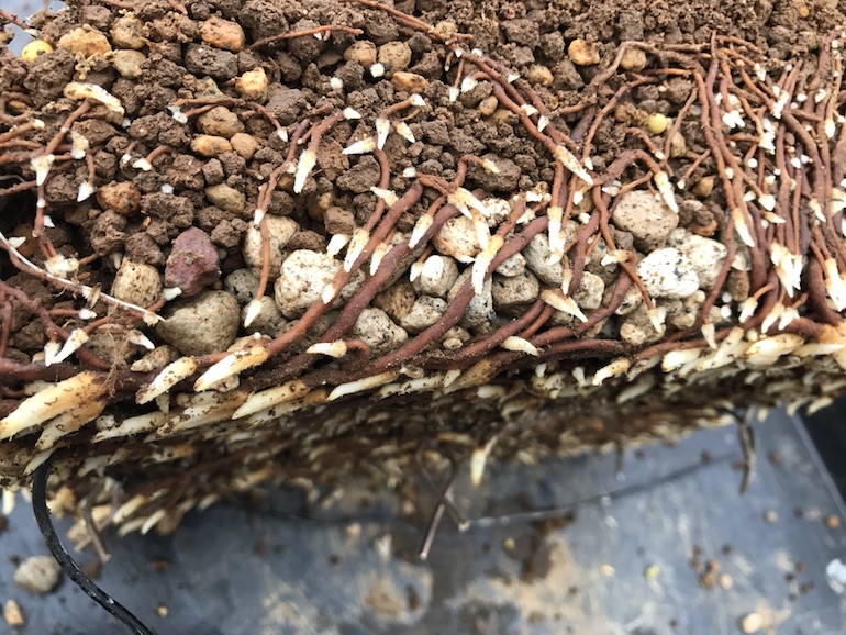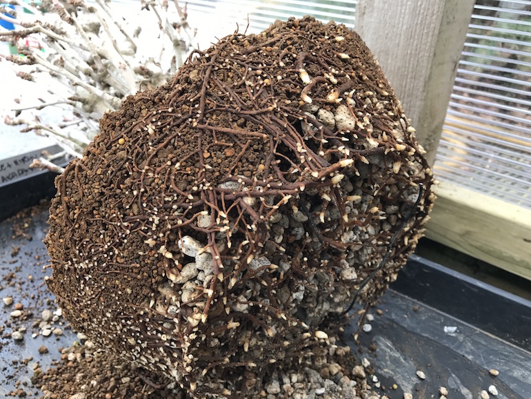 Last year I added a large pumice drainage layer to the bottom of my bonsai pot, to see what difference it would make to the root development of some of the Ginkgo bonsai trees. The soil mix used was medium to small graded Akadama with 25% Kiryu, mixed in with a layer of large pumice for (improved) drainage. The results were that the roots within the smaller grade Akadama / Kiryu mix were smaller and denser in formation, creating a very fibrous mat or root plate. Those growing towards the bottom of the pot within the larger pumice layer, were larger diameter roots, with even larger root tips. The health of the tree has been excellent, as previously the root development was all one and an even size. It is amazing to observe the changes to the roots – with only a minor change in soil – how healthy the overall root system is with a free draining mix.