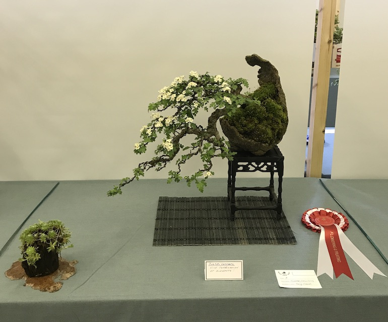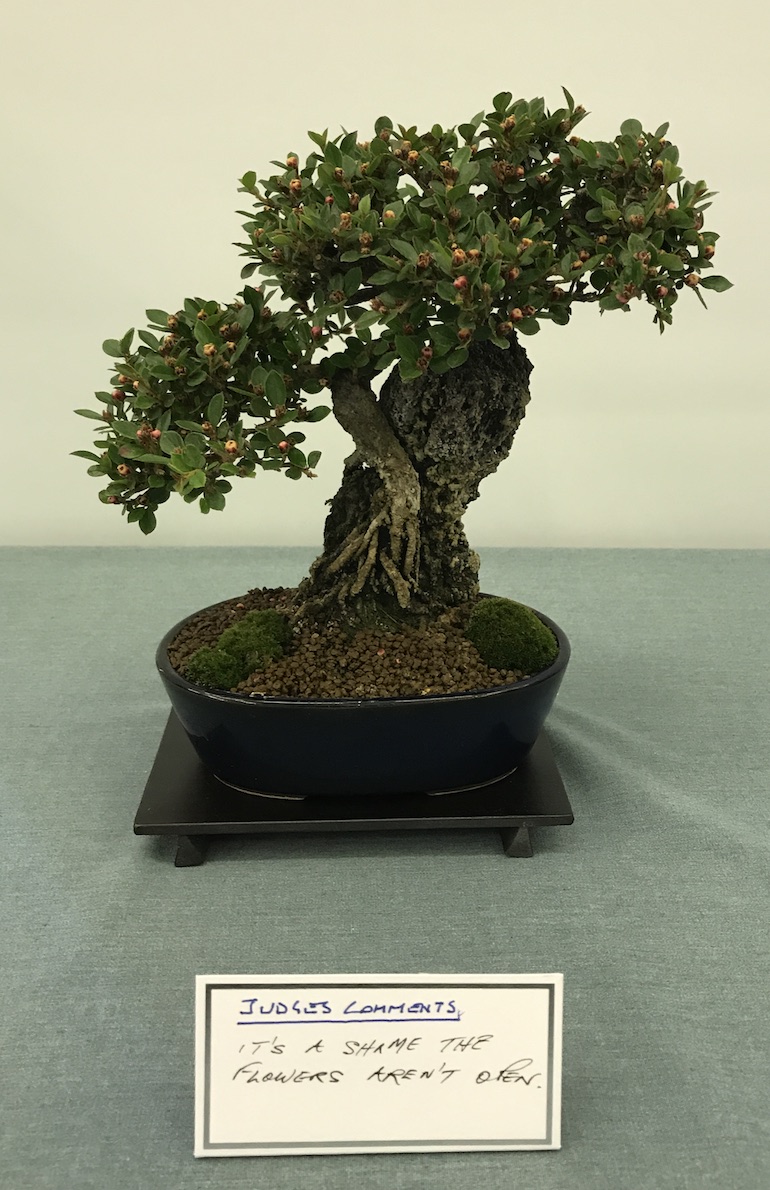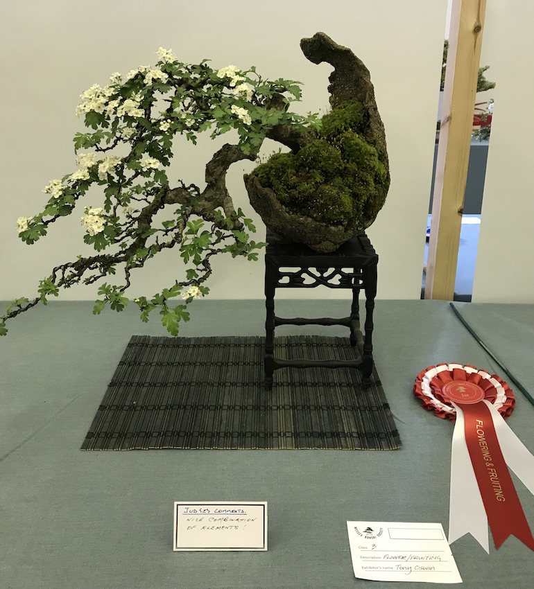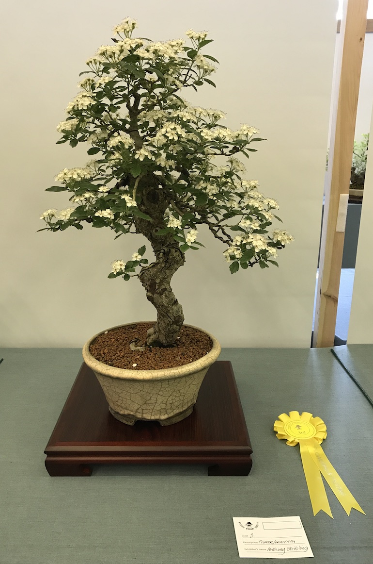 Congratulations to Tony Oswin for winning the flowering and fruiting class with his Hawthorn. Chris Jefferys came second with his Cotoneaster and in third place was Anthony Stribling with his Hawthorn.