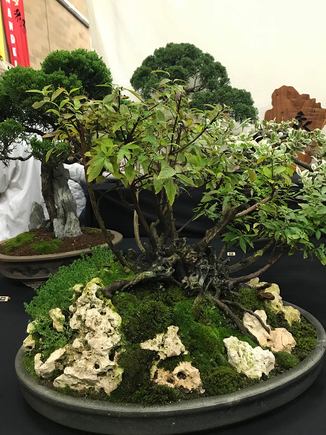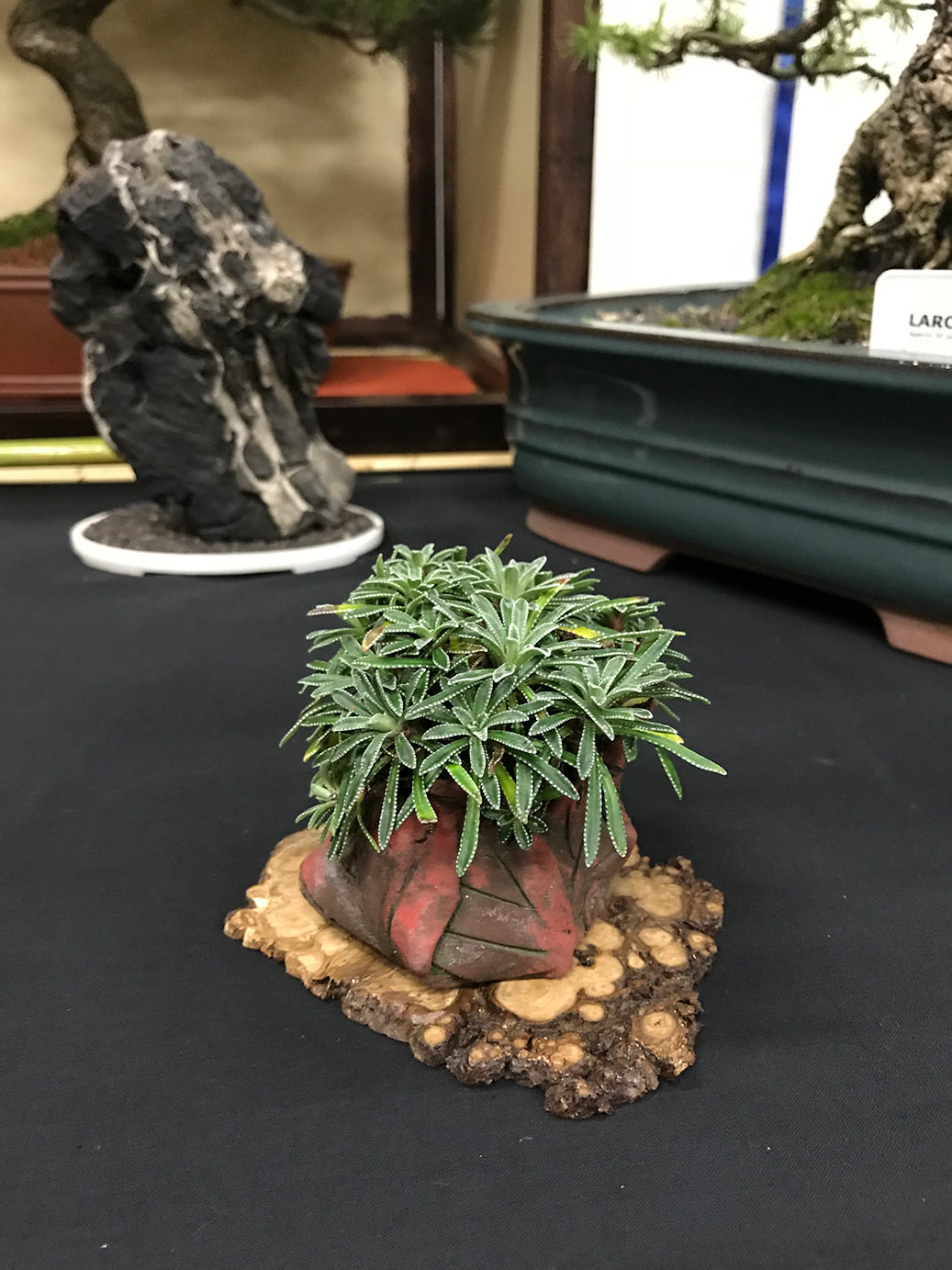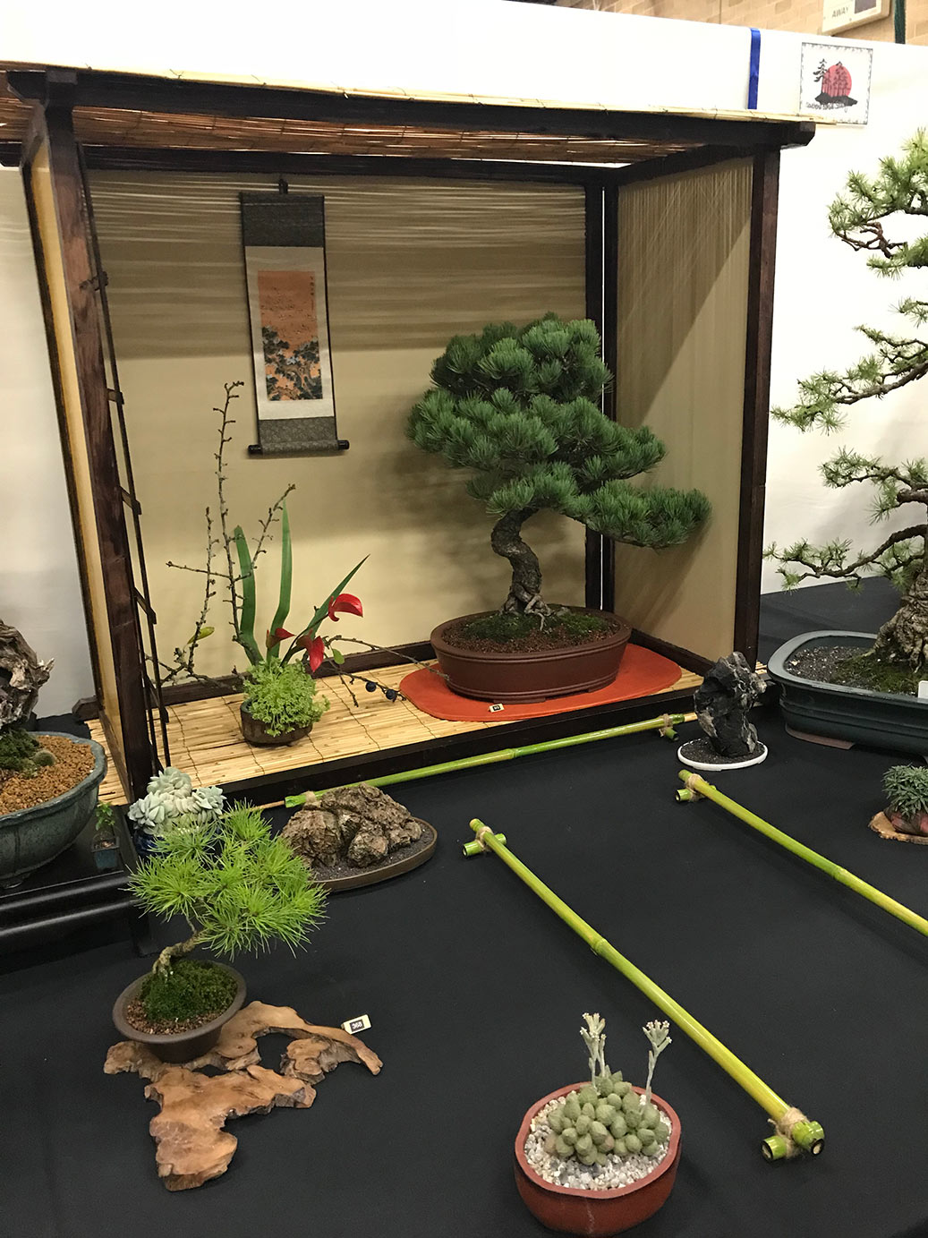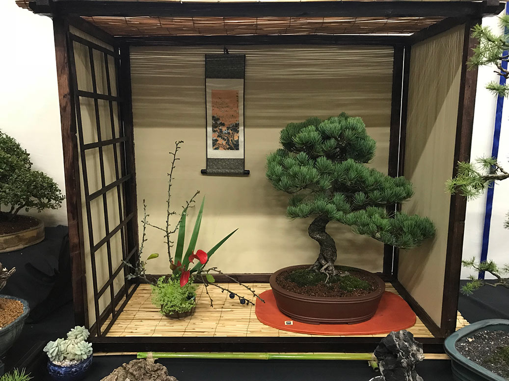Milton Keynes Bonsai Society was formed in 1986. The society aims to promote the art and appreciation of bonsai cultivation. They aim to encourage members to develop all aspects of bonsai art and utilise various methods such as monthly meetings, talks by bonsai professionals and a collection of literature for use within the club. Visitors are welcome and if you are satisfied they would like to invite you to become a member. Meetings are held at 7.30pm on the second Monday of each month (except January & August) at Milton Keynes Reform Synagogue Hall, 1 Hainault Drive, Giffard Park, MK14 5PQ. They have a tea break and often a raffle. Please see their events link for upcoming meetings/events on their facebook page. They put on a bonsai display for the first time at the 8th Heathrow Bonsai show and below are a few images of their club members display.