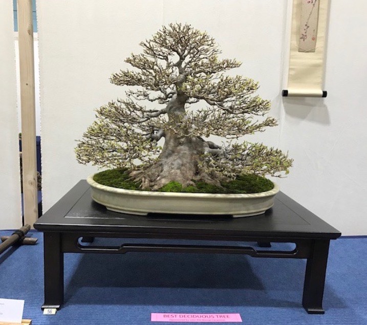 So 2017 was Steve’s second year of judging the winter image show. He judged that Mark and Ritta coopers tree was the best in show. It was a decision based on these factors; the tree was stunning, with a good even nebari, from the massive base to the very tip it had an apex excellent taper, each branch was well placed, every branch also had taper from the trunk to end of each branch There was no crossing branches and the tree was well ramified. Minor points were noted also, the tree was well presented, clean with good moss. A beautiful contrasting pot, complimented with a nice table and accompanying plant and seasonal scroll made it a very harmonious exhibit of the highest quality.