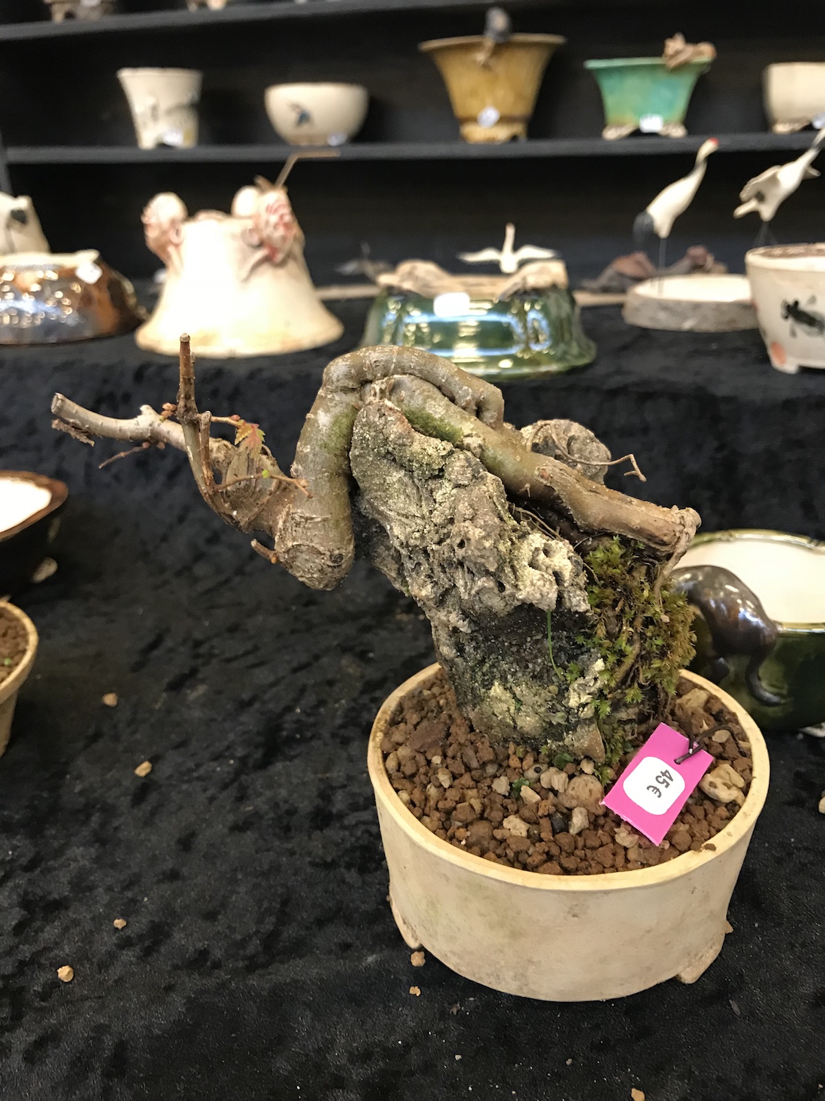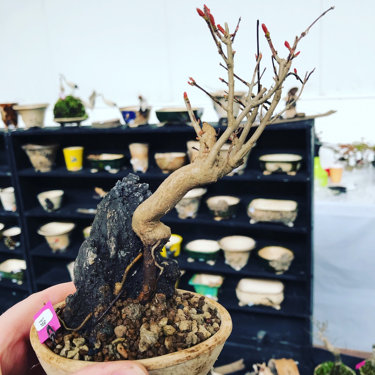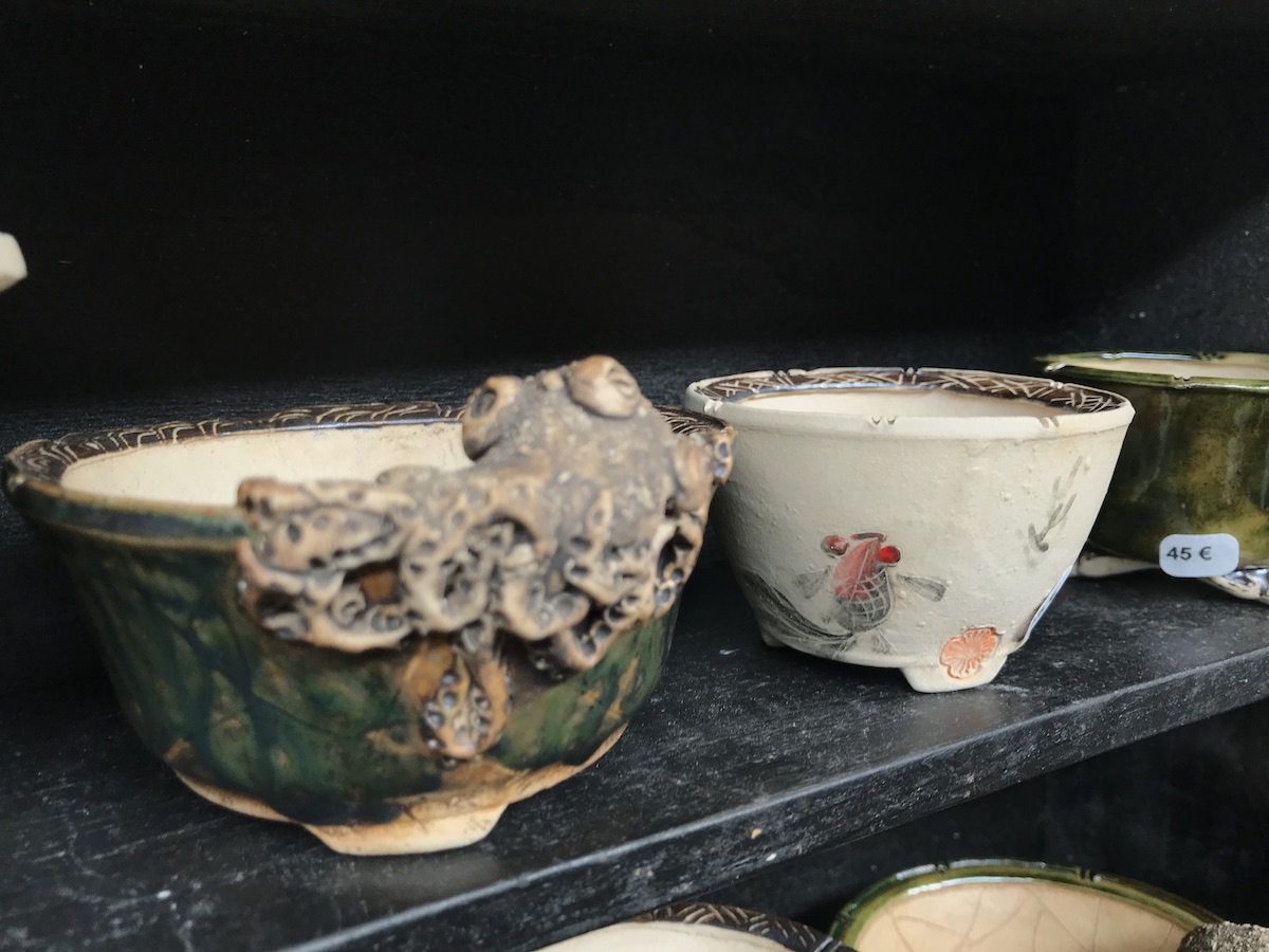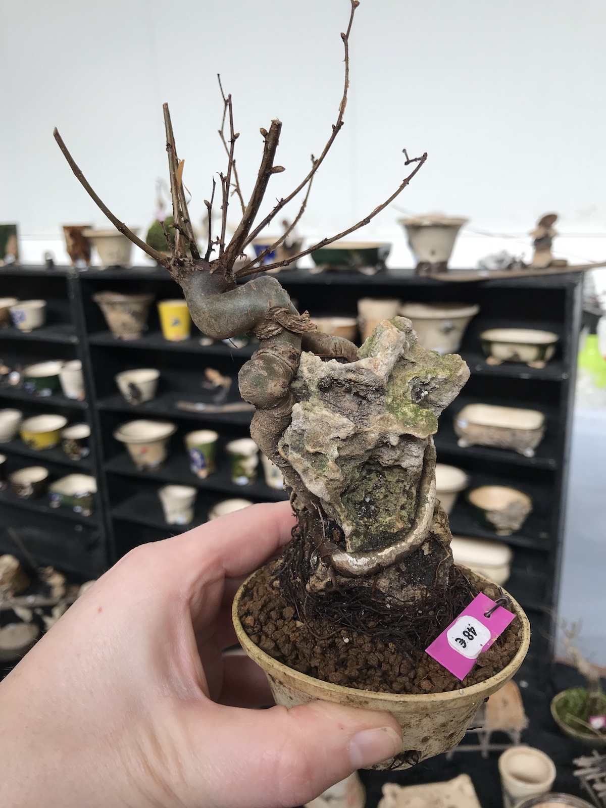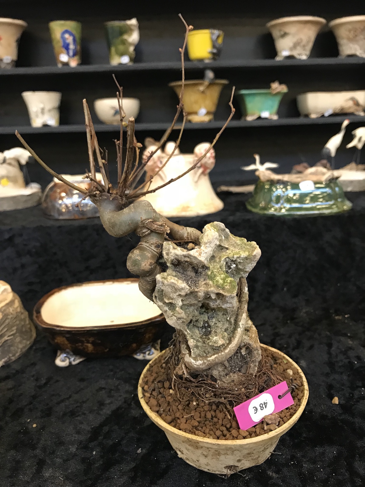 One trader who caught my eye and interest this weekend at the Lodder Bonsai open weekend was Lotus Bonsai Studio. Wow was my first impression to his stunning pots with such artistic flare and detail, they were wonderful. In addition he had some exquisite mame bonsai over rocks which has inspired me to have a go at creating some myself as well as making a purchase of a ready made one.
