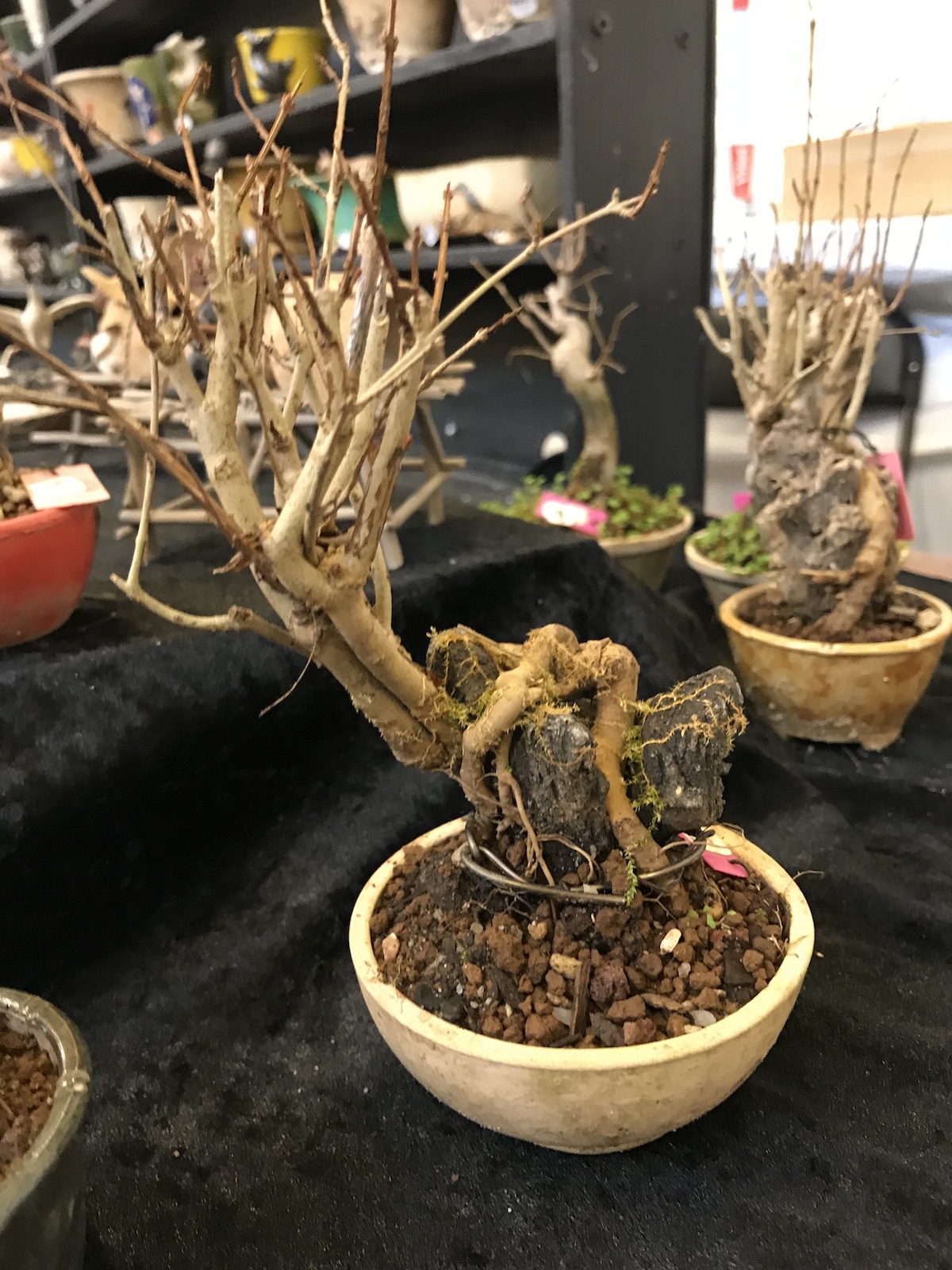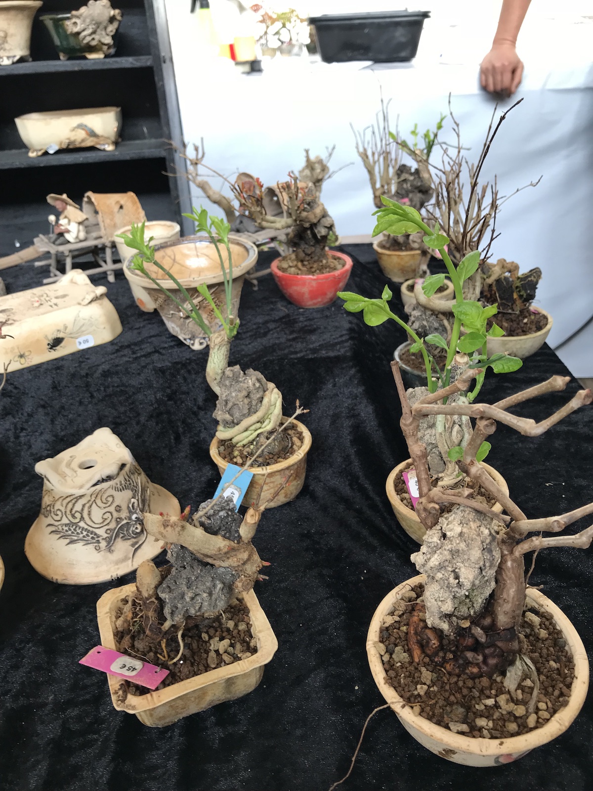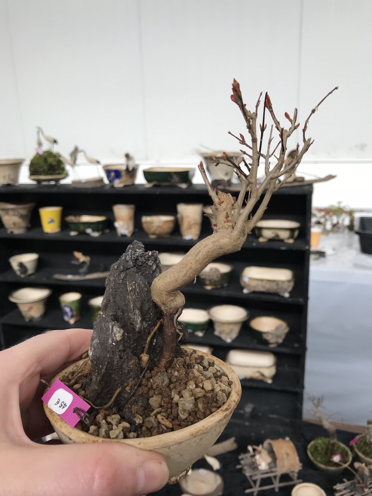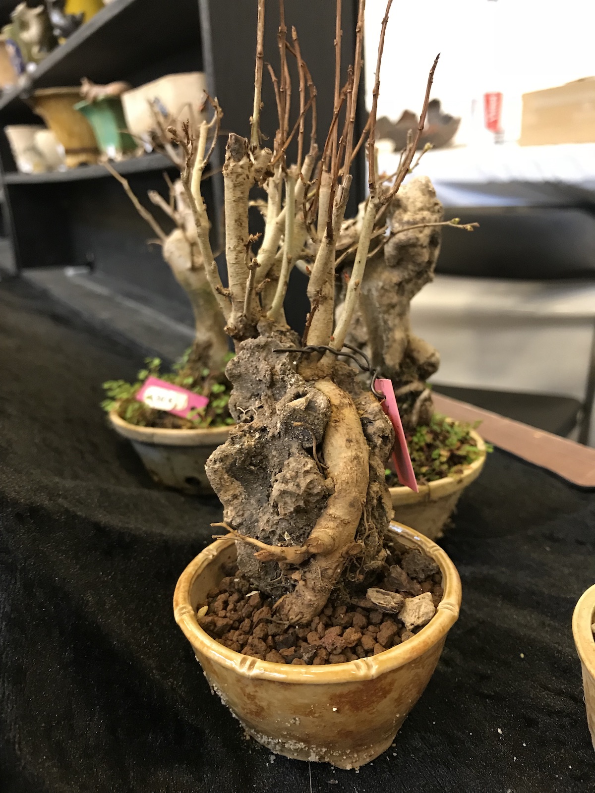 One trader who caught my eye and interest this weekend at the Lodder Bonsai open weekend was Lotus Bonsai Studio. Wow was my first impression to his stunning pots with such artistic flare and detail, they were wonderful. In addition he had some exquisite mame bonsai over rocks which has inspired me to have a go at creating some myself as well as making a purchase of a ready made one.