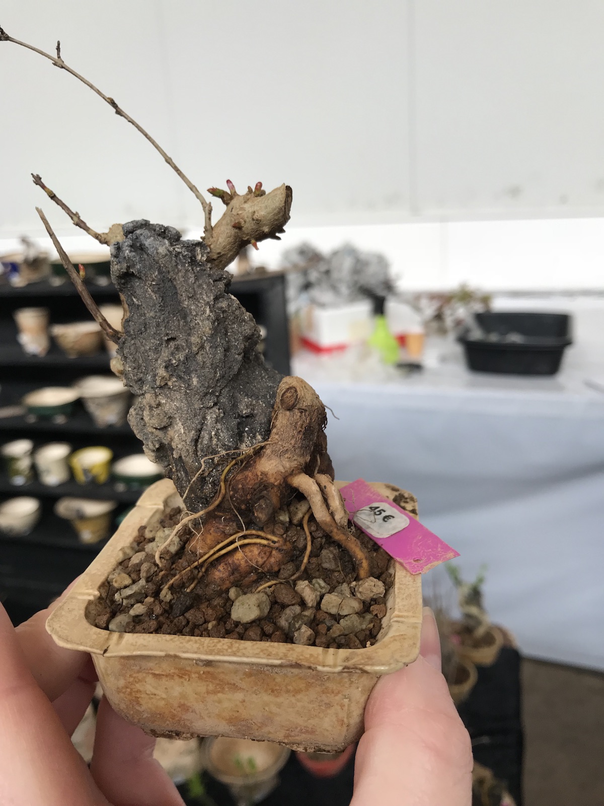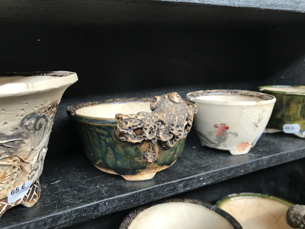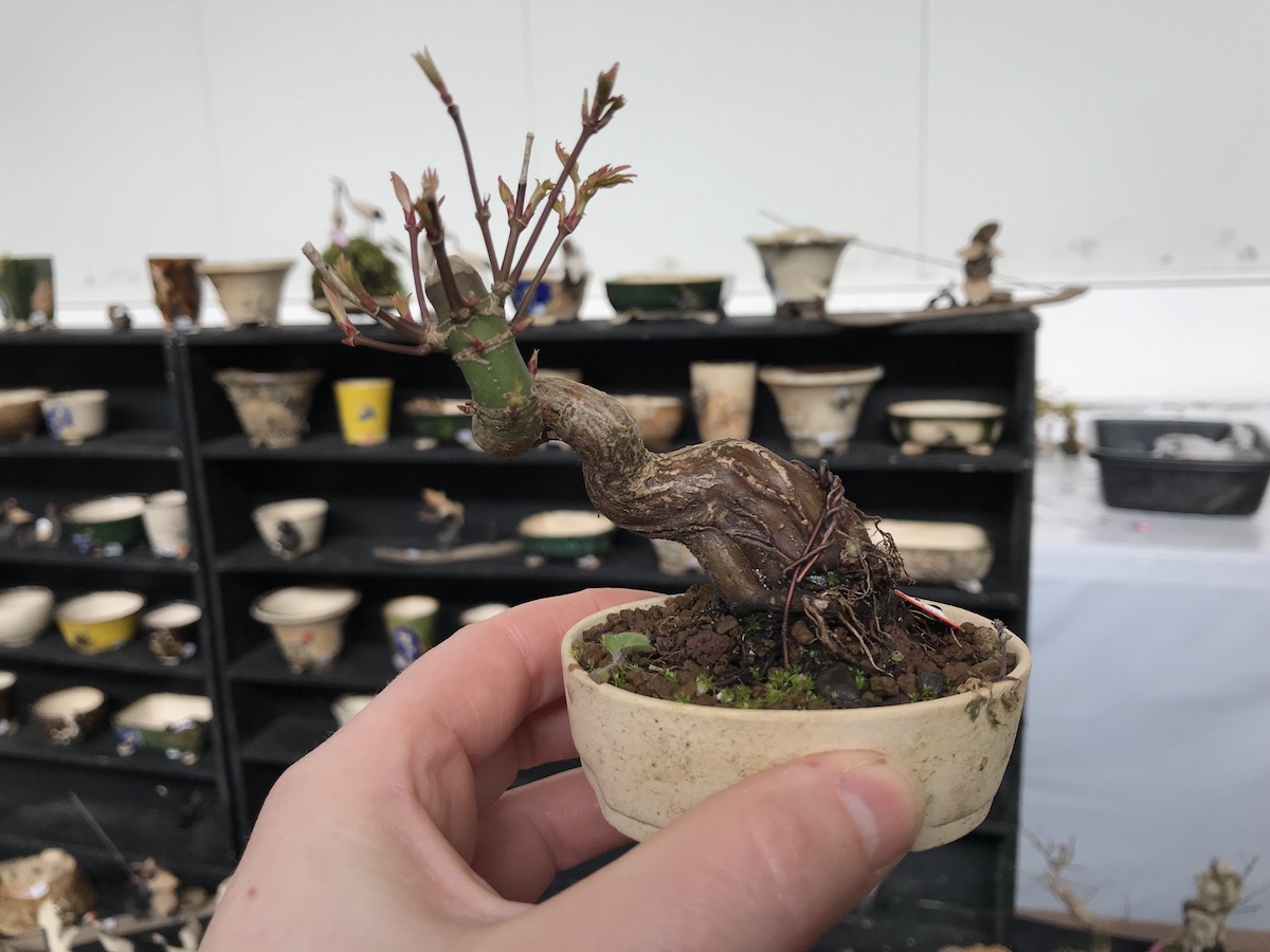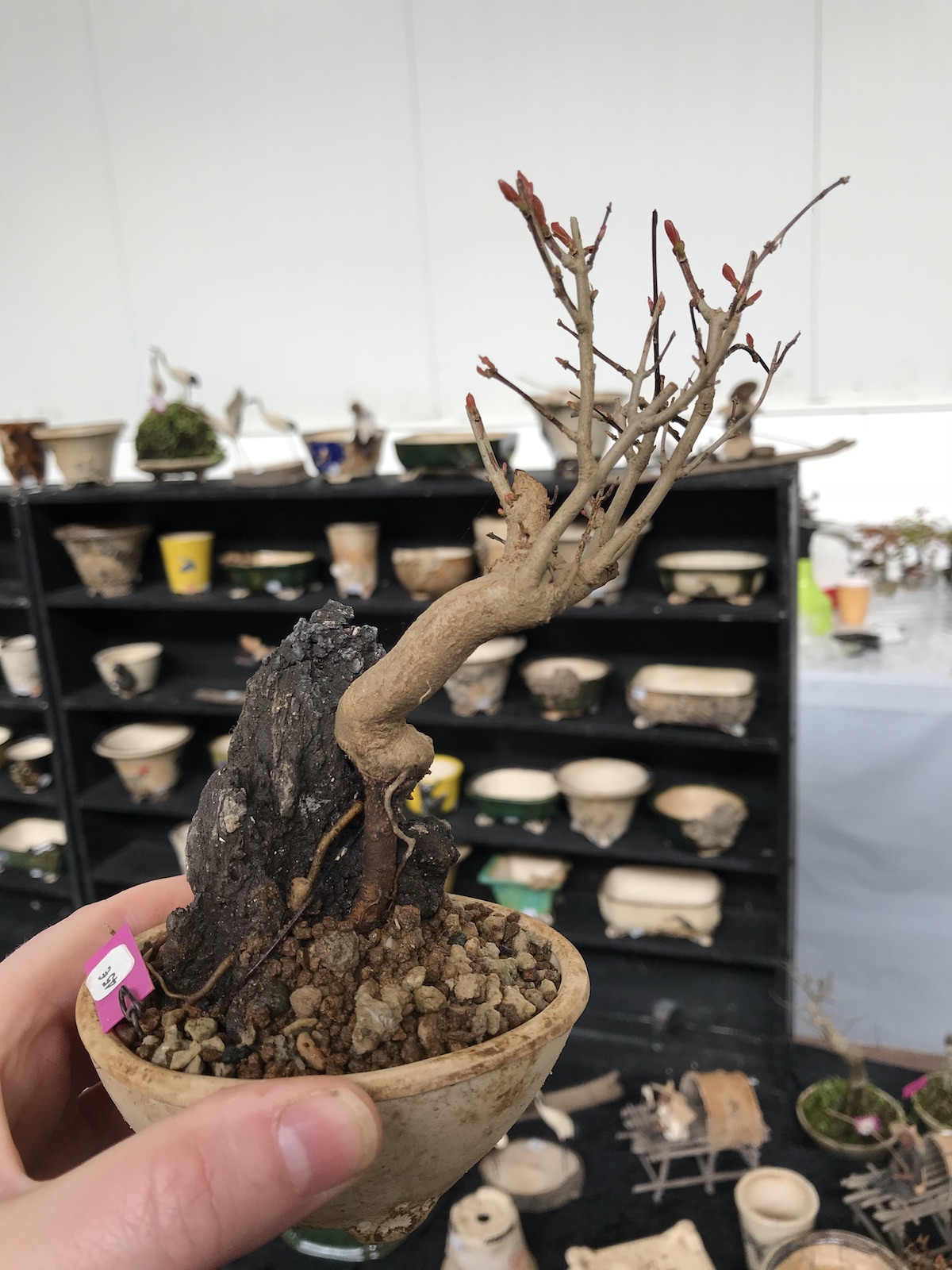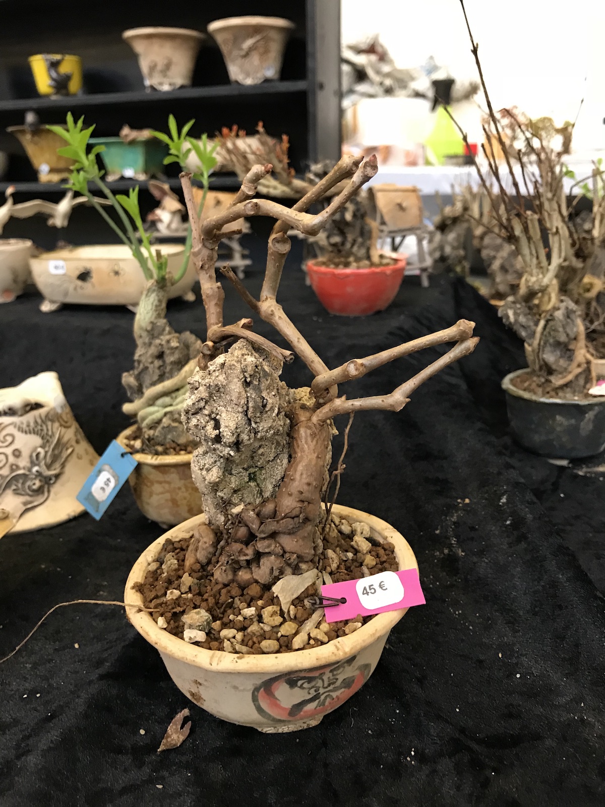 One trader who caught my eye and interest this weekend at the Lodder Bonsai open weekend was Lotus Bonsai Studio. Wow was my first impression to his stunning pots with such artistic flare and detail, they were wonderful. In addition he had some exquisite mame bonsai over rocks which has inspired me to have a go at creating some myself as well as making a purchase of a ready made one.