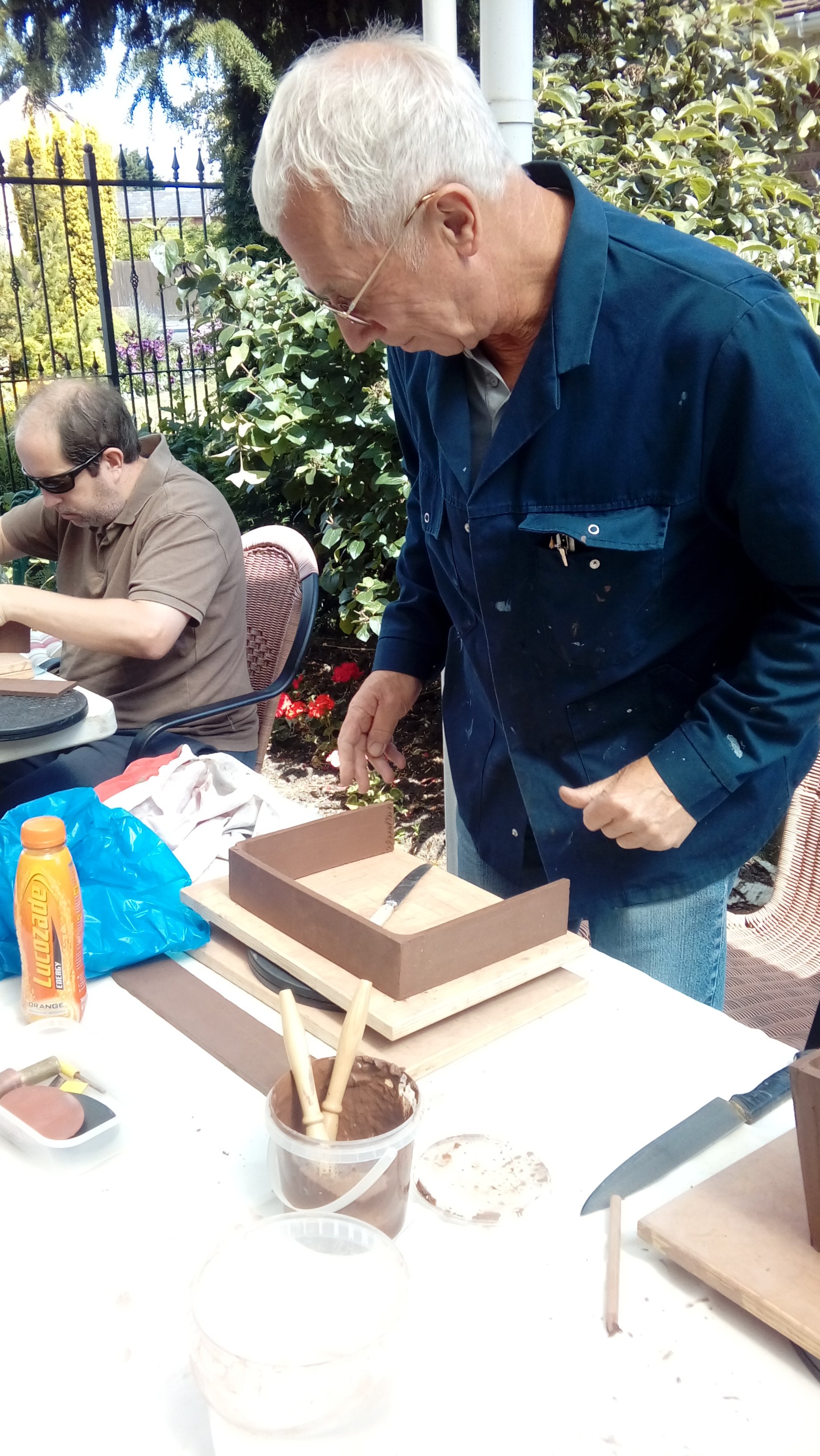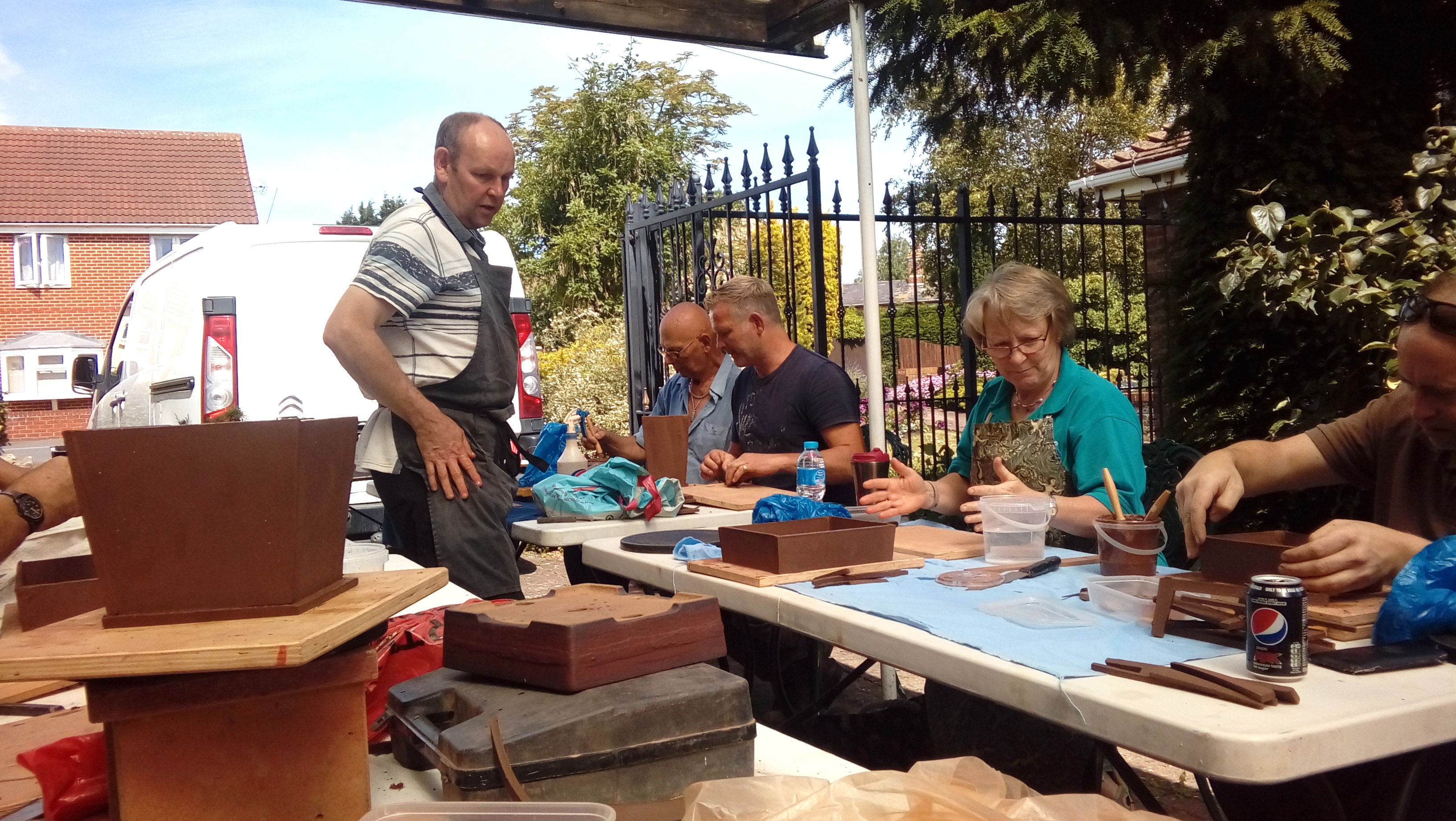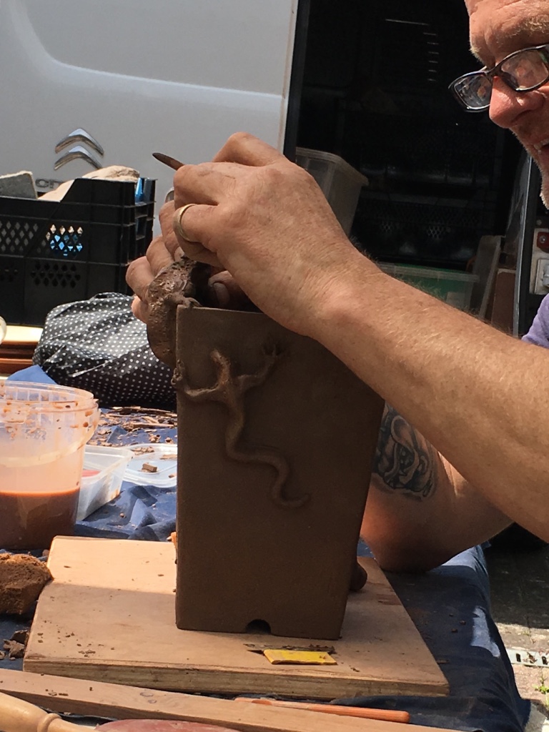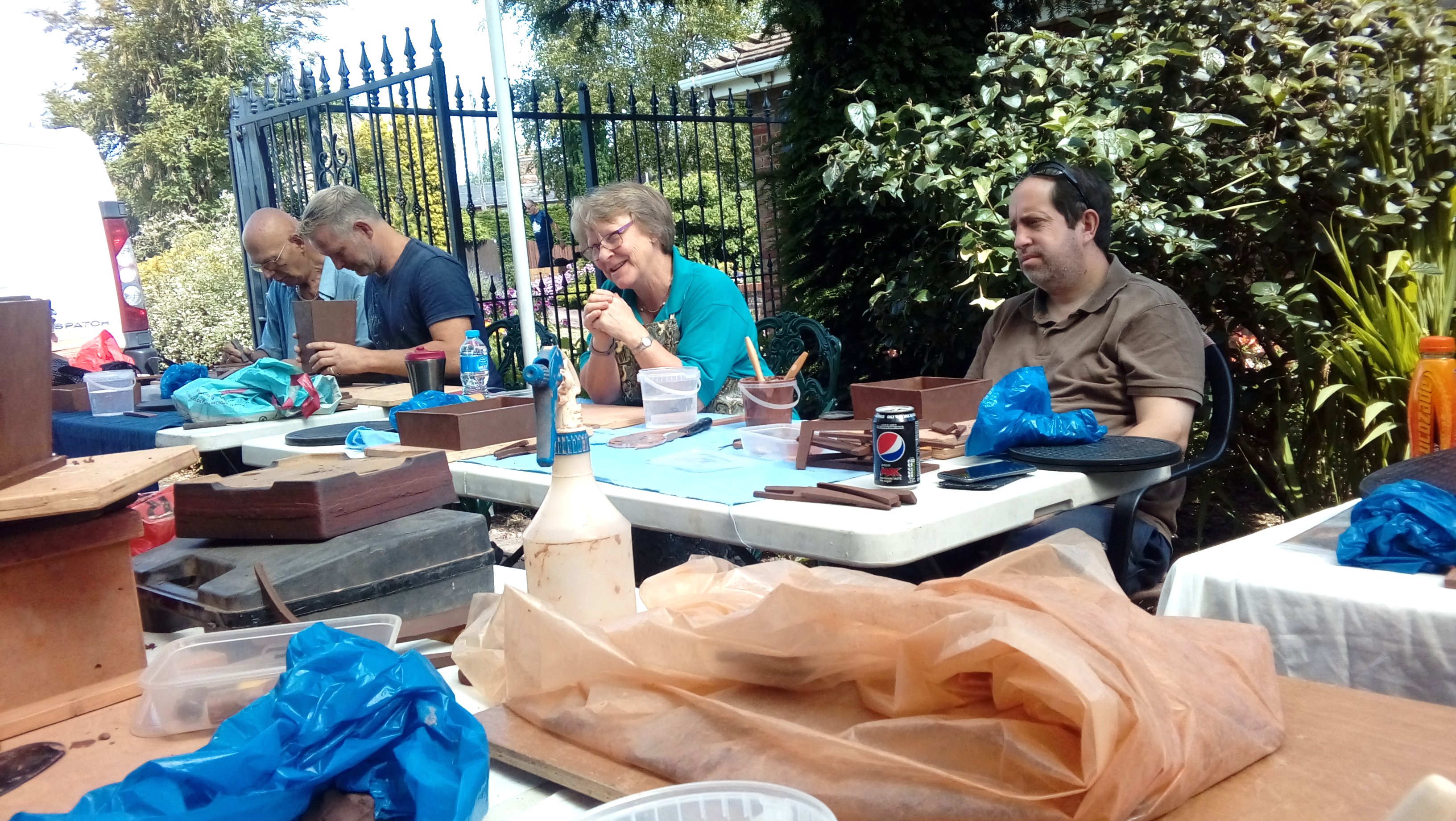 Again we were joined by David Jones and his helper for the day, Charlotte Walby for an all day pottery workshop. It was a lovely warm day, in fact too warm which meant that everyone had to work faster in their pot making before the clay became too dry. The pots in the end looked great with some additions added by the owners to embellish them. It was difficult to photograph all the pots before David had wrapped them up for the return journey to Walsall Towers, where he will check them over, sort out any things that need doing and then he has the task of glazing them and firing them. I am not sure how Paul managed to do his with the shades on, maybe he does a better job with his eyes closed????