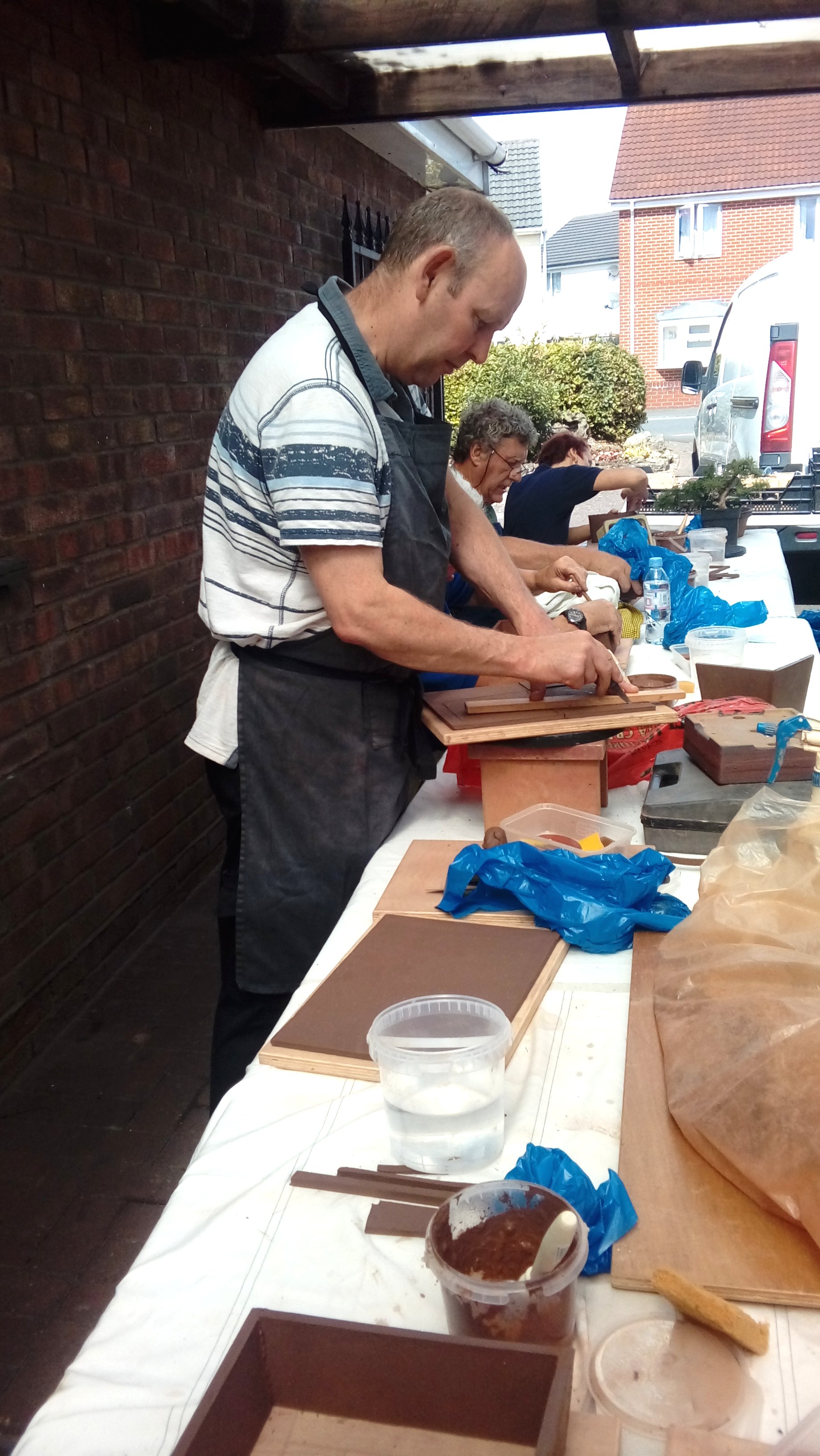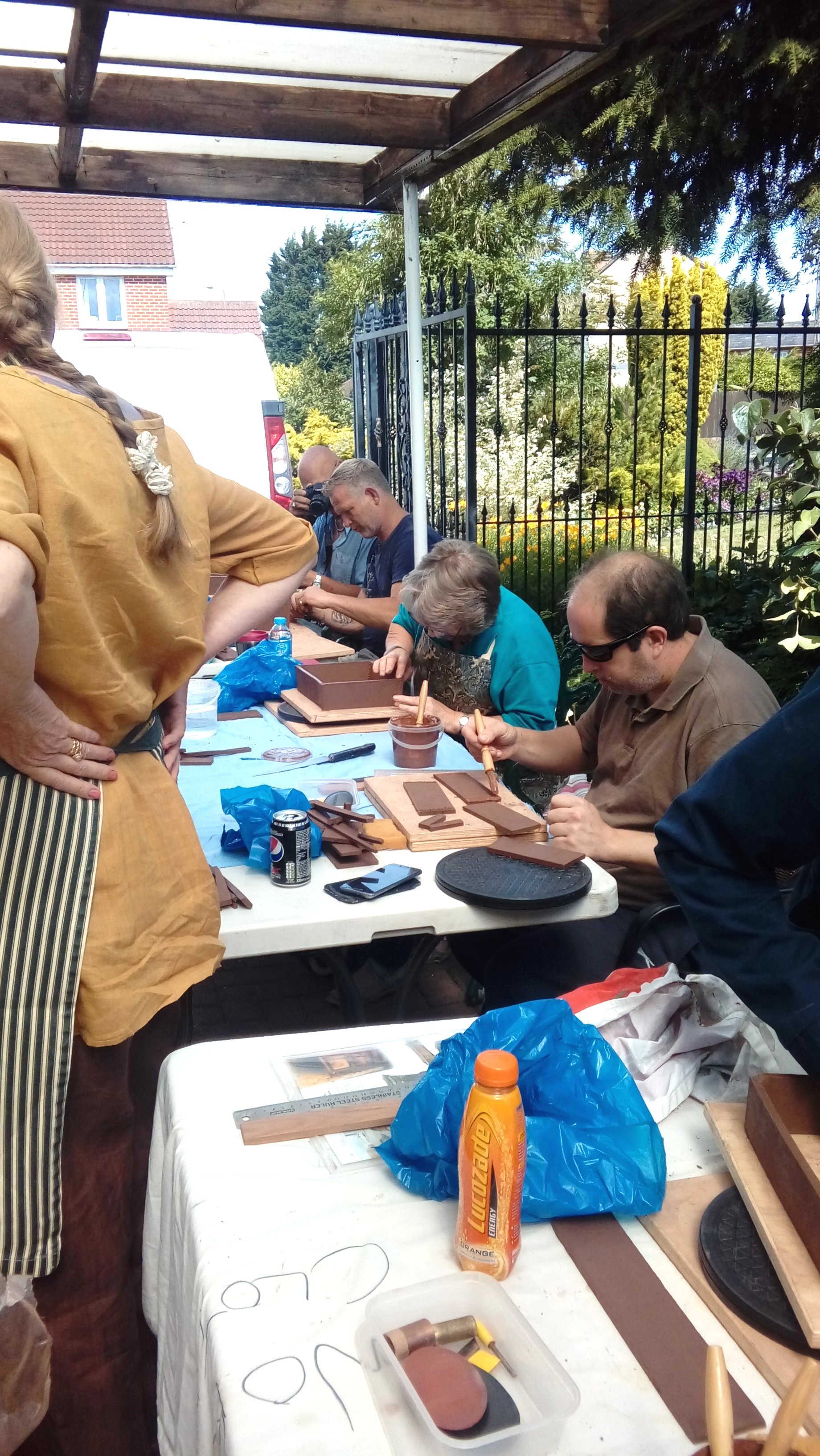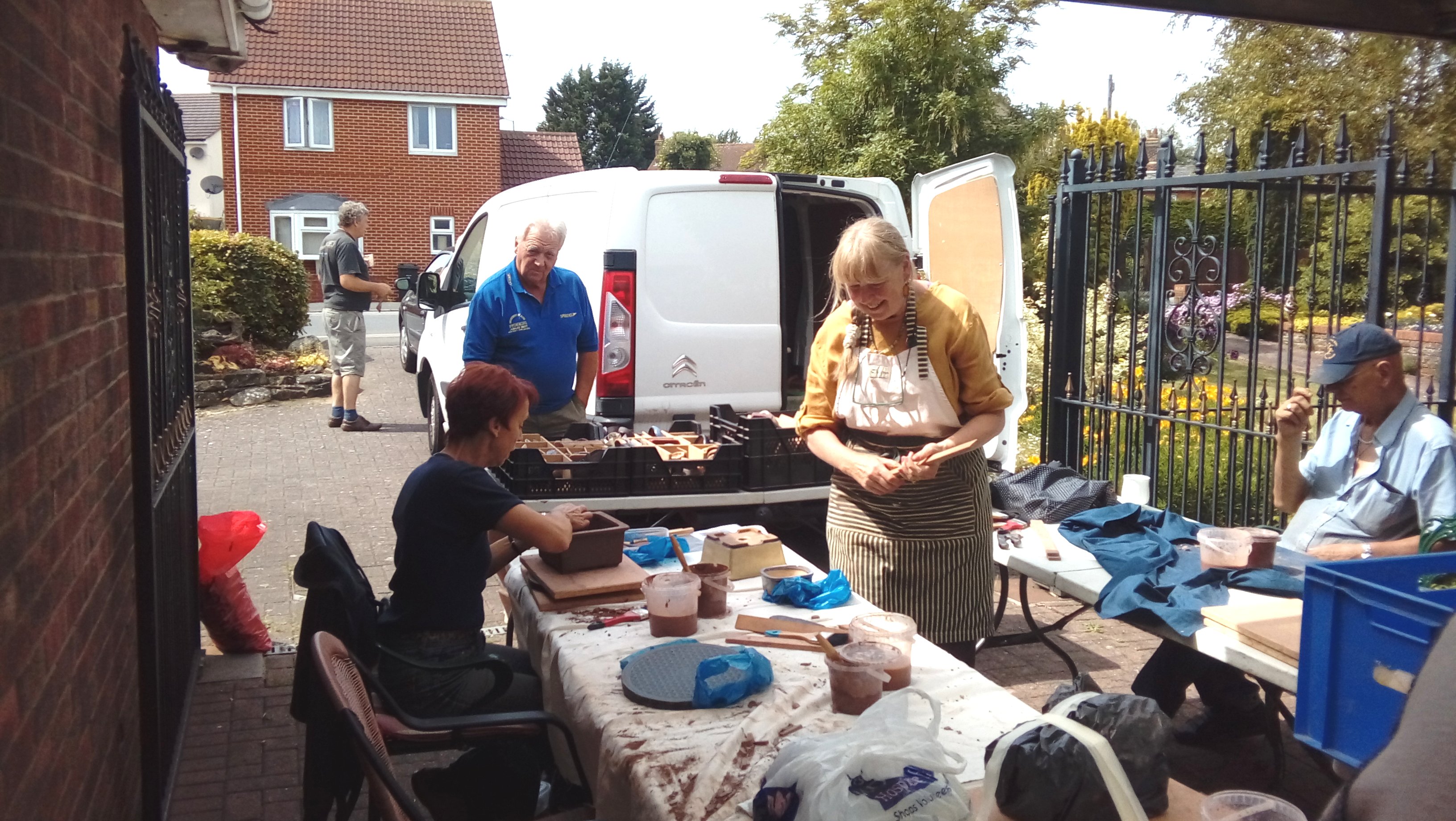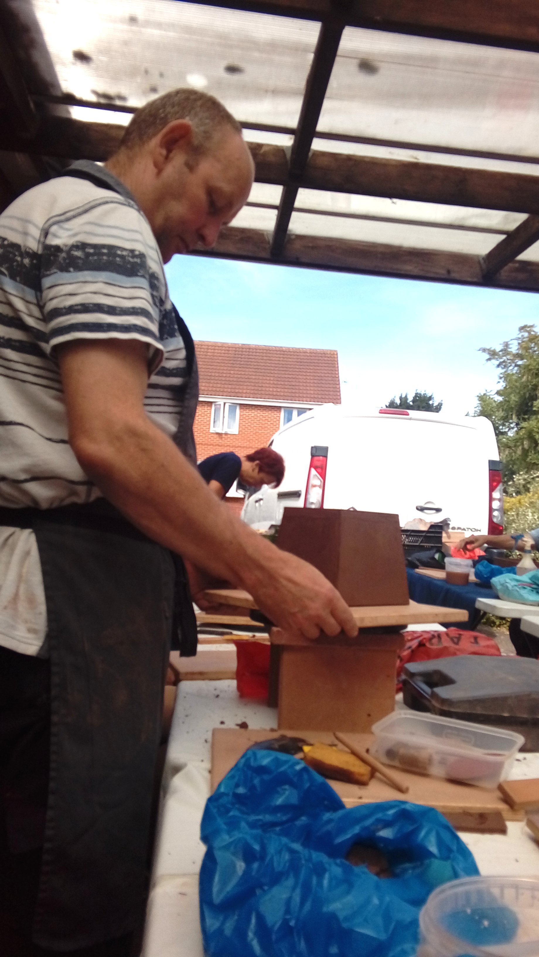 Again we were joined by David Jones and his helper for the day, Charlotte Walby for an all day pottery workshop. It was a lovely warm day, in fact too warm which meant that everyone had to work faster in their pot making before the clay became too dry. The pots in the end looked great with some additions added by the owners to embellish them. It was difficult to photograph all the pots before David had wrapped them up for the return journey to Walsall Towers, where he will check them over, sort out any things that need doing and then he has the task of glazing them and firing them. I am not sure how Paul managed to do his with the shades on, maybe he does a better job with his eyes closed????