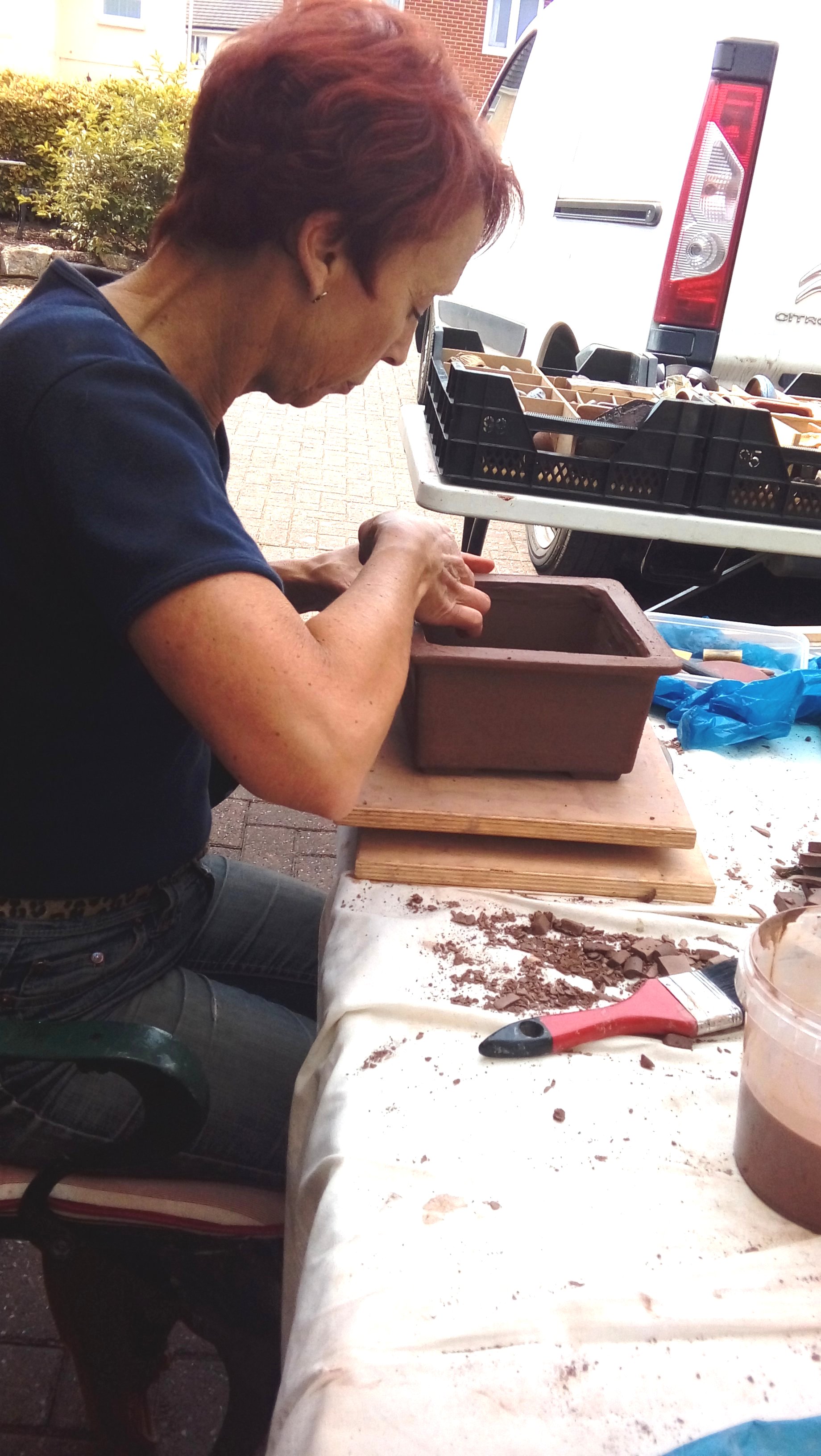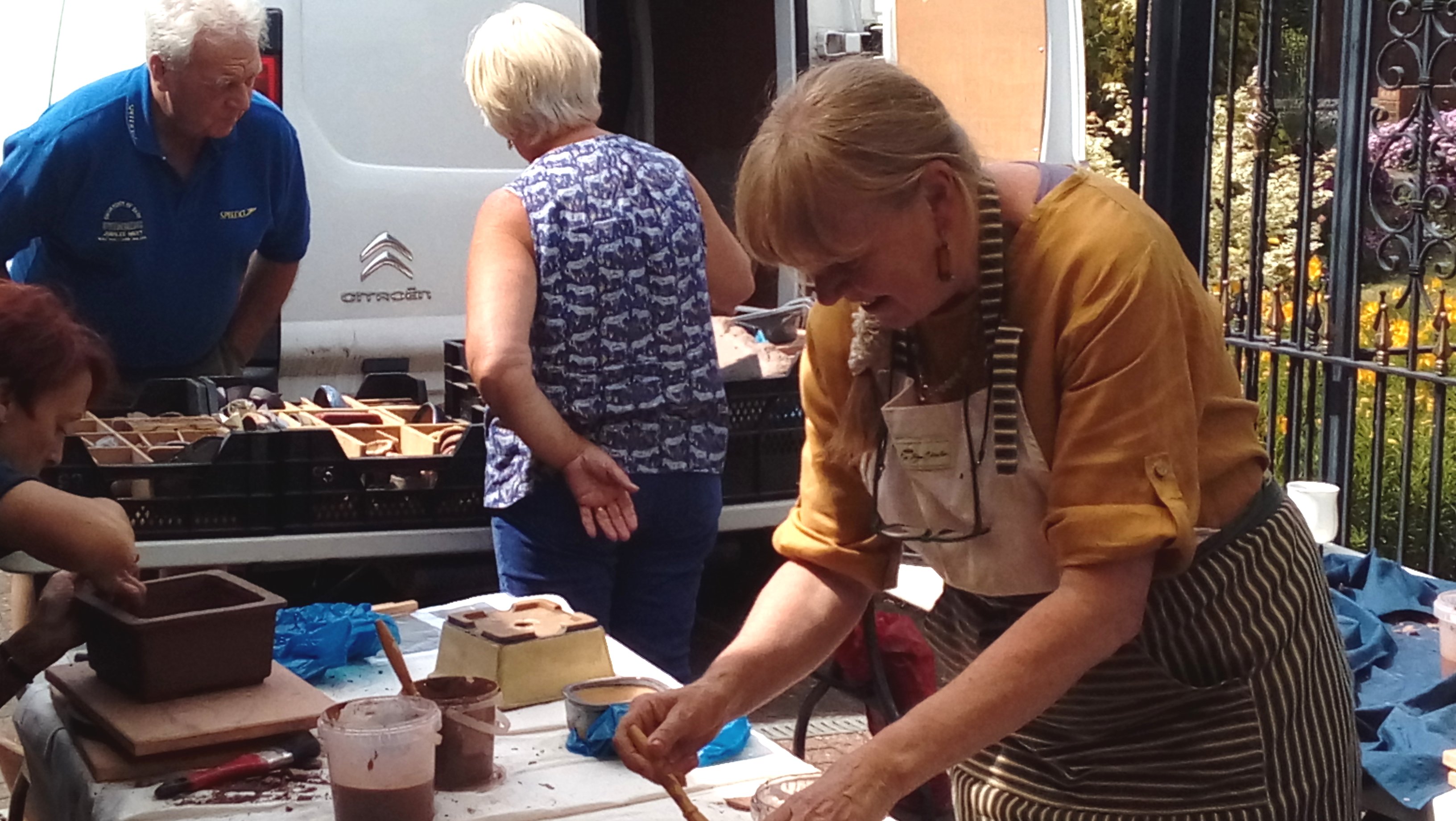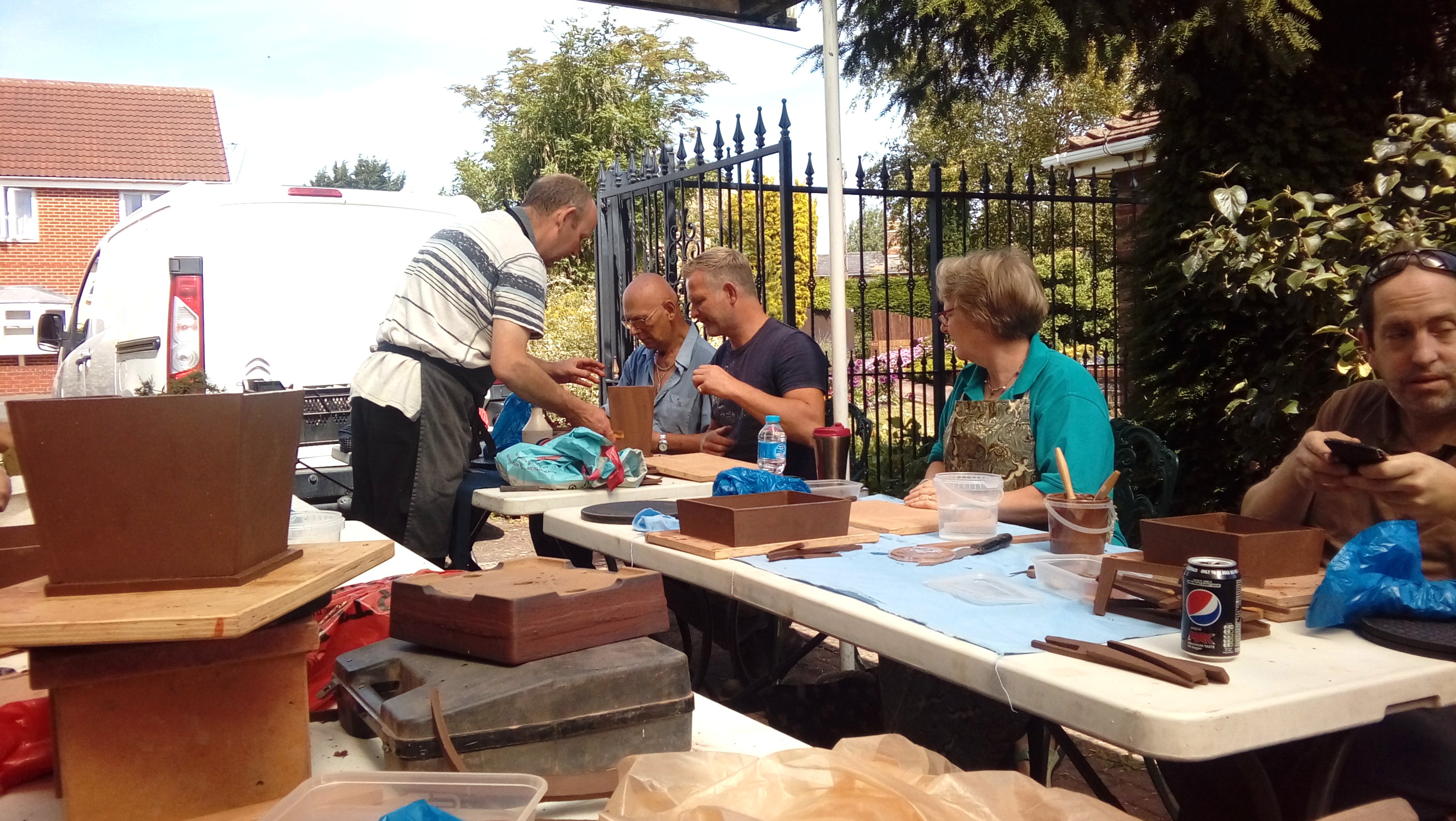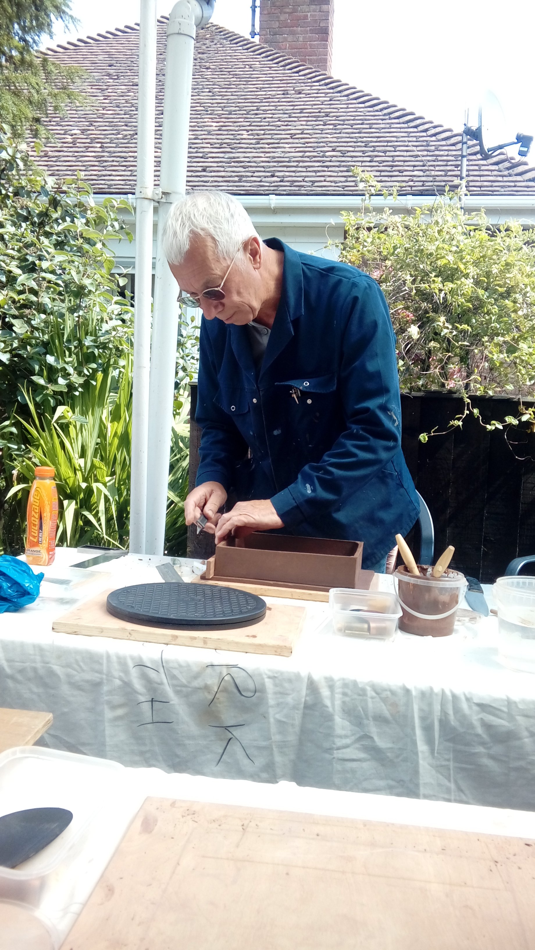 Again we were joined by David Jones and his helper for the day, Charlotte Walby for an all day pottery workshop. It was a lovely warm day, in fact too warm which meant that everyone had to work faster in their pot making before the clay became too dry. The pots in the end looked great with some additions added by the owners to embellish them. It was difficult to photograph all the pots before David had wrapped them up for the return journey to Walsall Towers, where he will check them over, sort out any things that need doing and then he has the task of glazing them and firing them. I am not sure how Paul managed to do his with the shades on, maybe he does a better job with his eyes closed????