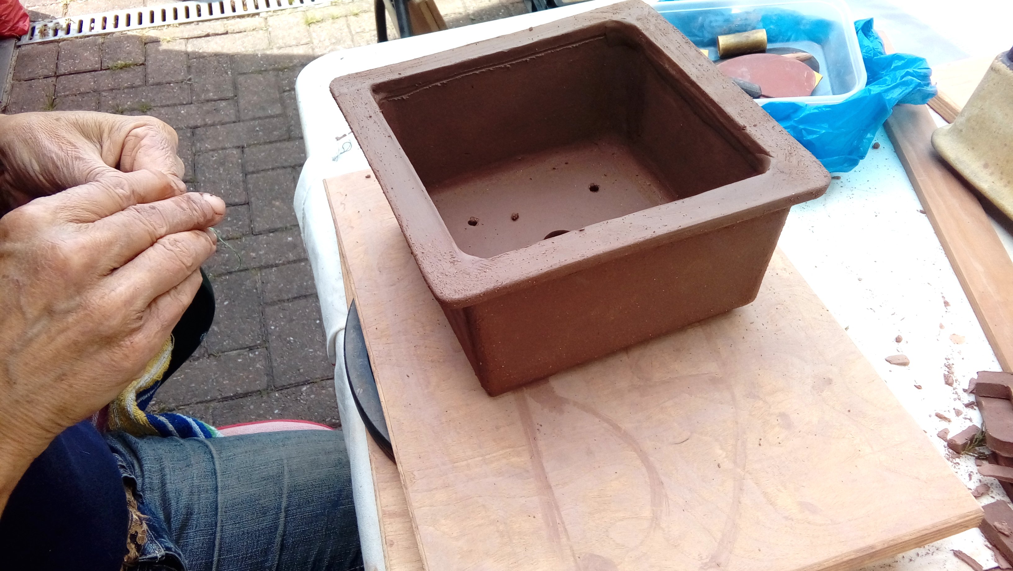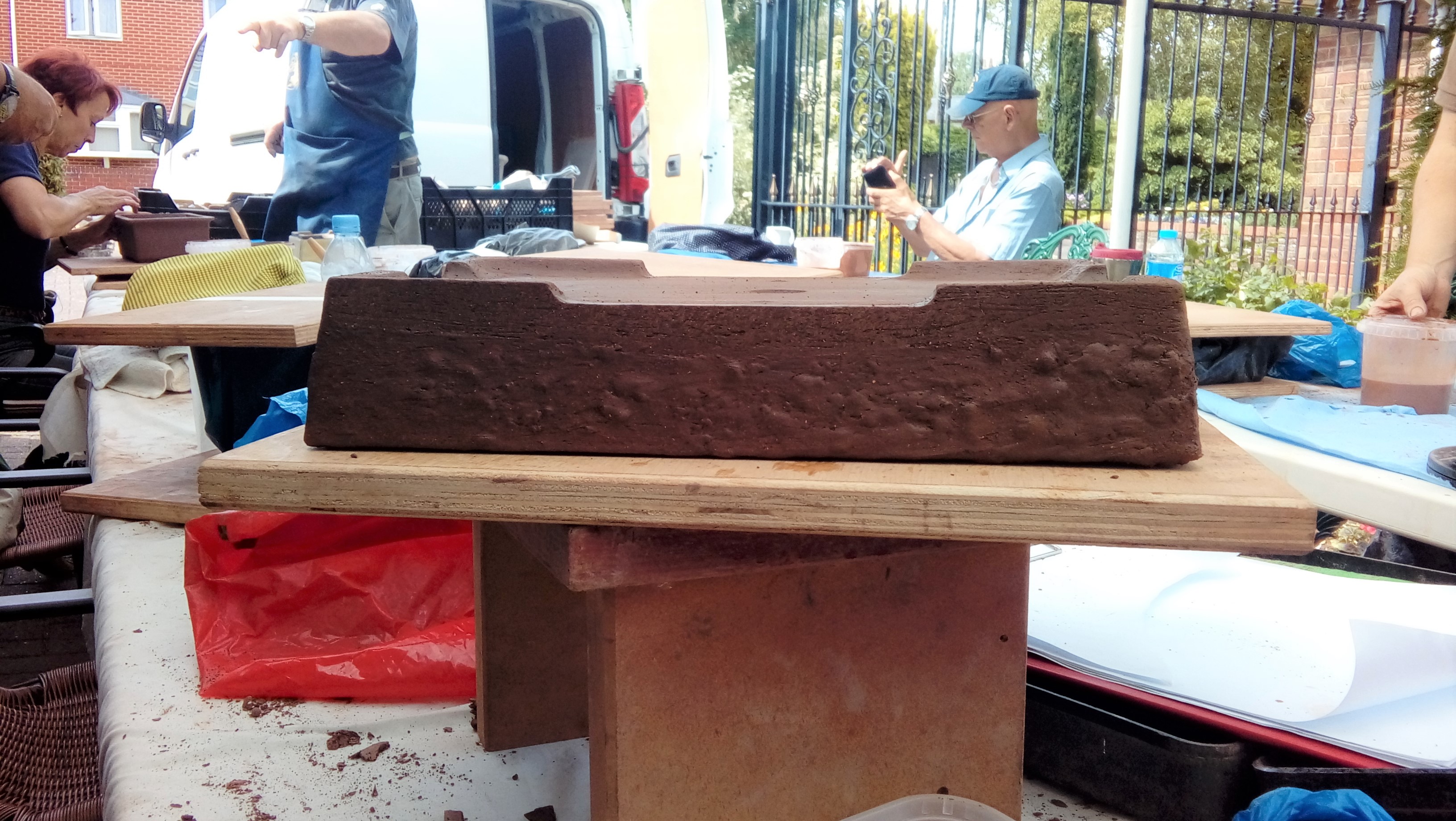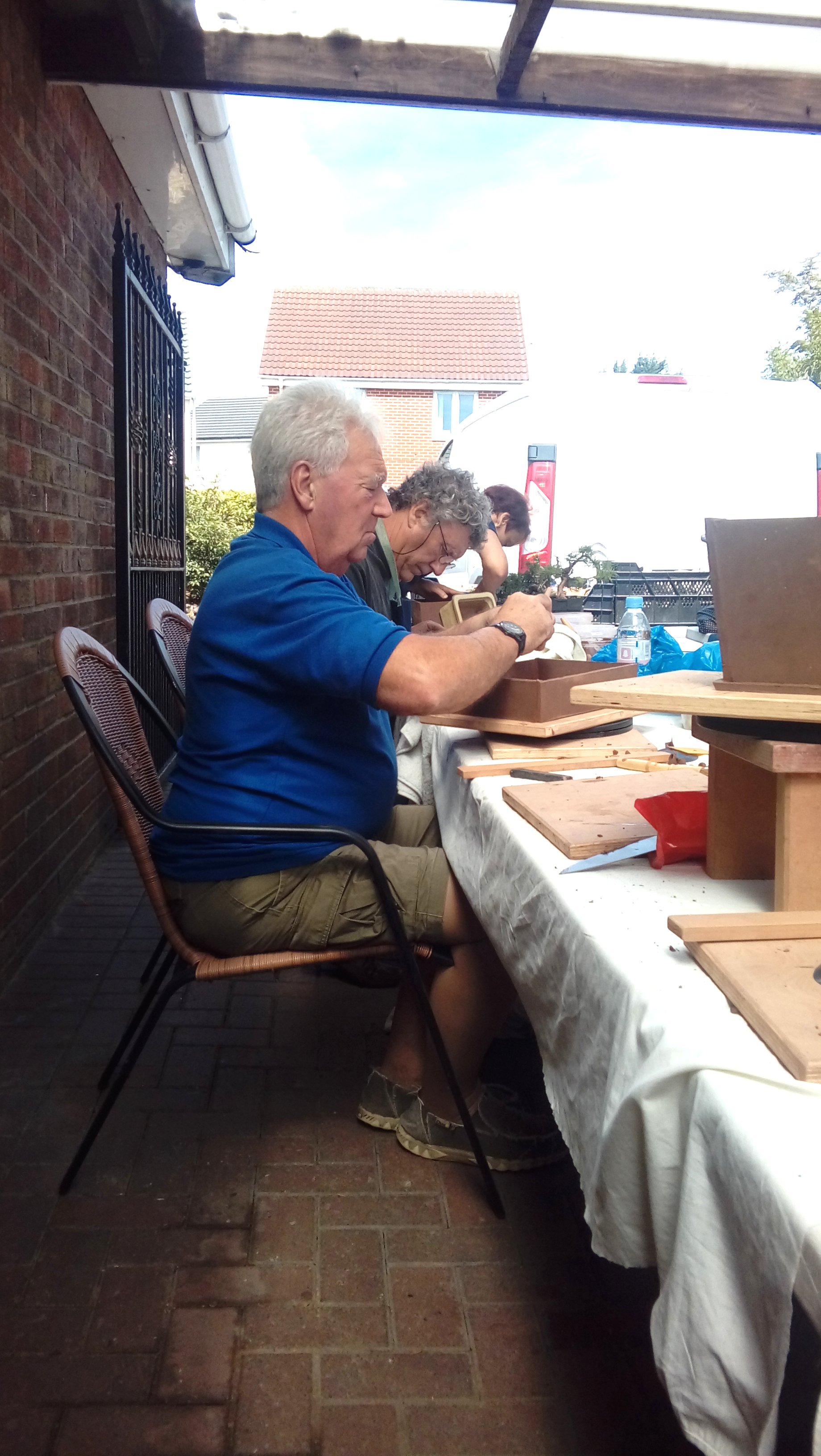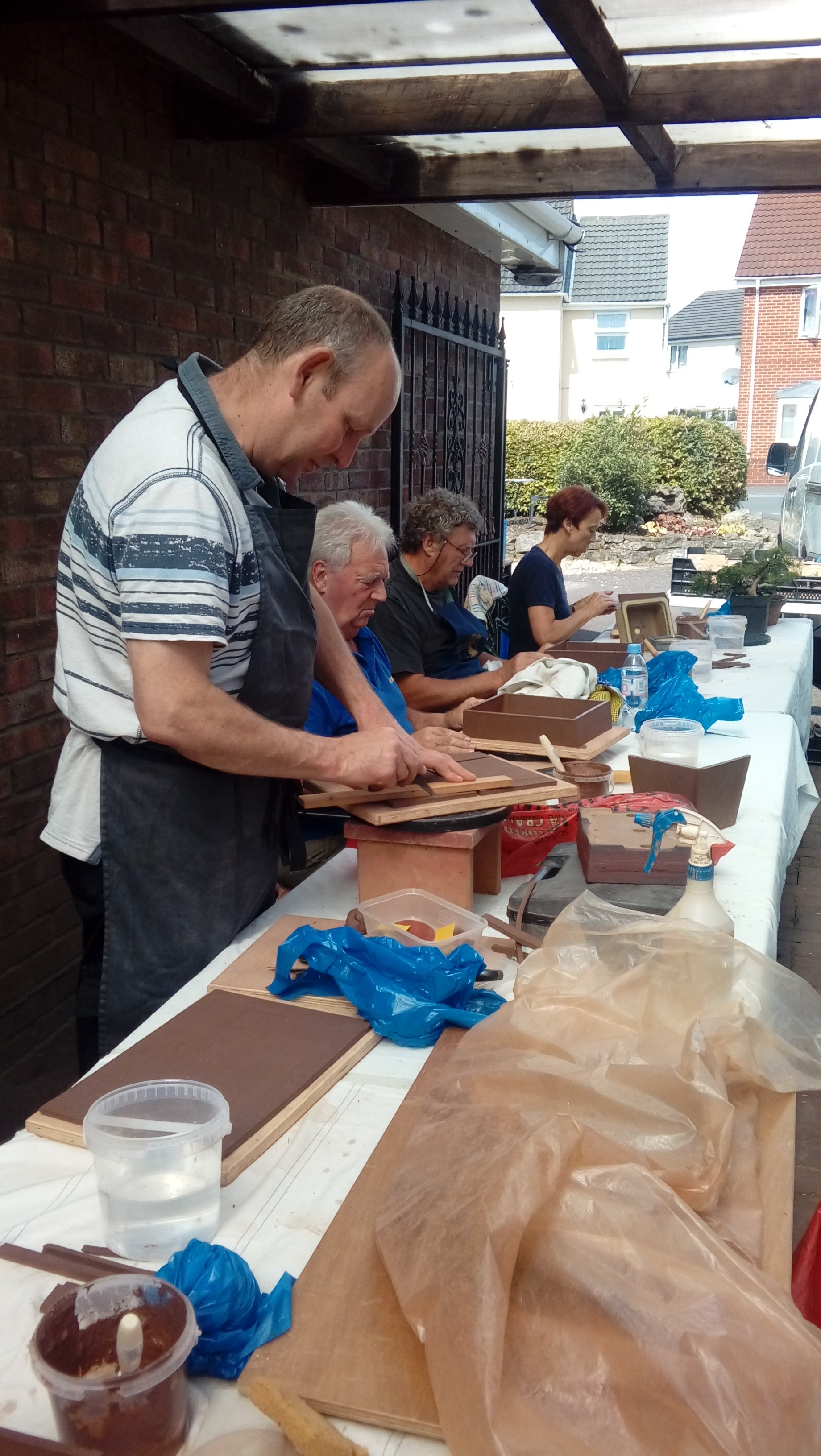 Again we were joined by David Jones and his helper for the day, Charlotte Walby for an all day pottery workshop. It was a lovely warm day, in fact too warm which meant that everyone had to work faster in their pot making before the clay became too dry. The pots in the end looked great with some additions added by the owners to embellish them. It was difficult to photograph all the pots before David had wrapped them up for the return journey to Walsall Towers, where he will check them over, sort out any things that need doing and then he has the task of glazing them and firing them. I am not sure how Paul managed to do his with the shades on, maybe he does a better job with his eyes closed????
