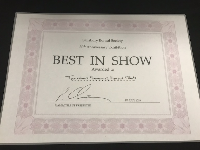 Congratulations to Ken Hayward, Grahame Alexander, Lesley Alexander, Rita Molland and Valerie Casey plus Malcolm Drifield, Clive Knight, Geoff Hobson, Tony Oswin and all those who made this day possible. Plus a thank you to Paul Baron who took some great photos of the day and these can be viewed on Salisbury Bonsai Societies website.
