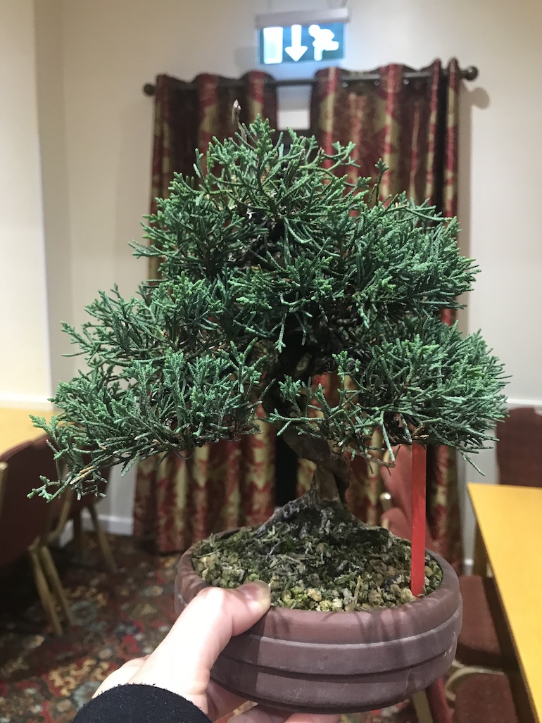 Junipers are a hardy species, so need limited winter care but if you leave outside place them under a tarpaulin to control watering if it is a wet winter. They sometimes will have a bronze foliage which is natural in winter but if you are showing then protect from frost so they remain a dark green colour to their foliage.