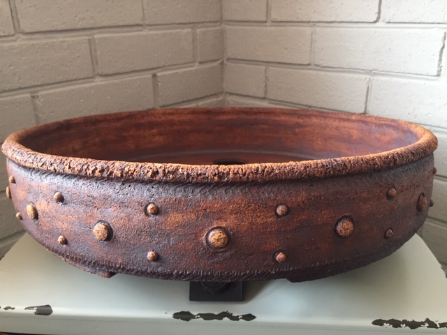 Experiments with clay will sometimes bring surprises. The unexpected new colours or textures can lead to inspiration. A finish that looks red metallic has inspired me to create pots with an industrial feel to them.
